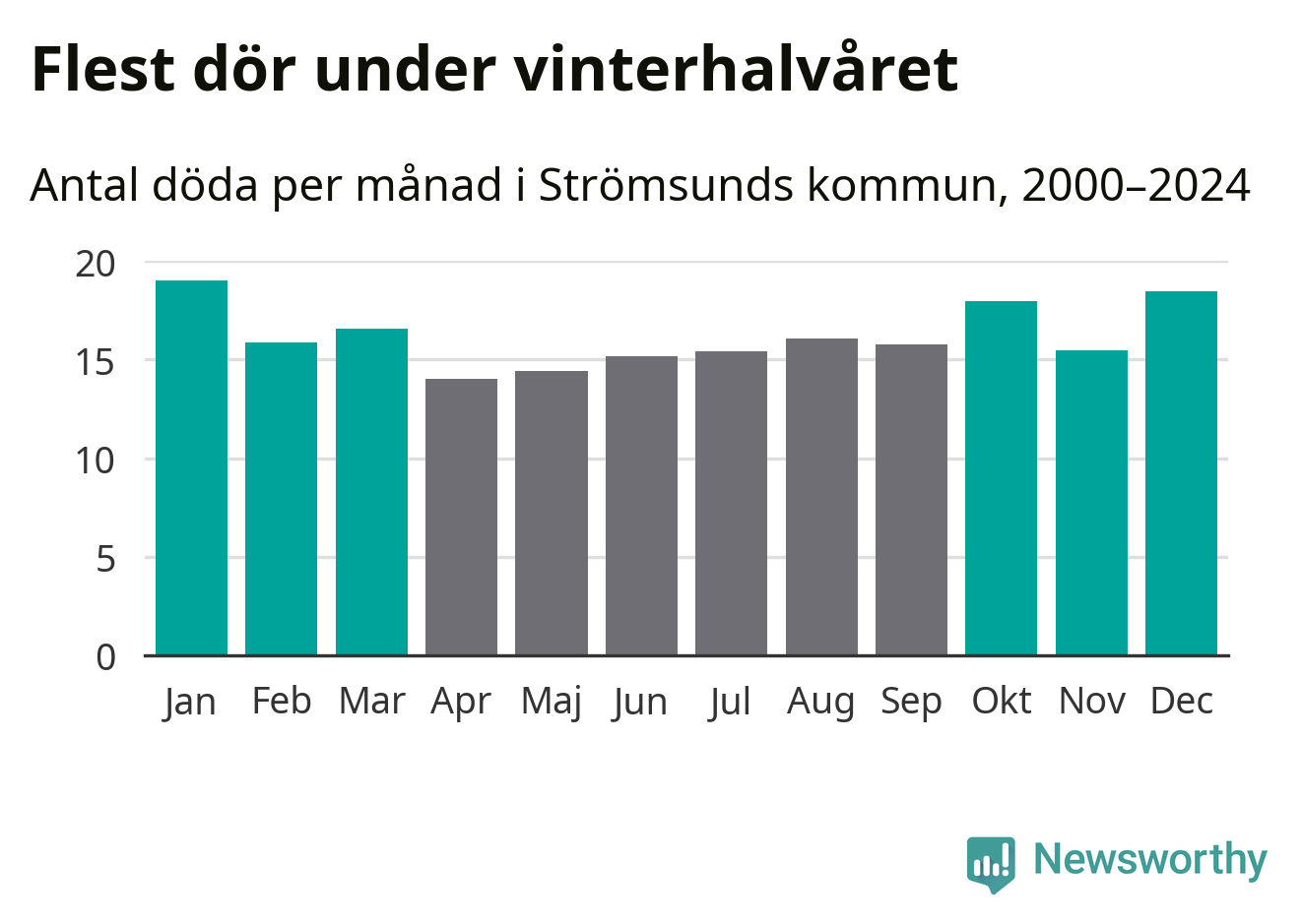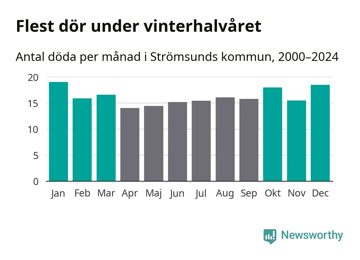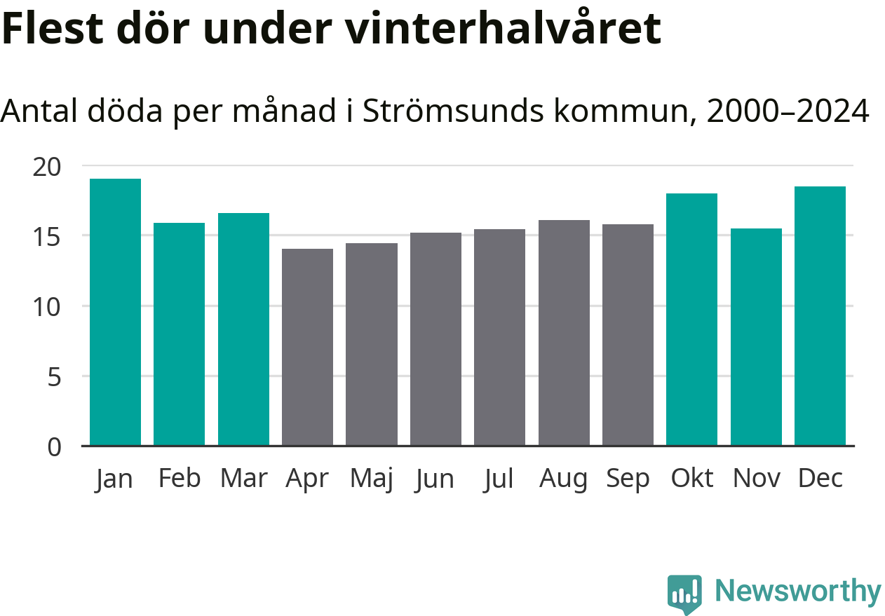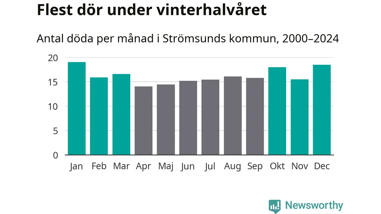 Så är det även i Strömsund. Under de senaste 25 åren har 2 464 personer dött i kommunen under vinterhalvåret, jämfört med 2 355 personer under sommarhalvåret – alltså fem procent fler.