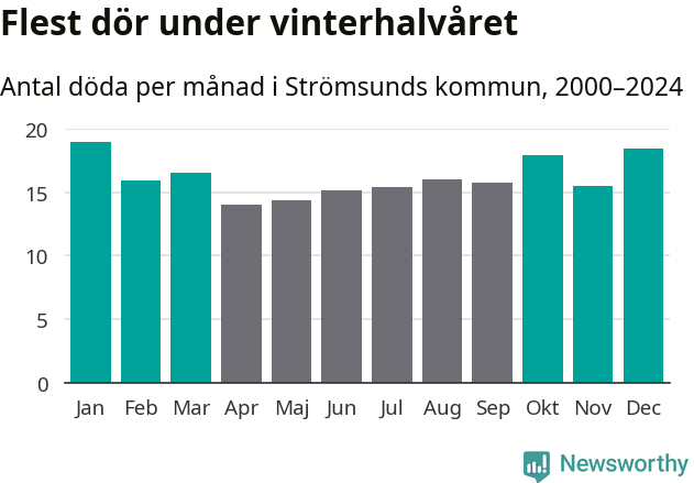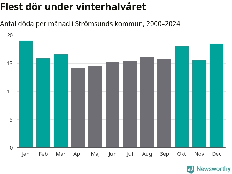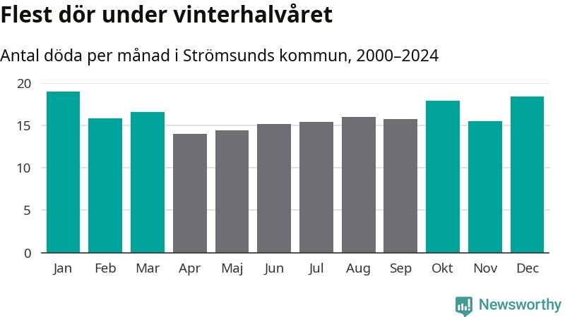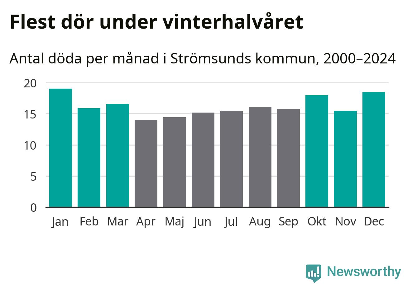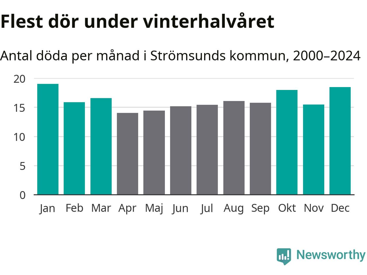 Så är det även i Strömsund. Under de senaste 25 åren har 2 464 personer dött i kommunen under vinterhalvåret, jämfört med 2 355 personer under sommarhalvåret – alltså fem procent fler.