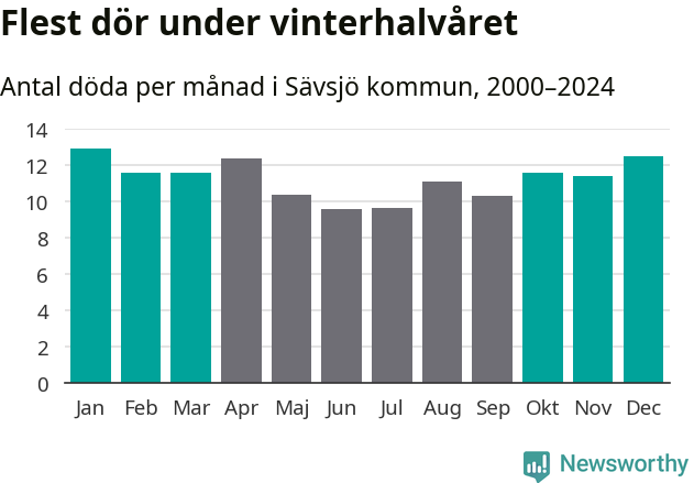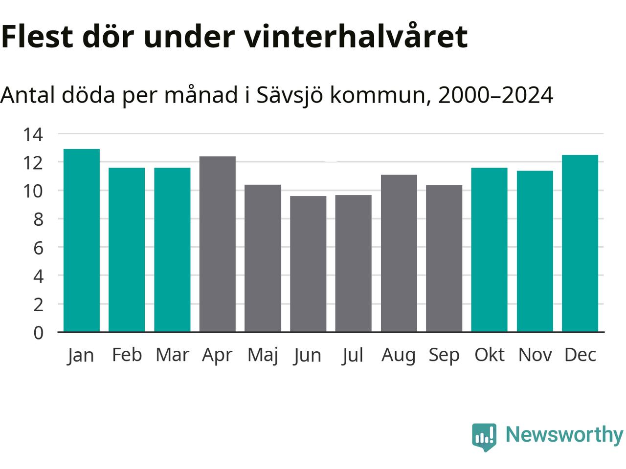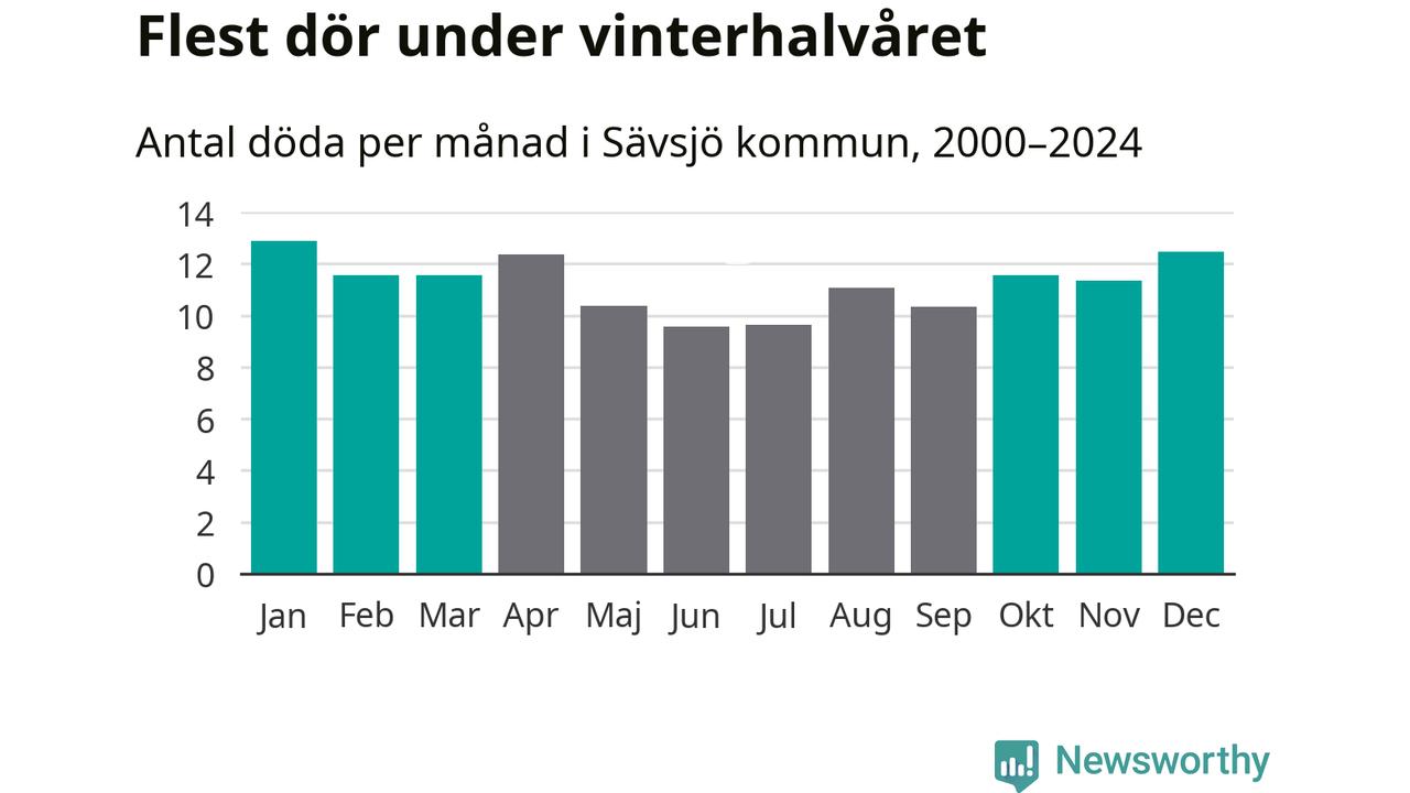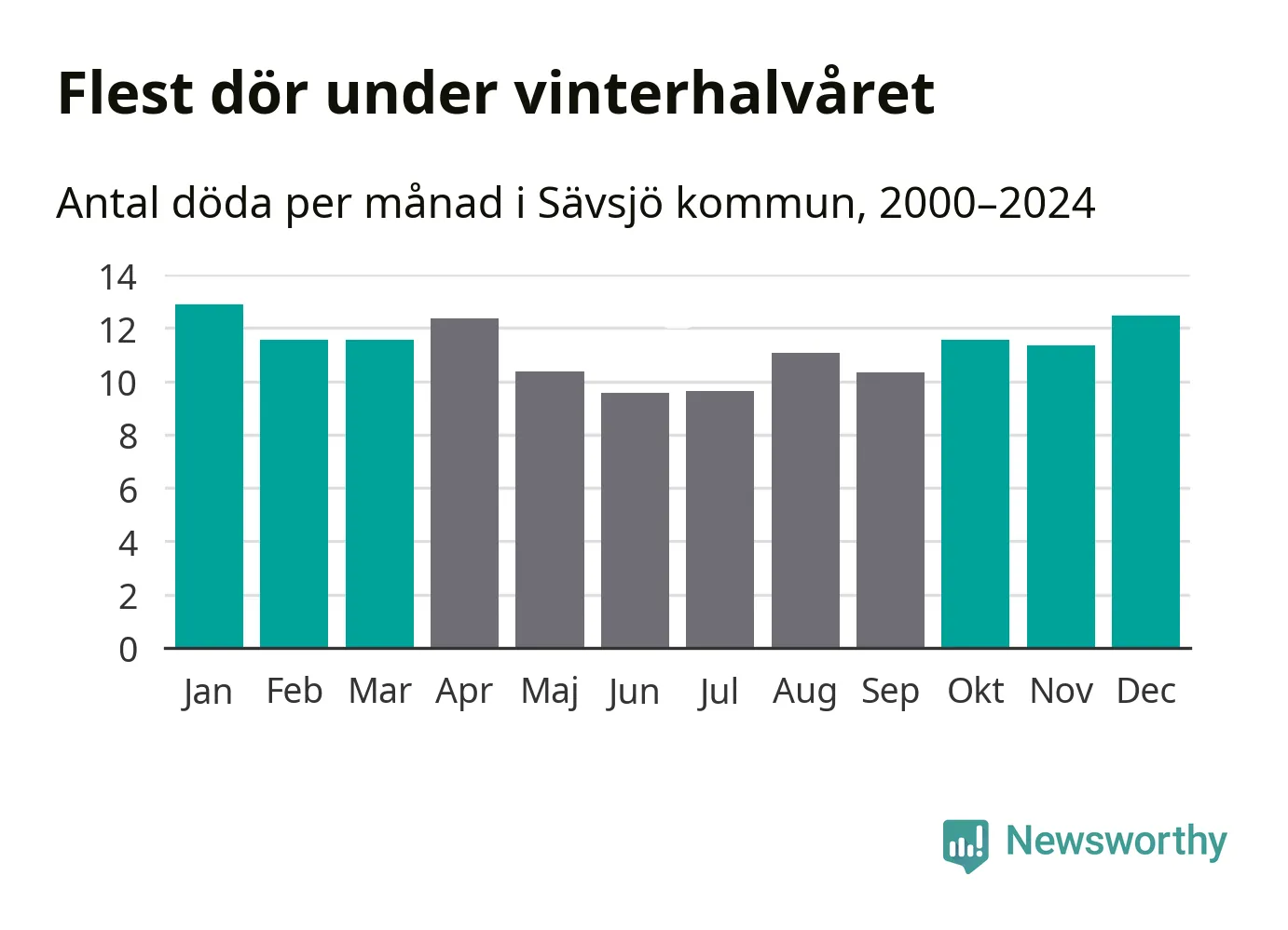 I landet som helhet är det veckorna kring årsskiftet som är de allra dödligaste. I Sävsjö har flest istället dött vecka 48. Sammanlagt under de senaste 25 åren handlar det om 87 personer, vilket är 35 procent fler än snittet för resten av året.