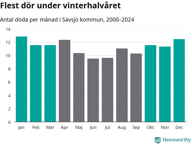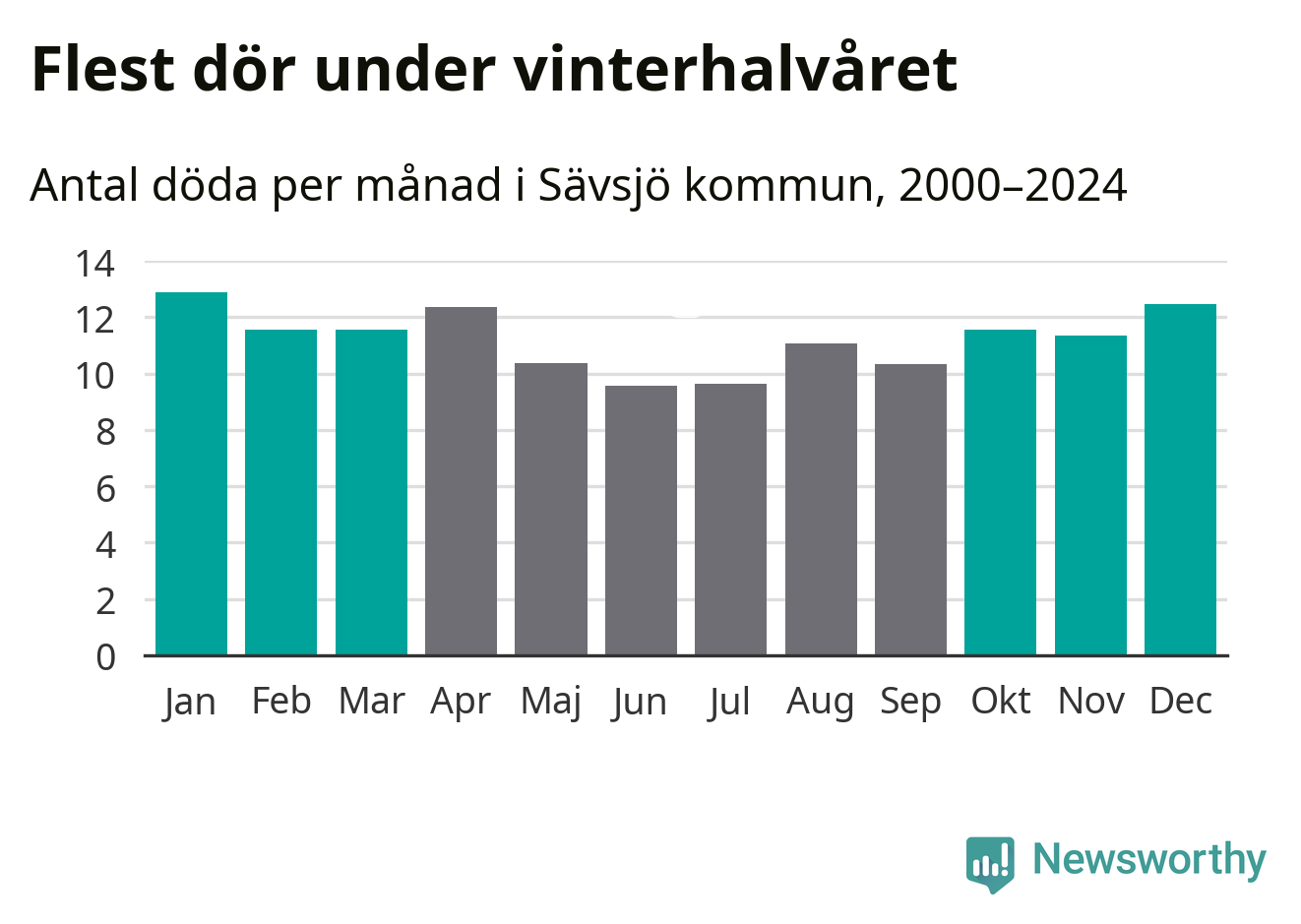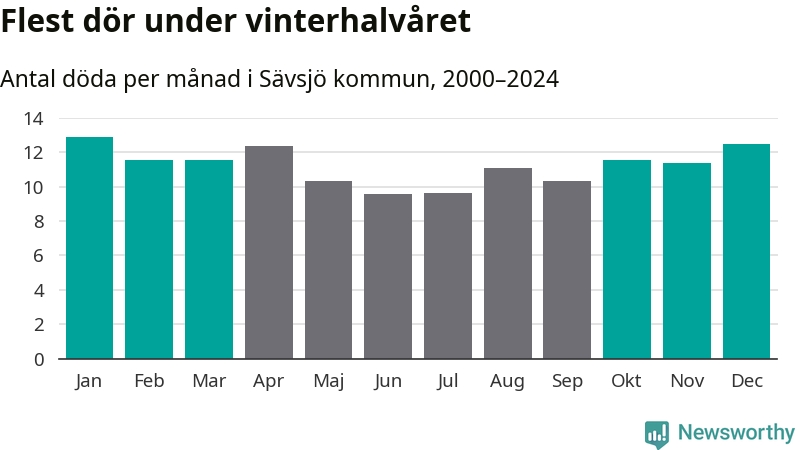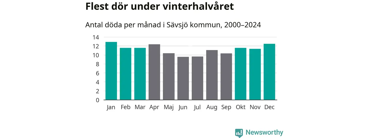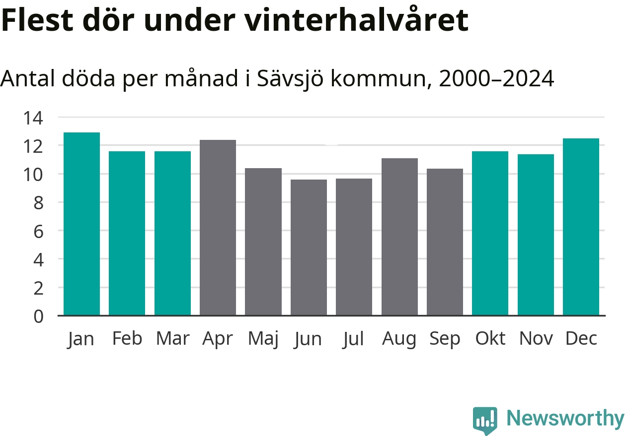 I landet som helhet är det veckorna kring årsskiftet som är de allra dödligaste. I Sävsjö har flest istället dött vecka 48. Sammanlagt under de senaste 25 åren handlar det om 87 personer, vilket är 35 procent fler än snittet för resten av året.