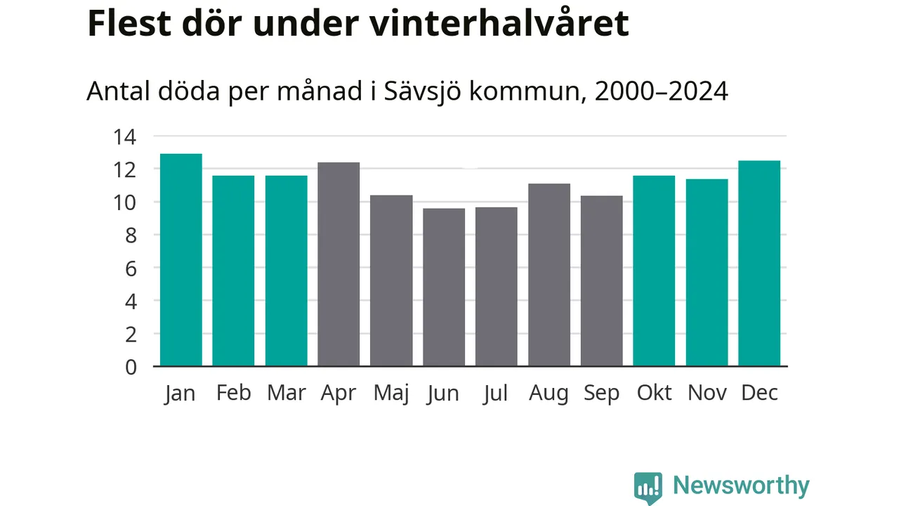 Så är det även i Sävsjö. Under de senaste 25 åren har 1 788 personer dött i kommunen under vinterhalvåret, jämfört med 1 559 personer under sommarhalvåret – alltså 15 procent fler.