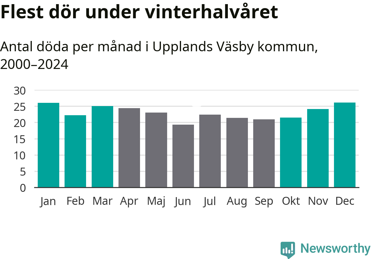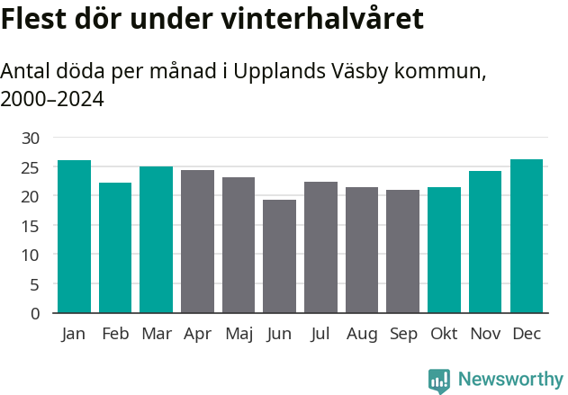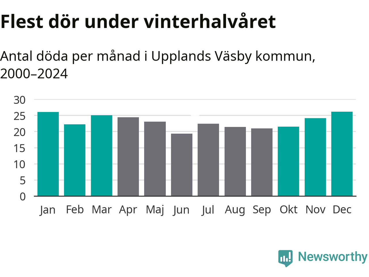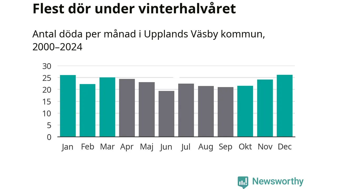 Så är det även i Upplands Väsby. Under de senaste 25 åren har 3 651 personer dött i kommunen under vinterhalvåret, jämfört med 3 177 personer under sommarhalvåret – alltså 15 procent fler.