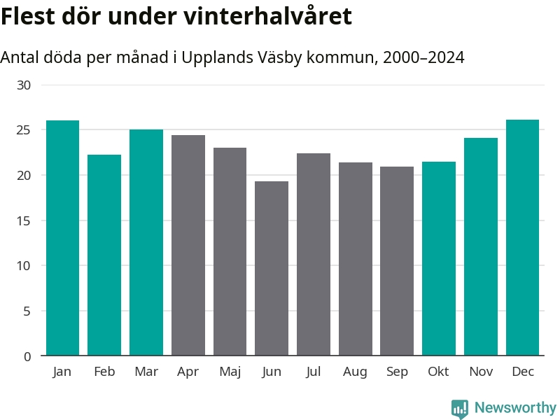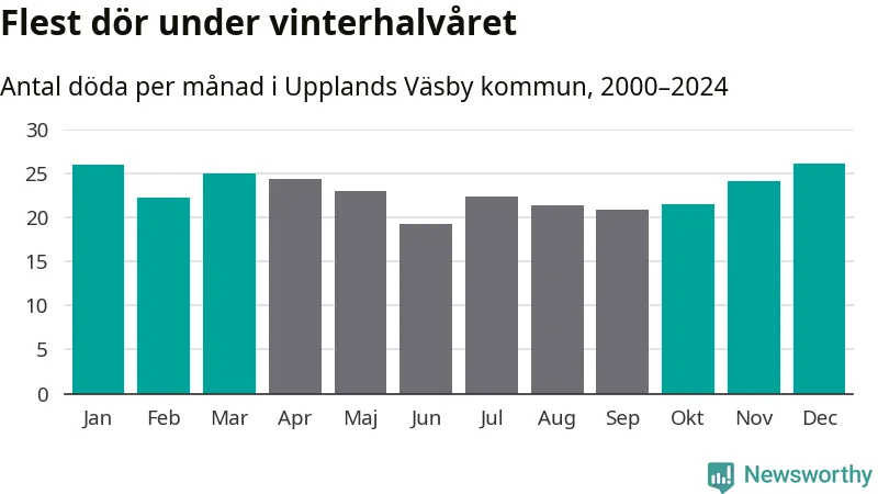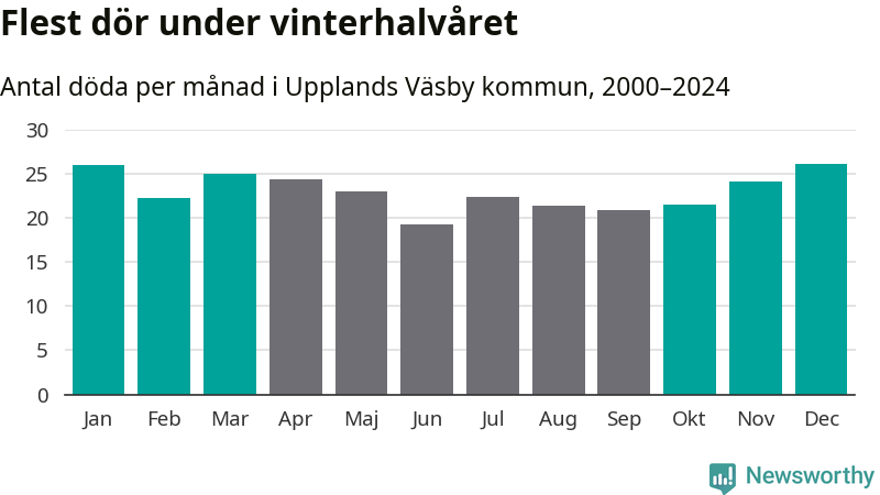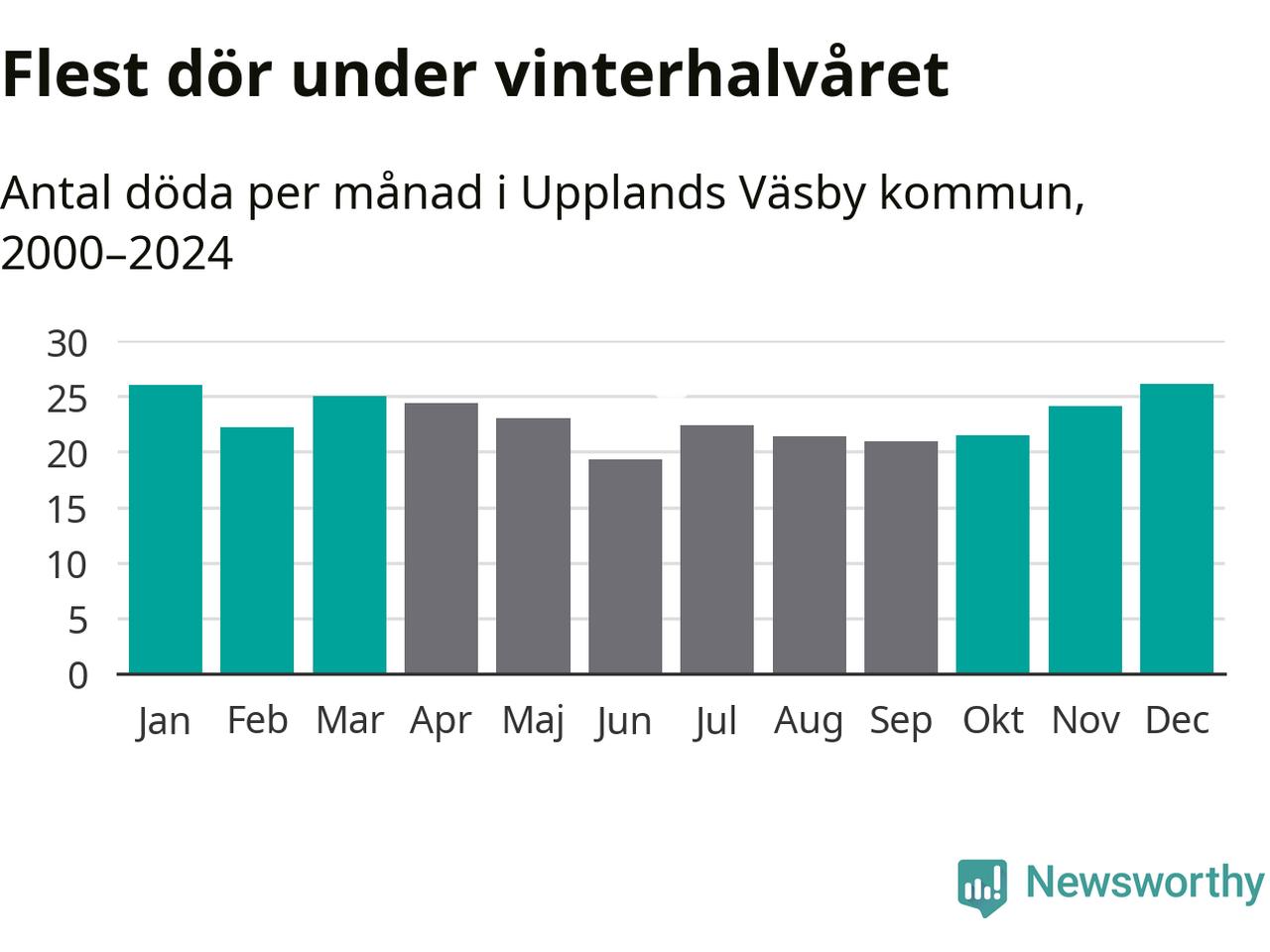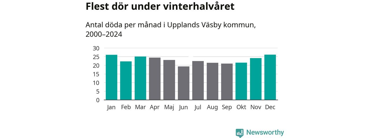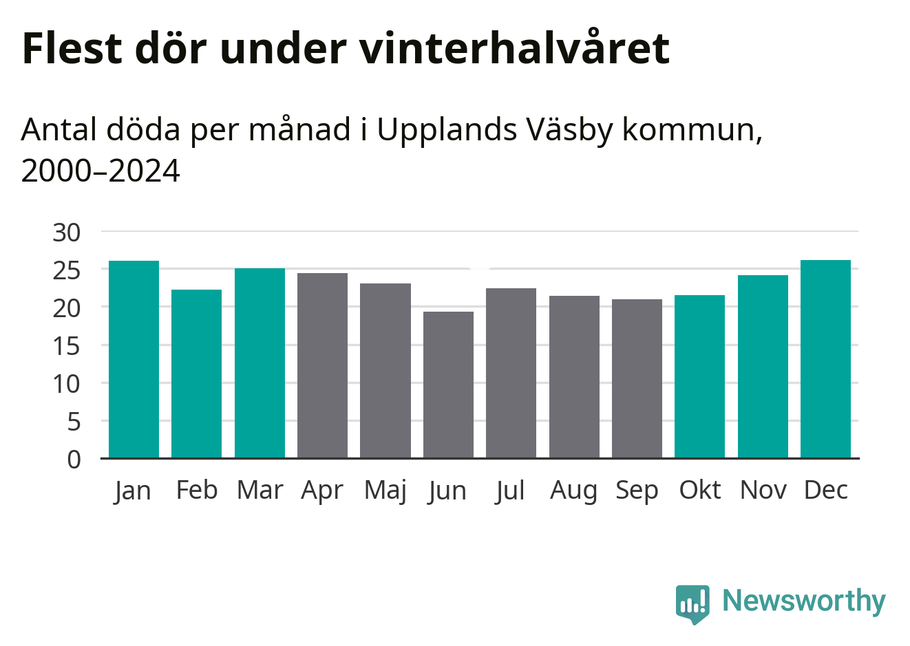 Så är det även i Upplands Väsby. Under de senaste 25 åren har 3 651 personer dött i kommunen under vinterhalvåret, jämfört med 3 177 personer under sommarhalvåret – alltså 15 procent fler.
