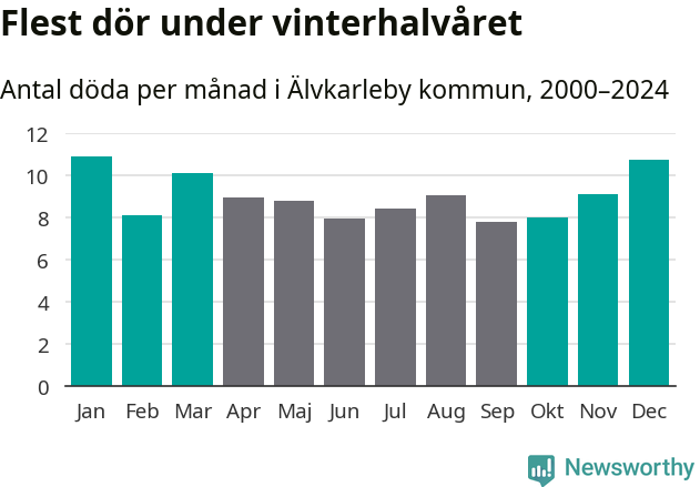 Så är det även i Älvkarleby. Under de senaste 25 åren har 1 430 personer dött i kommunen under vinterhalvåret, jämfört med 1 229 personer under sommarhalvåret – alltså 16 procent fler.