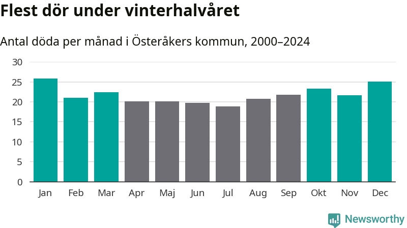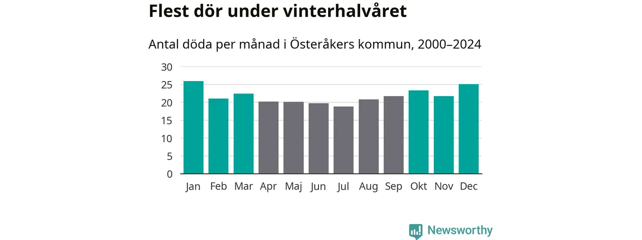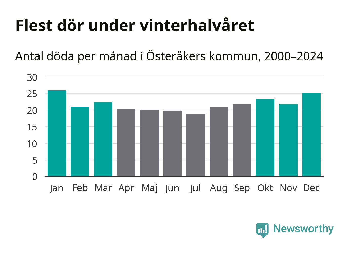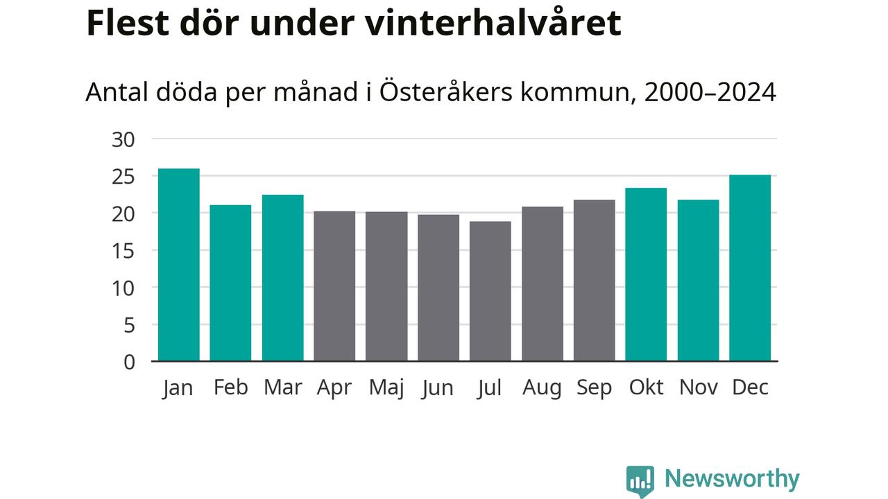 Så är det även i Österåker. Under de senaste 25 åren har 3 355 personer dött i kommunen under vinterhalvåret, jämfört med 3 101 personer under sommarhalvåret – alltså åtta procent fler.