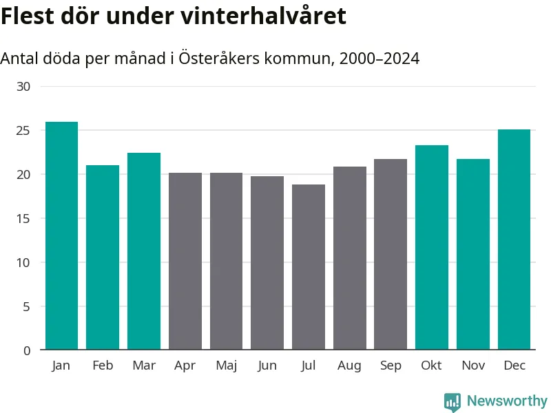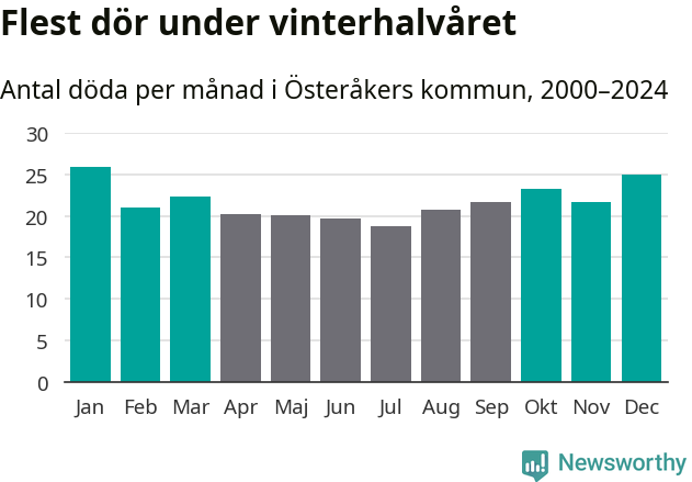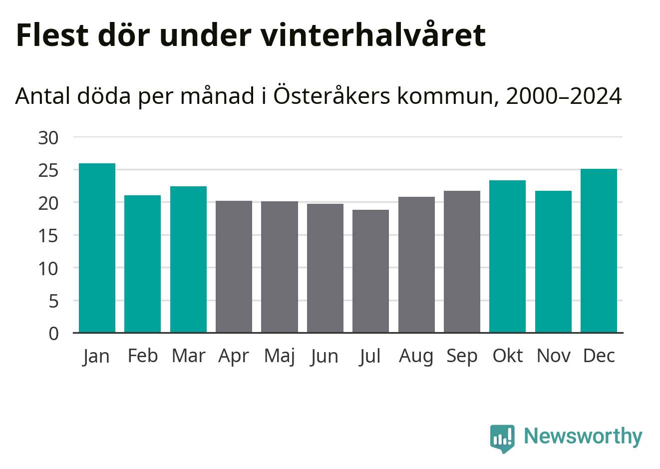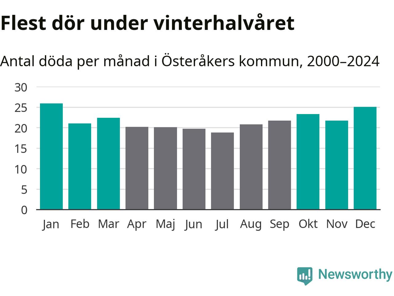 Så är det även i Österåker. Under de senaste 25 åren har 3 355 personer dött i kommunen under vinterhalvåret, jämfört med 3 101 personer under sommarhalvåret – alltså åtta procent fler.