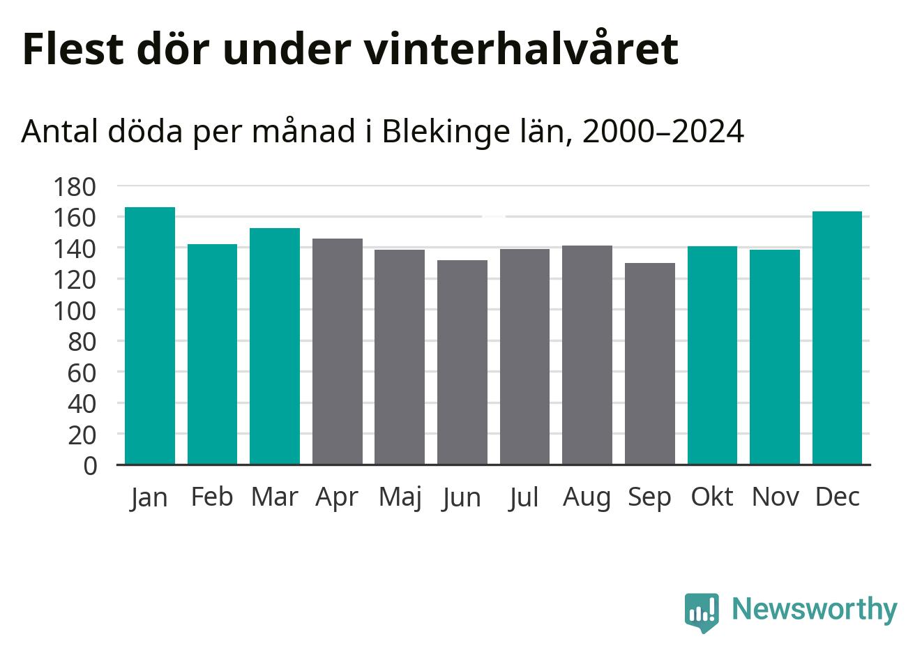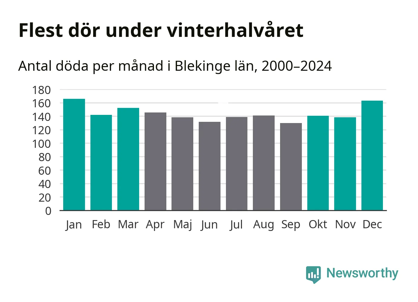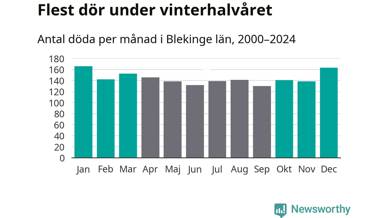 Så är det även i Blekinge. Under de senaste 25 åren har 22 303 personer dött i länet under vinterhalvåret, jämfört med 20 284 personer under sommarhalvåret – alltså tio procent fler.