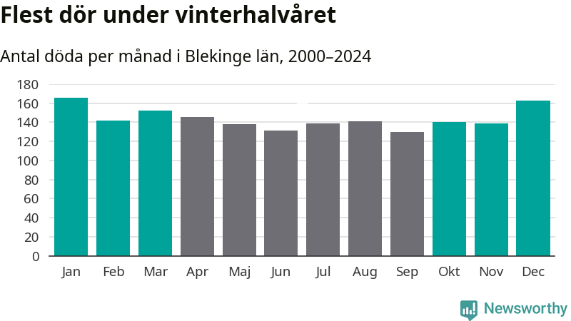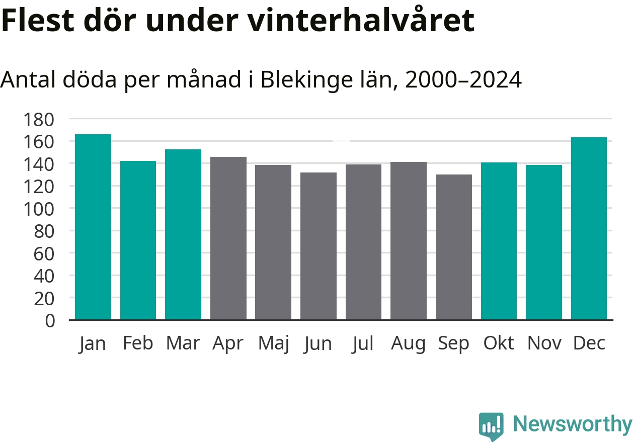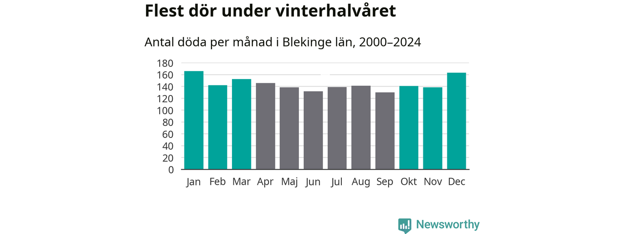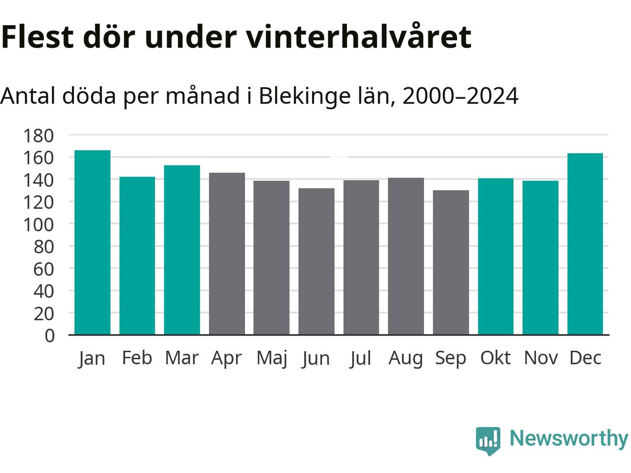 Så är det även i Blekinge. Under de senaste 25 åren har 22 303 personer dött i länet under vinterhalvåret, jämfört med 20 284 personer under sommarhalvåret – alltså tio procent fler.