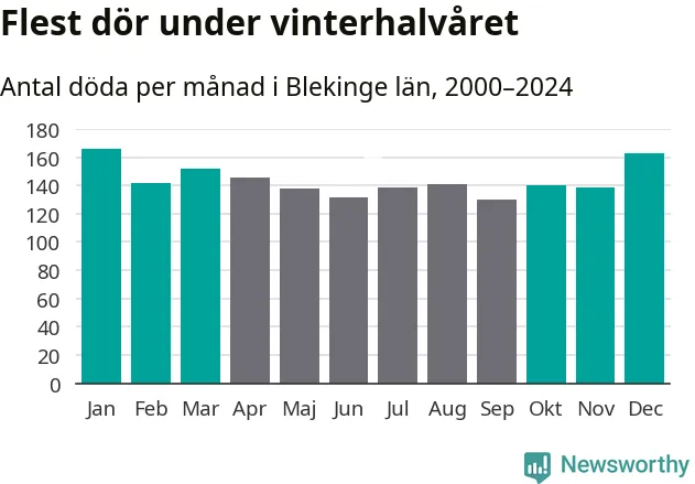I landet som helhet är det veckorna kring årsskiftet som är de allra dödligaste. Så är det även i Blekinge, där den dödligaste perioden infaller under vecka 2, enligt statistik för de senaste 25 åren. Sammanlagt handlar det om 945 personer , vilket är 15 procent fler än snittet för resten av året.
