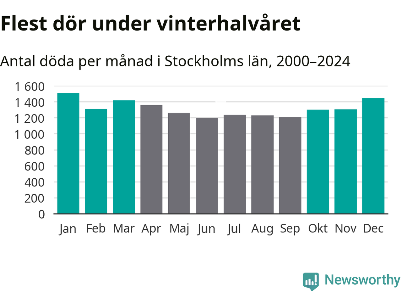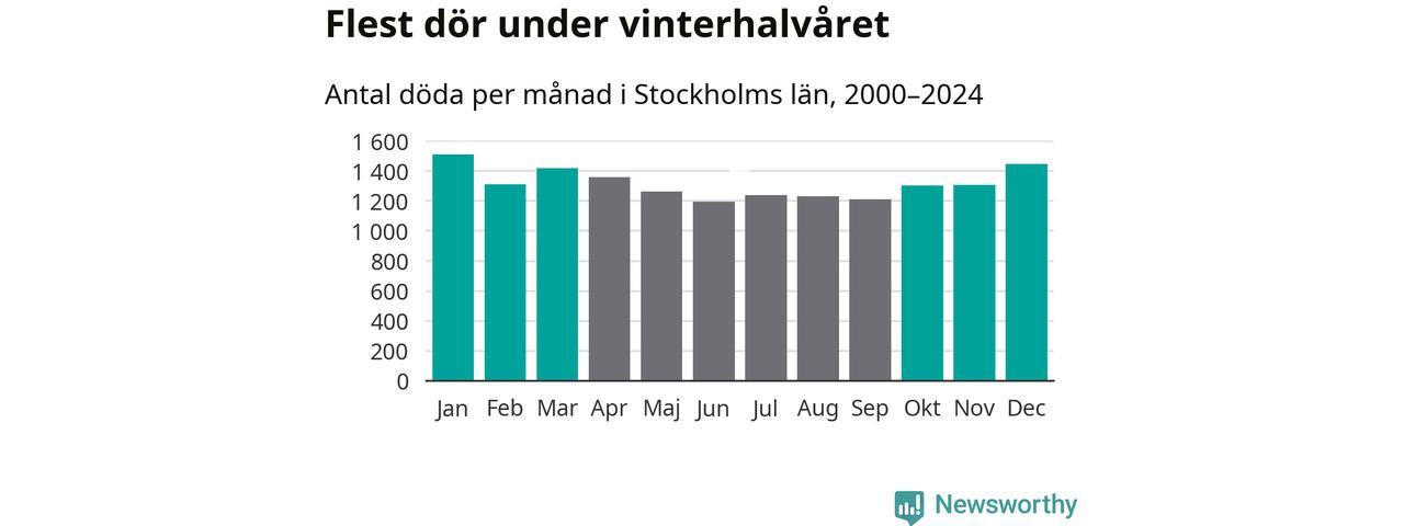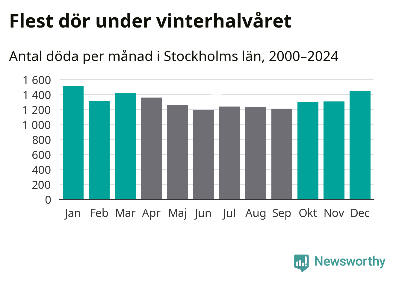 I landet som helhet är det veckorna kring årsskiftet som är de allra dödligaste. Så är det även i Stockholm, där den dödligaste perioden infaller under vecka 2, enligt statistik för de senaste 25 åren. Sammanlagt handlar det om 8 656 personer , vilket är 15 procent fler än snittet för resten av året.