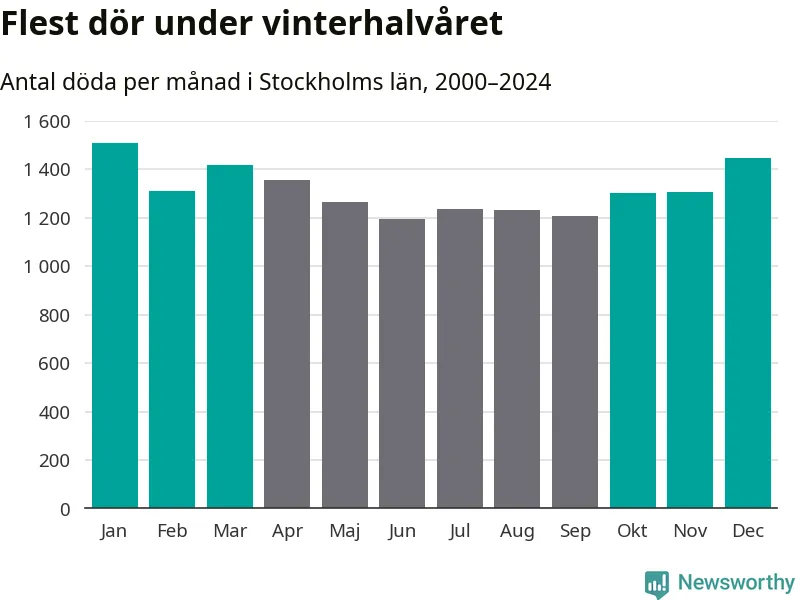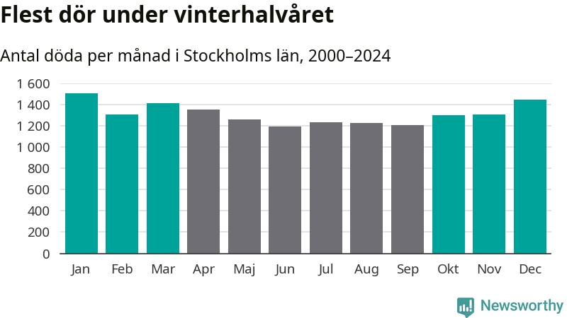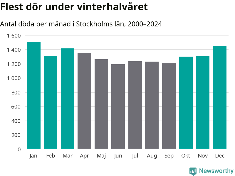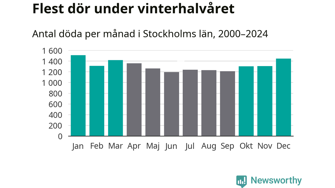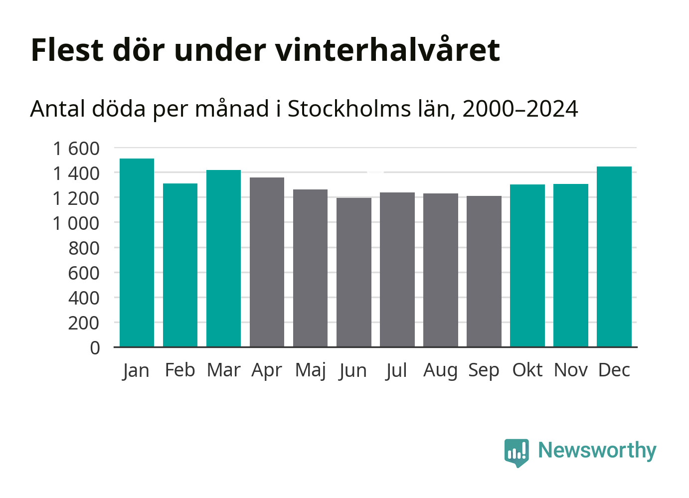 I landet som helhet är det veckorna kring årsskiftet som är de allra dödligaste. Så är det även i Stockholm, där den dödligaste perioden infaller under vecka 2, enligt statistik för de senaste 25 åren. Sammanlagt handlar det om 8 656 personer , vilket är 15 procent fler än snittet för resten av året.