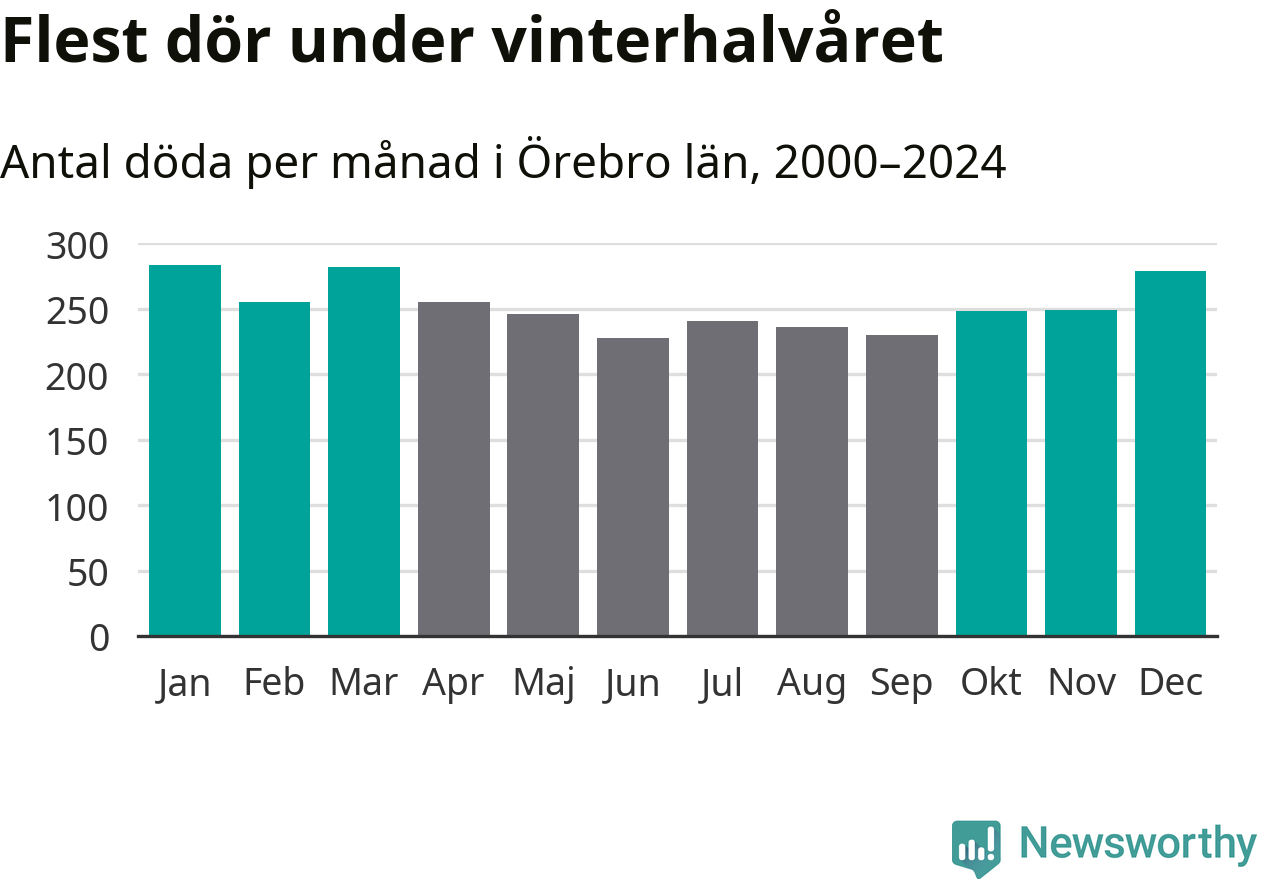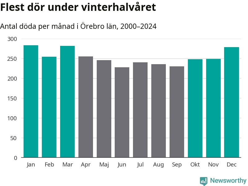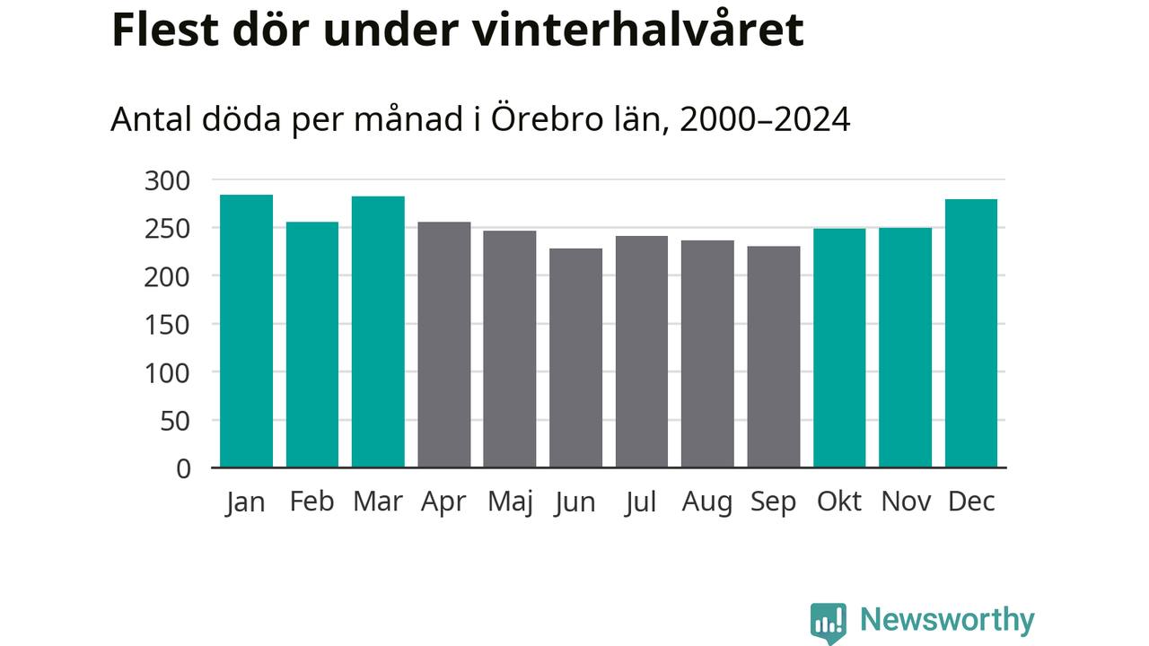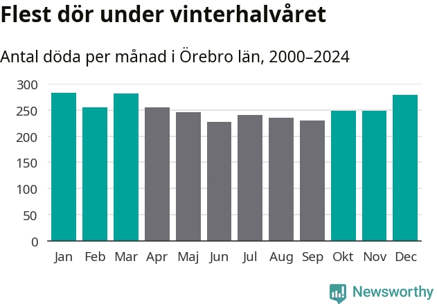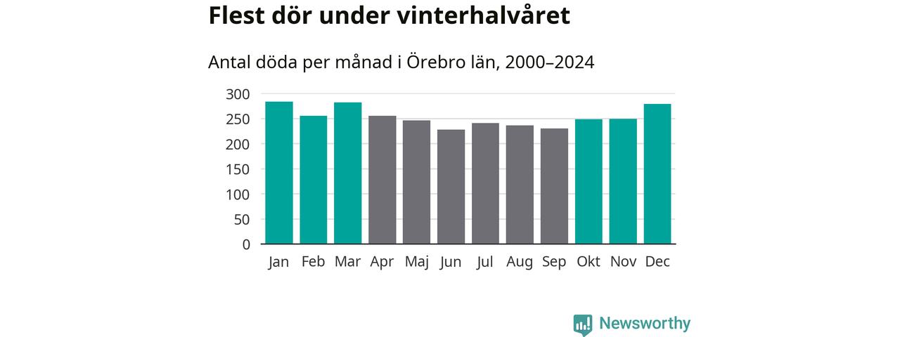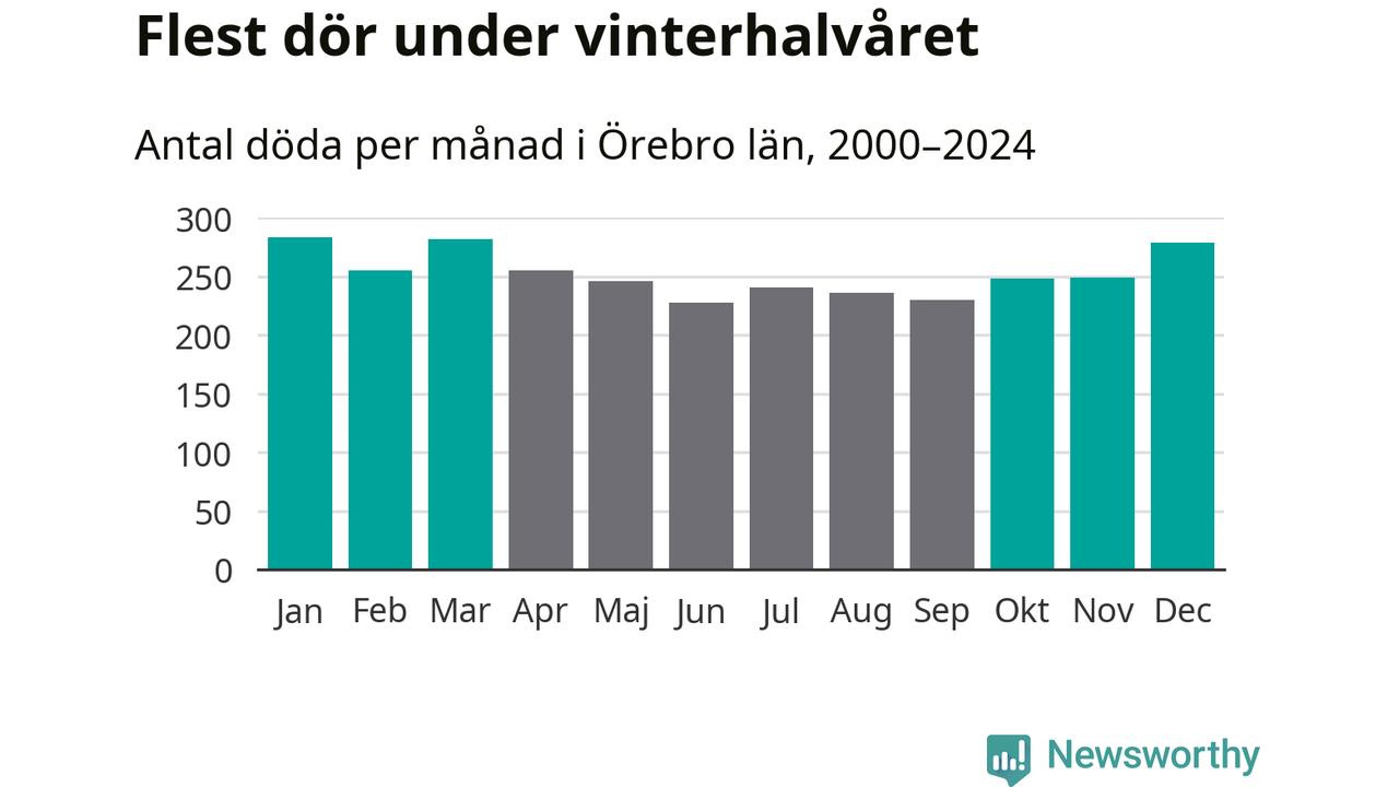 Så är det även i Örebro. Under de senaste 25 åren har 39 450 personer dött i länet under vinterhalvåret, jämfört med 35 334 personer under sommarhalvåret – alltså tolv procent fler.