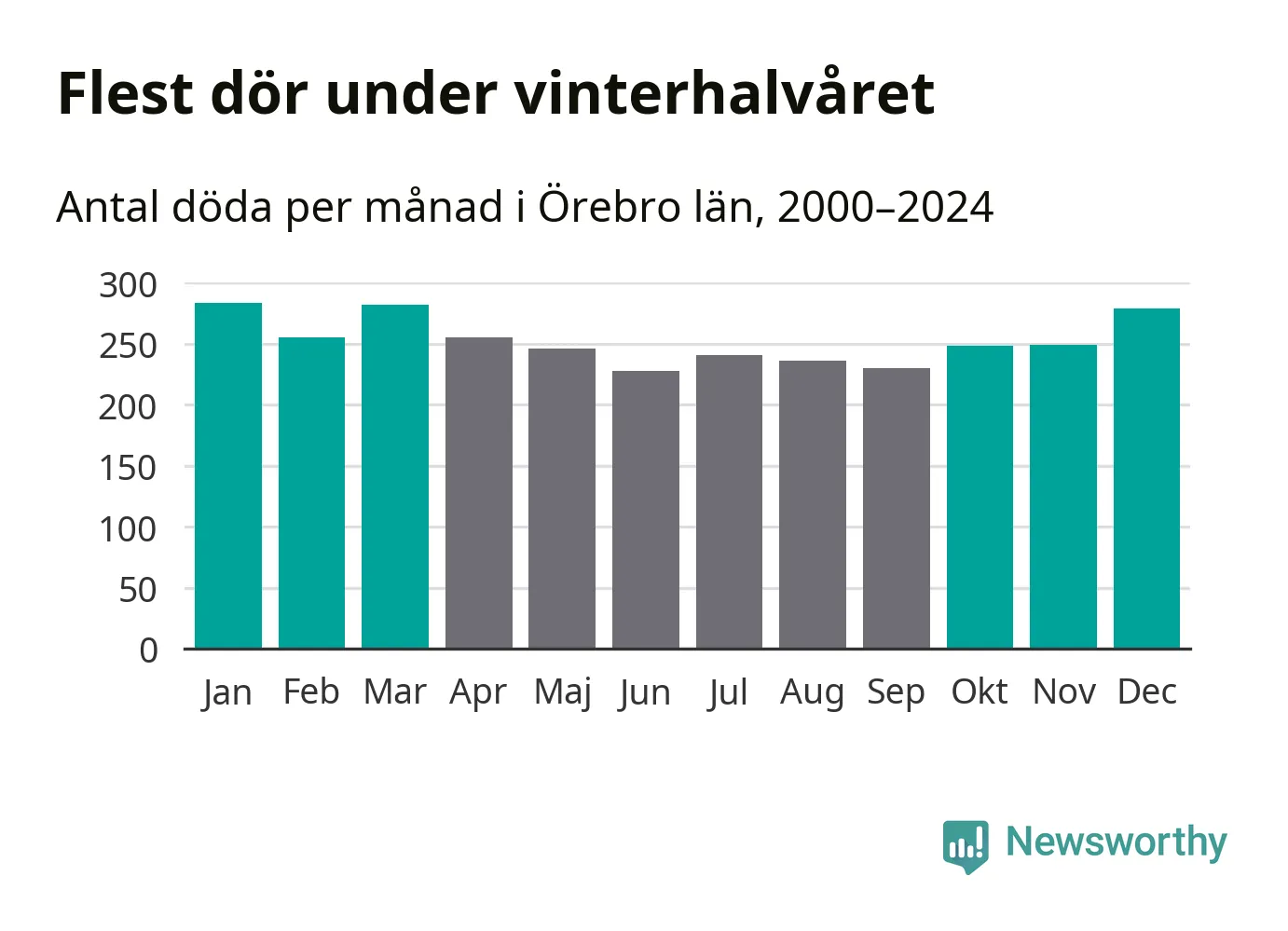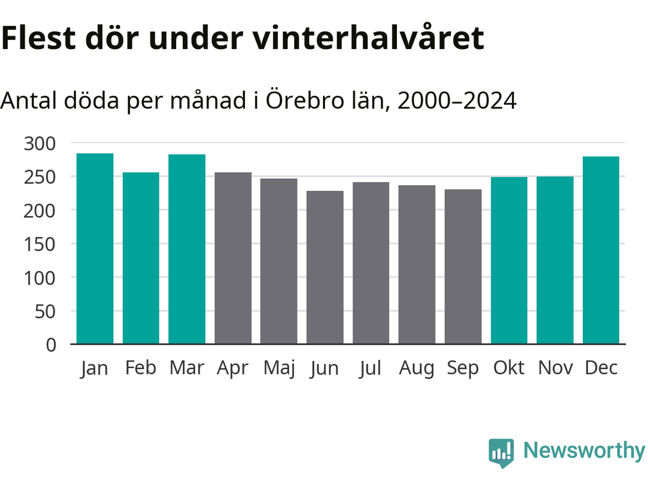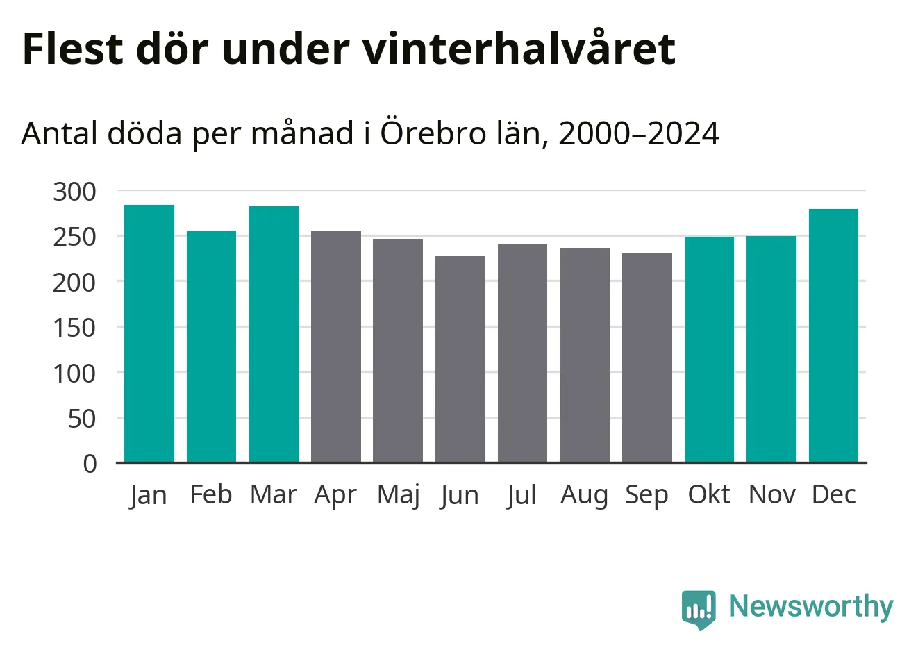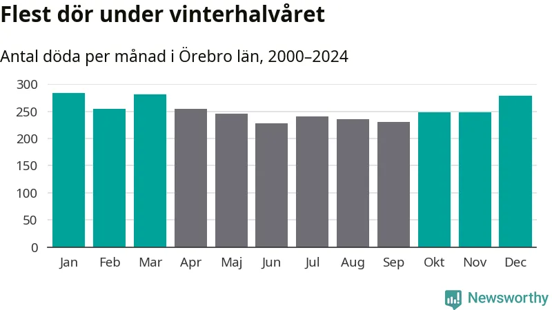 Så är det även i Örebro. Under de senaste 25 åren har 39 450 personer dött i länet under vinterhalvåret, jämfört med 35 334 personer under sommarhalvåret – alltså tolv procent fler.