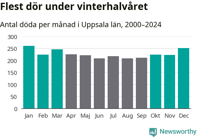 Så är det även i Uppsala. Under de senaste 25 åren har 35 123 personer dött i länet under vinterhalvåret, jämfört med 31 735 personer under sommarhalvåret – alltså elva procent fler.