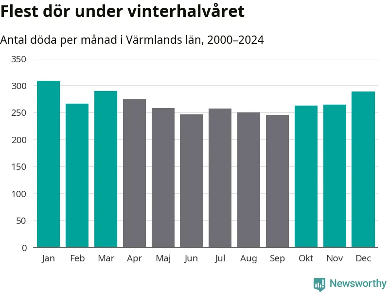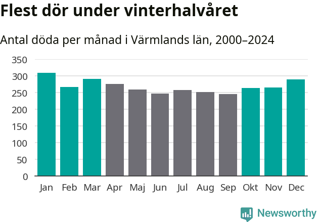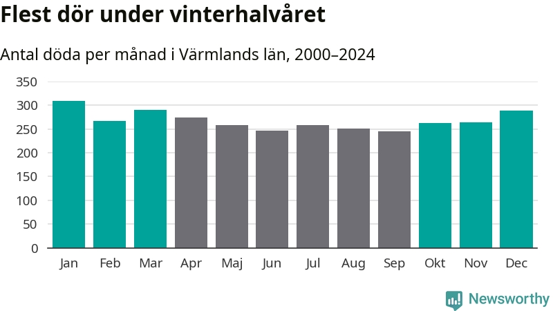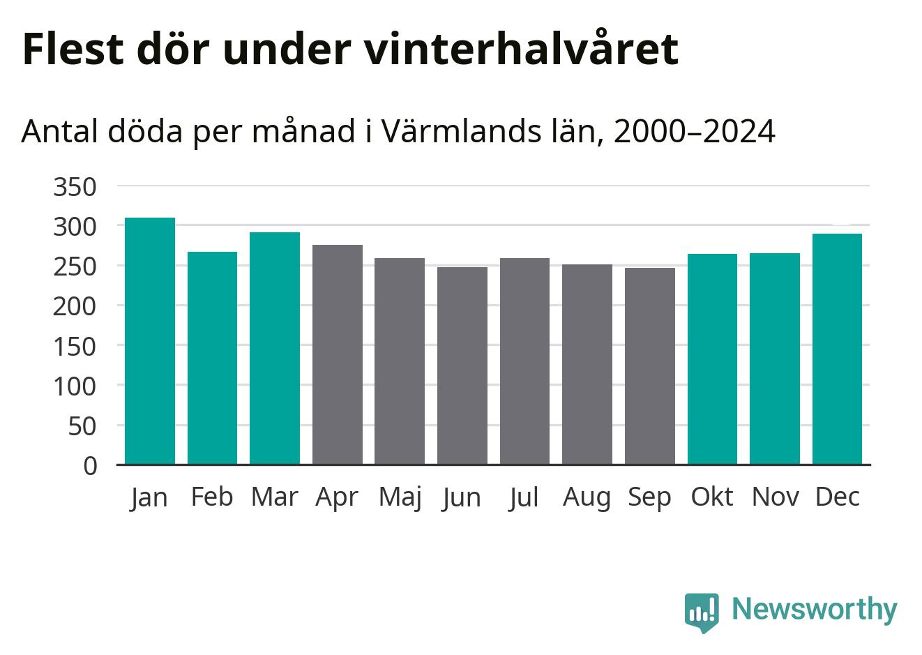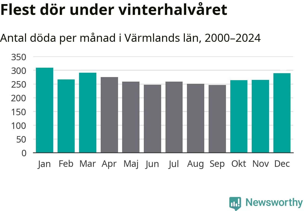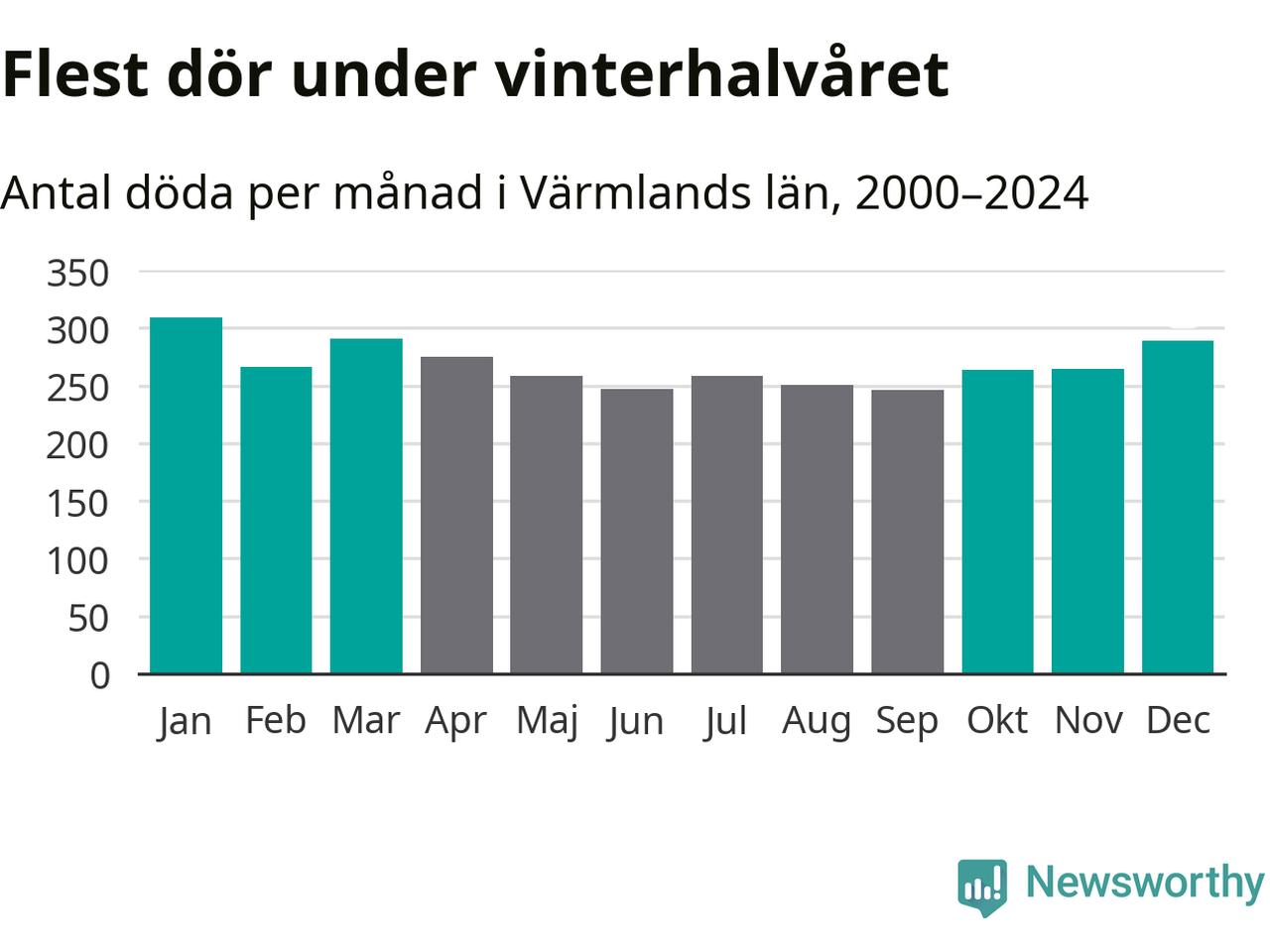 Så är det även i Värmland. Under de senaste 25 åren har 41 683 personer dött i länet under vinterhalvåret, jämfört med 37 683 personer under sommarhalvåret – alltså elva procent fler.