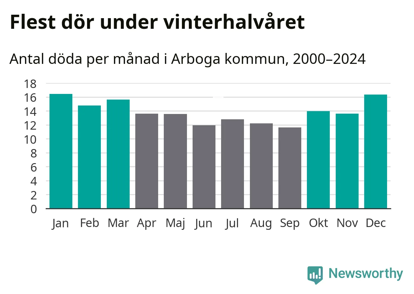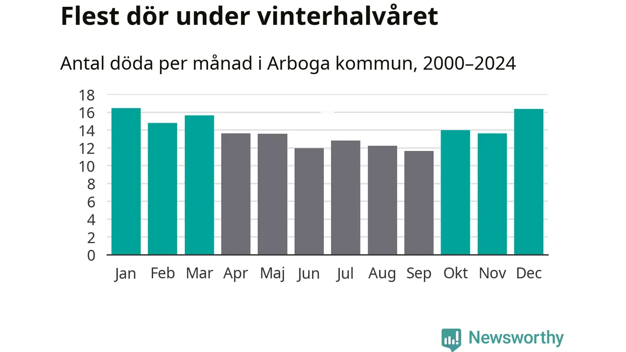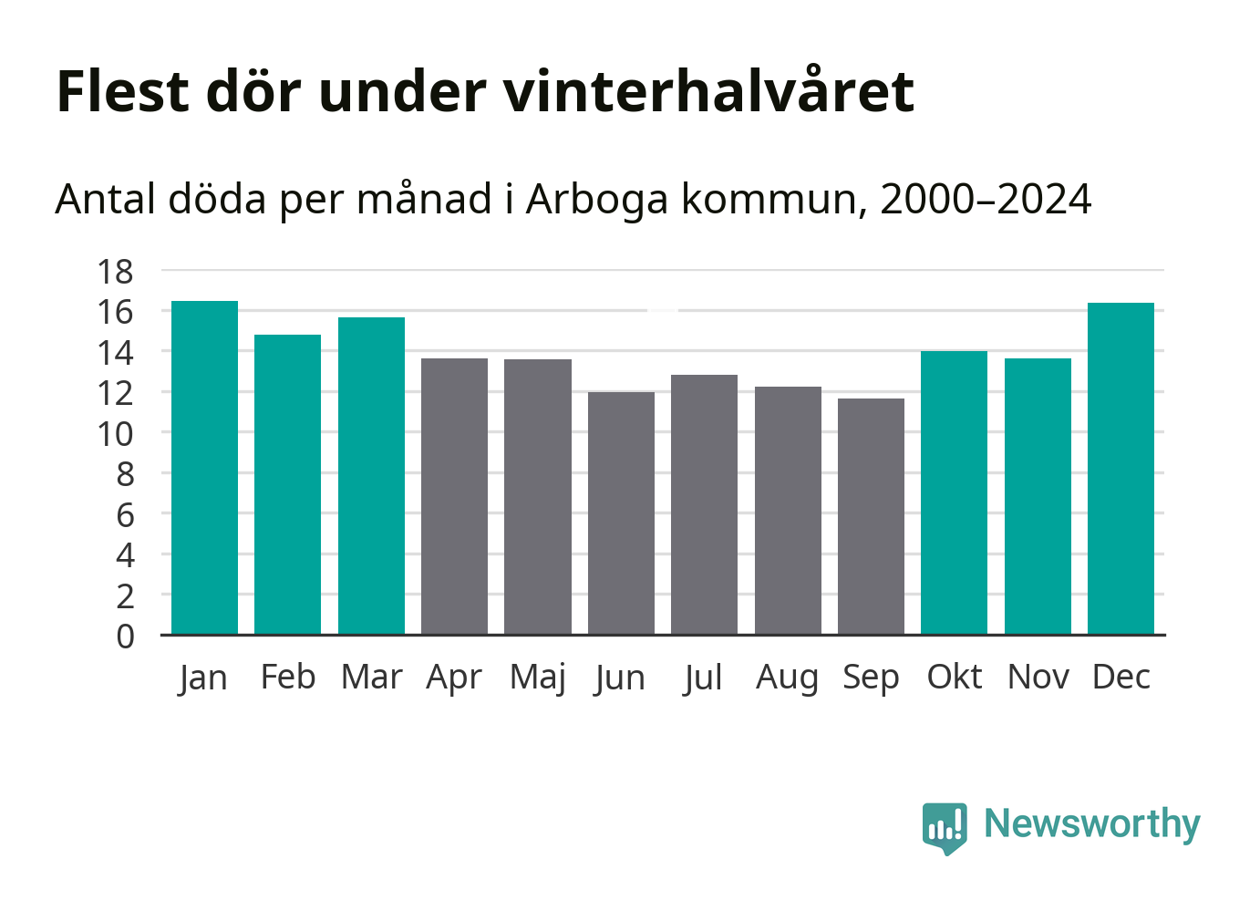 Så är det även i Arboga. Under de senaste 25 åren har 2 196 personer dött i kommunen under vinterhalvåret, jämfört med 1 884 personer under sommarhalvåret – alltså 17 procent fler.