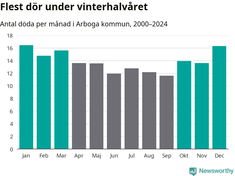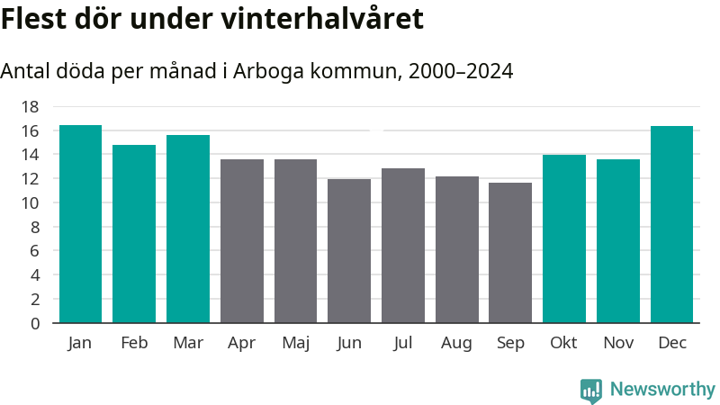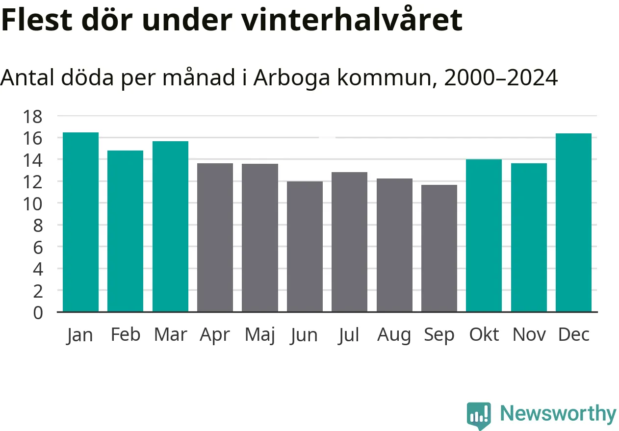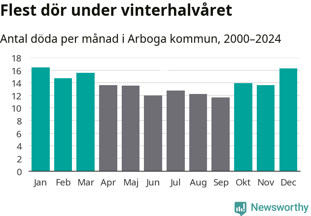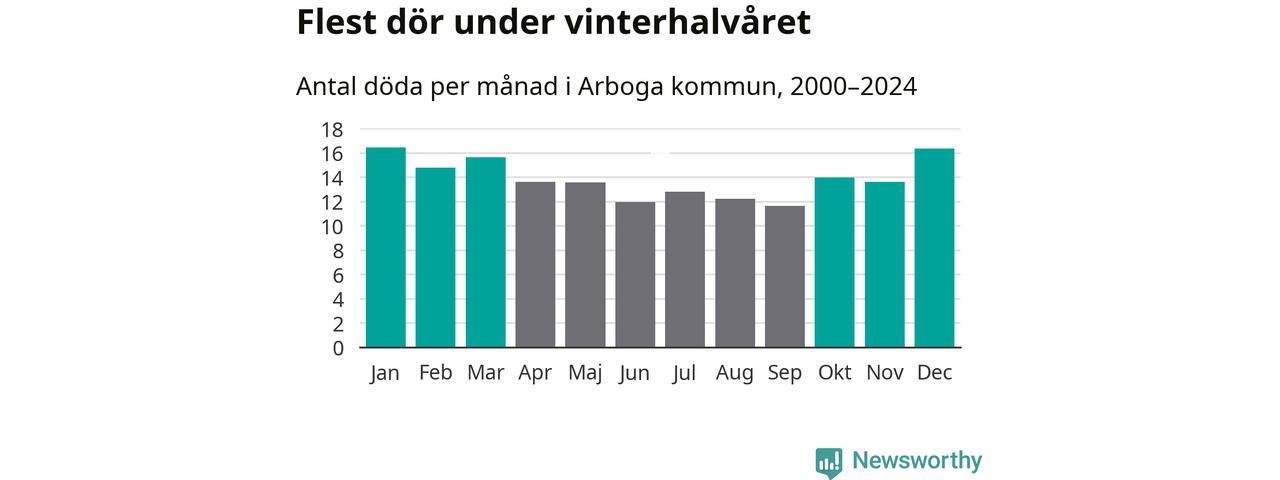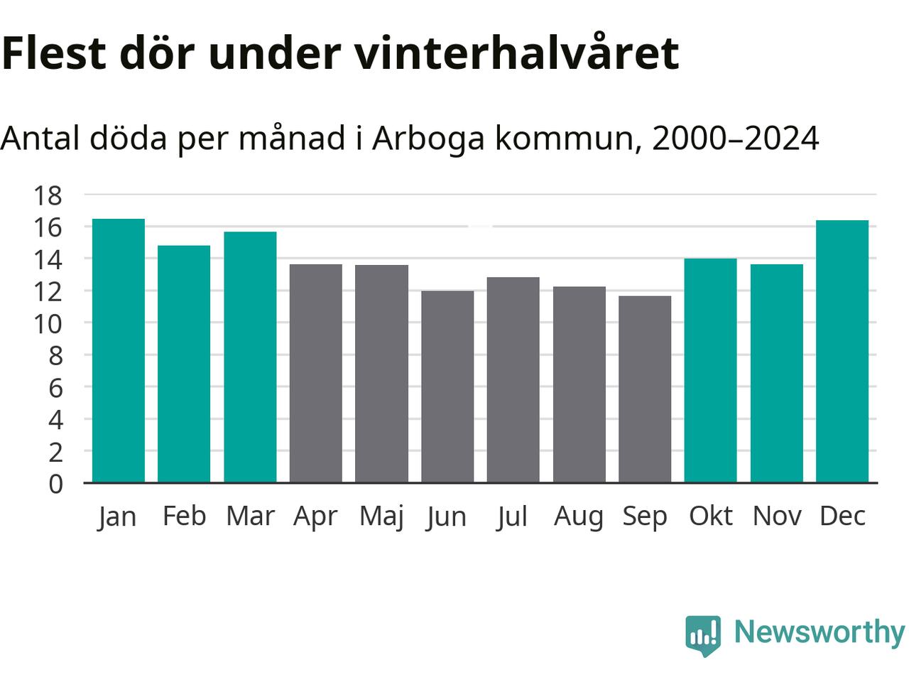 Så är det även i Arboga. Under de senaste 25 åren har 2 196 personer dött i kommunen under vinterhalvåret, jämfört med 1 884 personer under sommarhalvåret – alltså 17 procent fler.