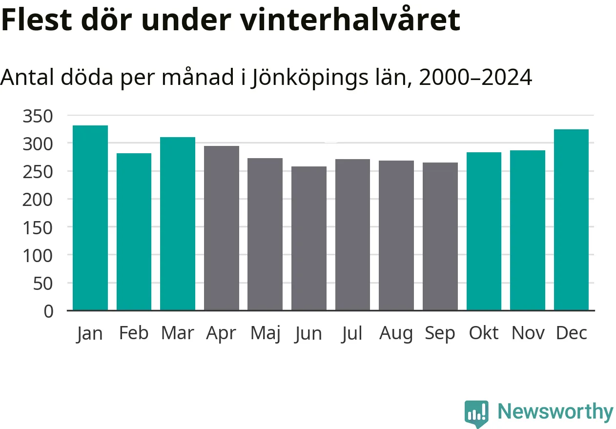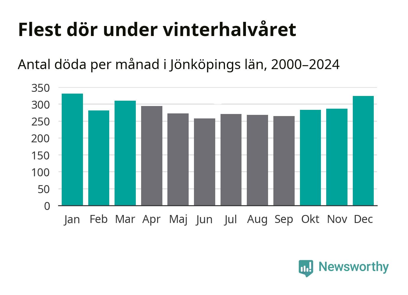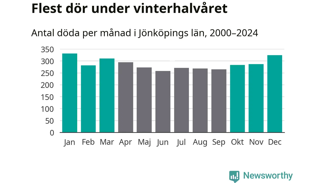 Så är det även i Jönköping. Under de senaste 25 åren har 44 982 personer dött i länet under vinterhalvåret, jämfört med 39 948 personer under sommarhalvåret – alltså 13 procent fler.