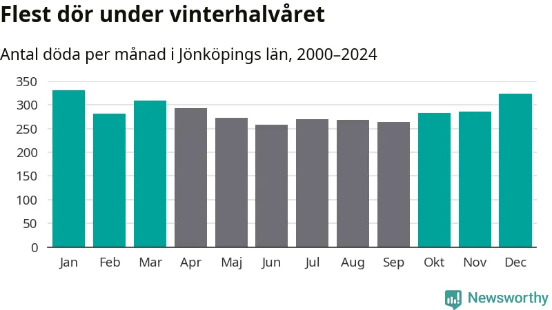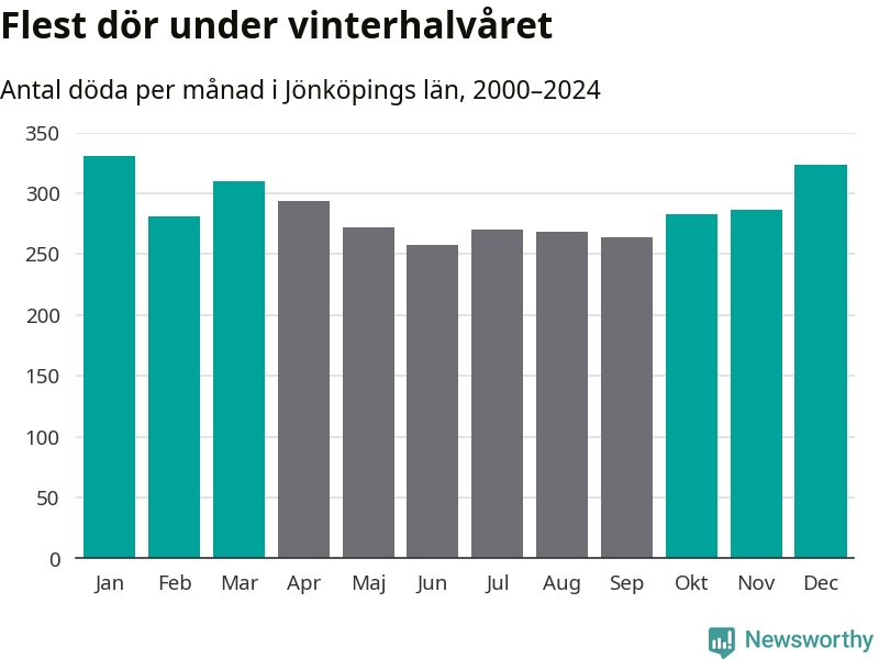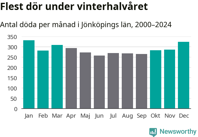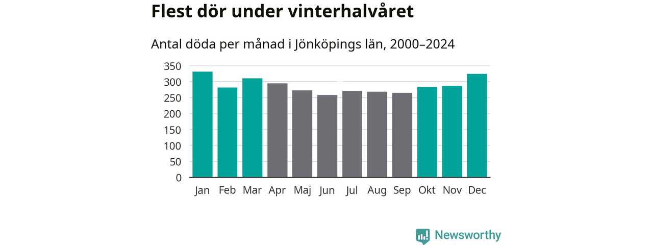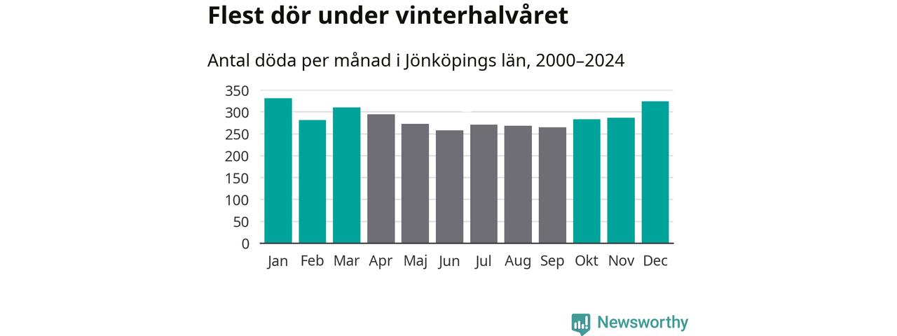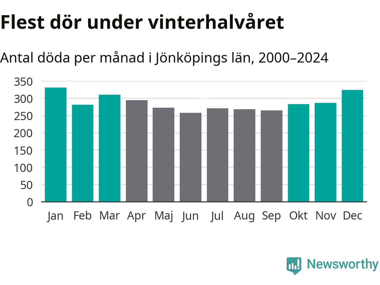 Så är det även i Jönköping. Under de senaste 25 åren har 44 982 personer dött i länet under vinterhalvåret, jämfört med 39 948 personer under sommarhalvåret – alltså 13 procent fler.