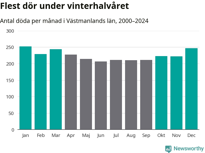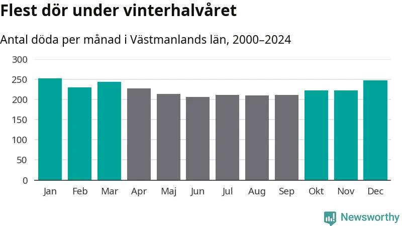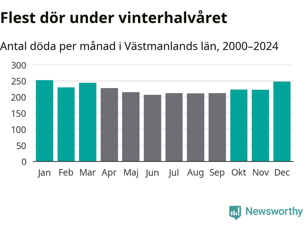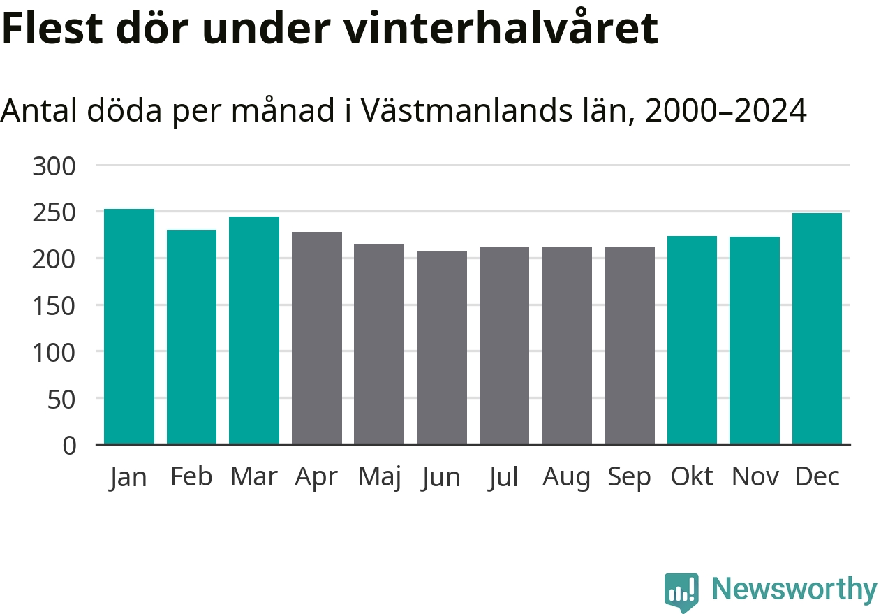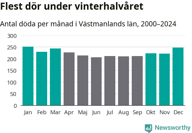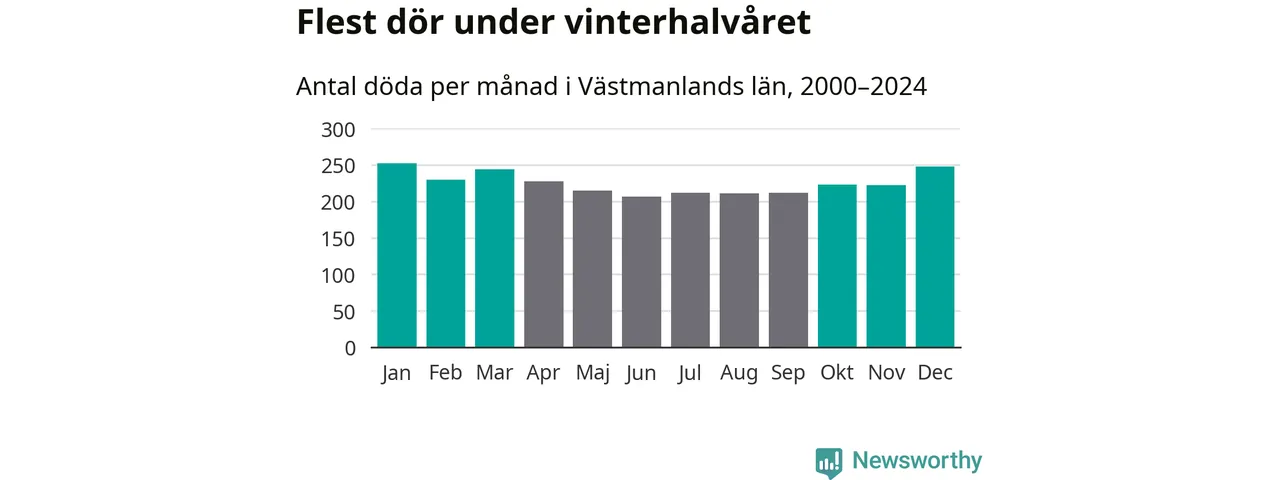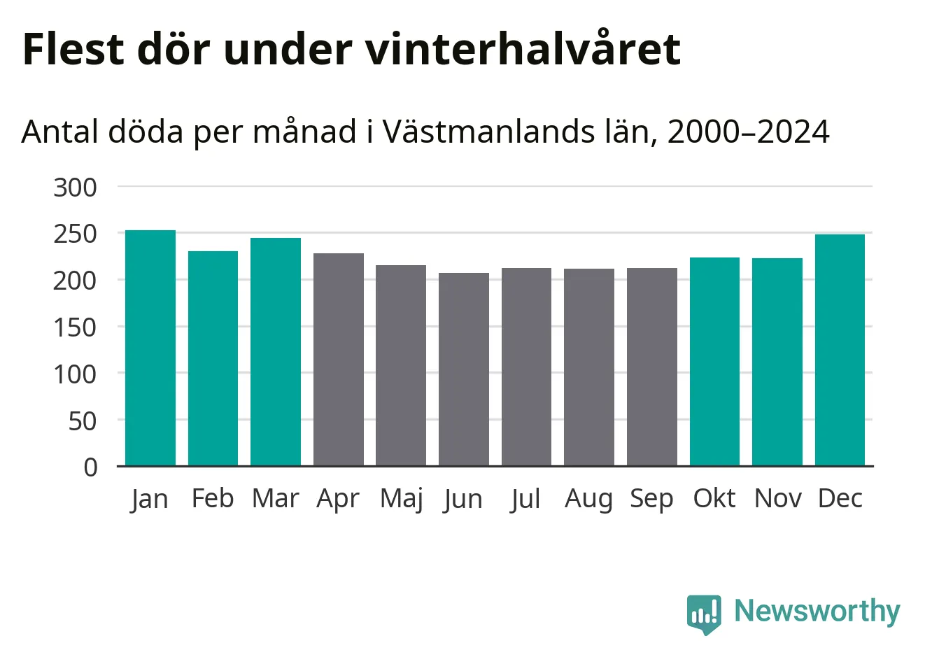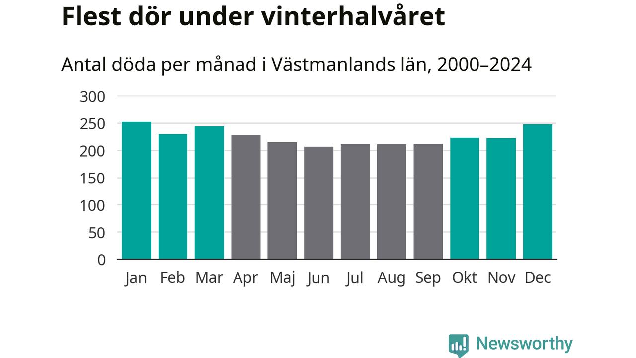 Så är det även i Västmanland. Under de senaste 25 åren har 34 791 personer dött i länet under vinterhalvåret, jämfört med 31 366 personer under sommarhalvåret – alltså elva procent fler.