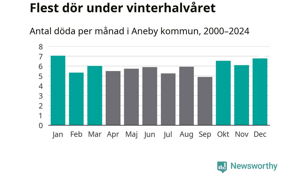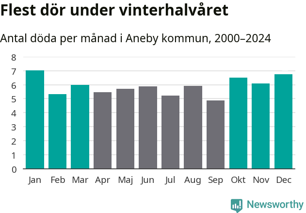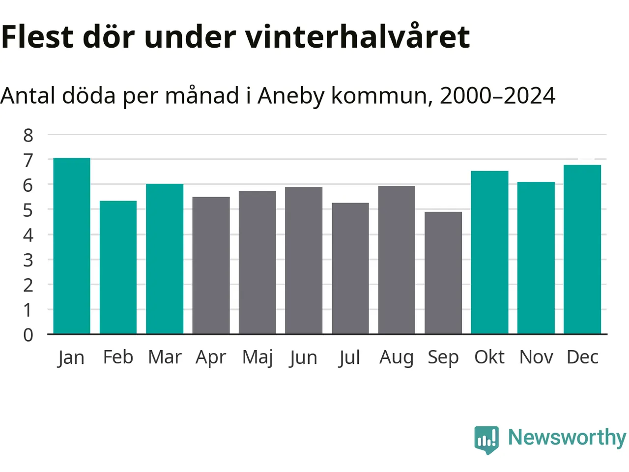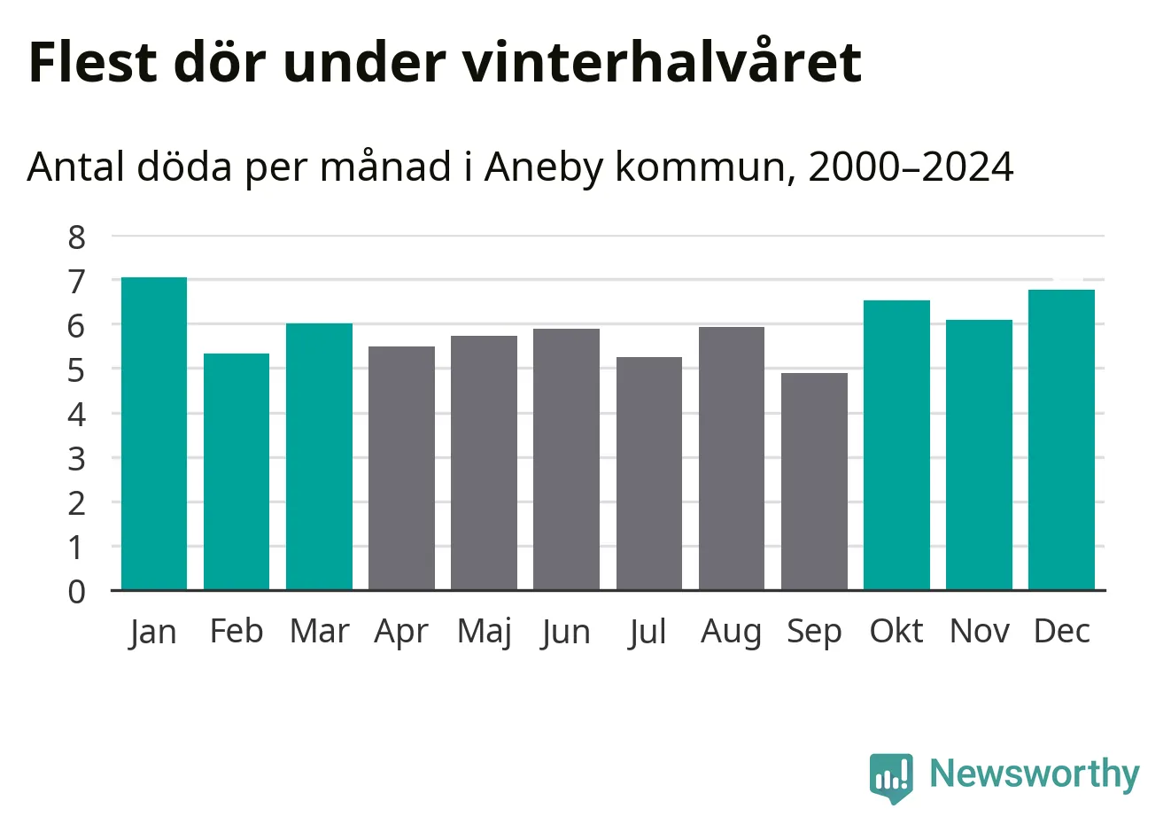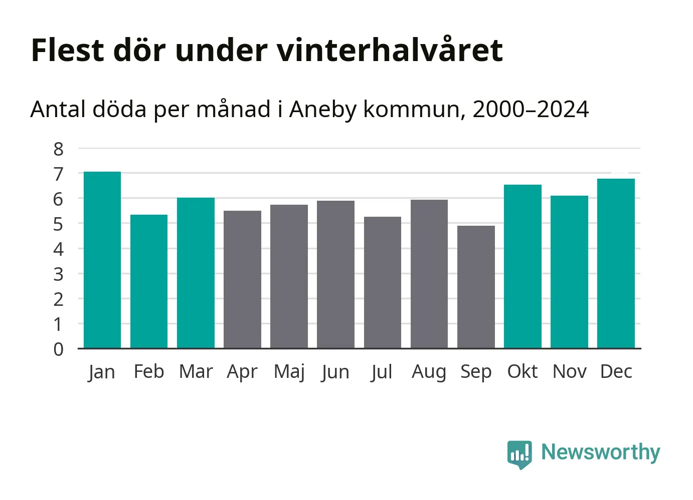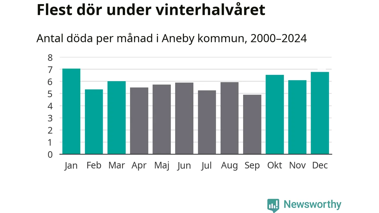 Så är det även i Aneby. Under de senaste 25 åren har 902 personer dött i kommunen under vinterhalvåret, jämfört med 849 personer under sommarhalvåret – alltså sex procent fler.