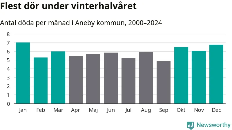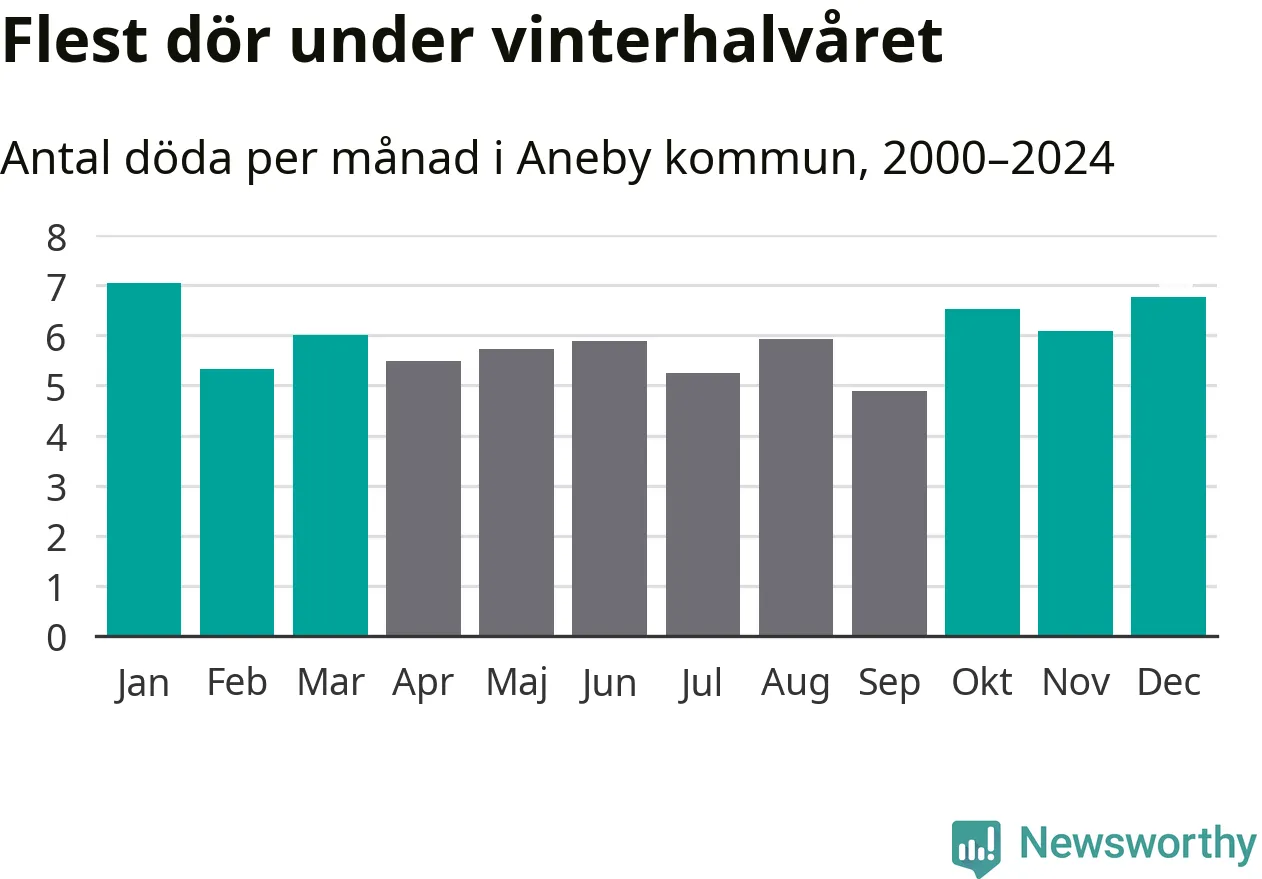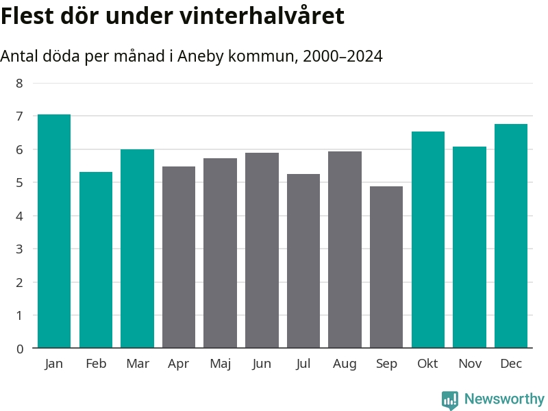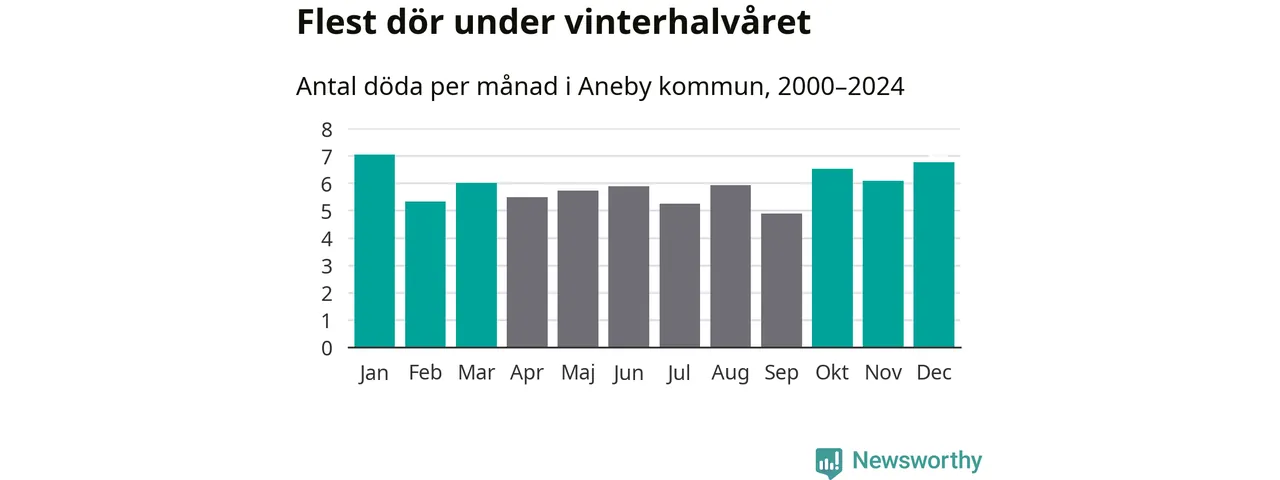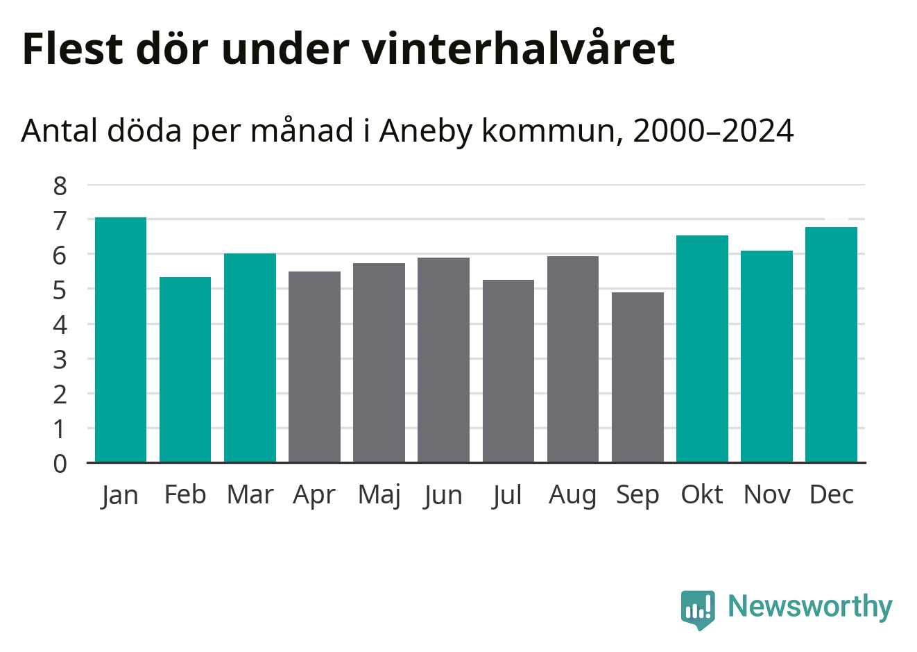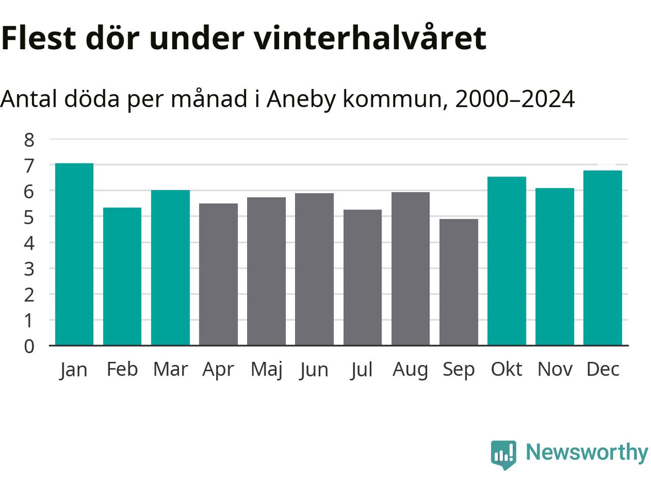 Så är det även i Aneby. Under de senaste 25 åren har 902 personer dött i kommunen under vinterhalvåret, jämfört med 849 personer under sommarhalvåret – alltså sex procent fler.
