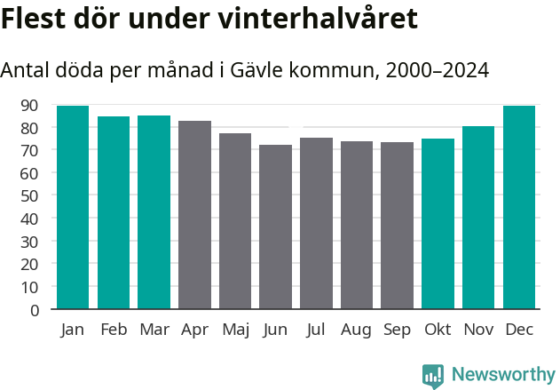 Så är det även i Gävle. Under de senaste 25 åren har 12 524 personer dött i kommunen under vinterhalvåret, jämfört med 10 930 personer under sommarhalvåret – alltså 15 procent fler.