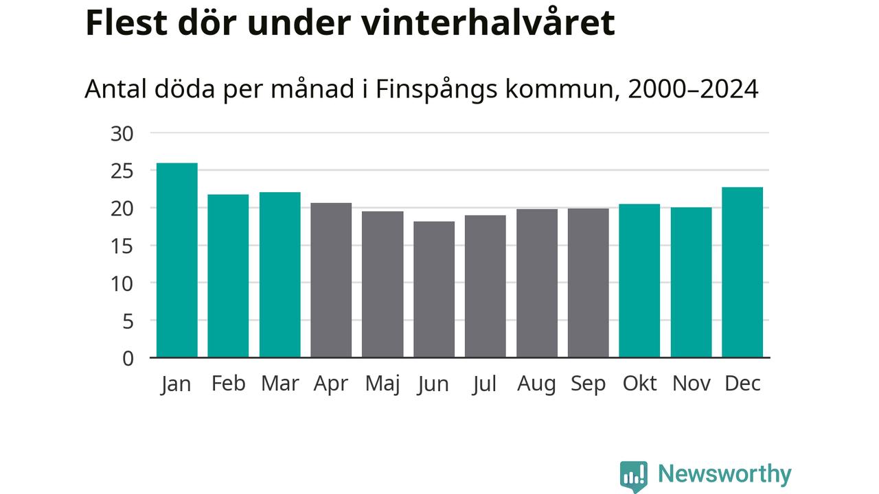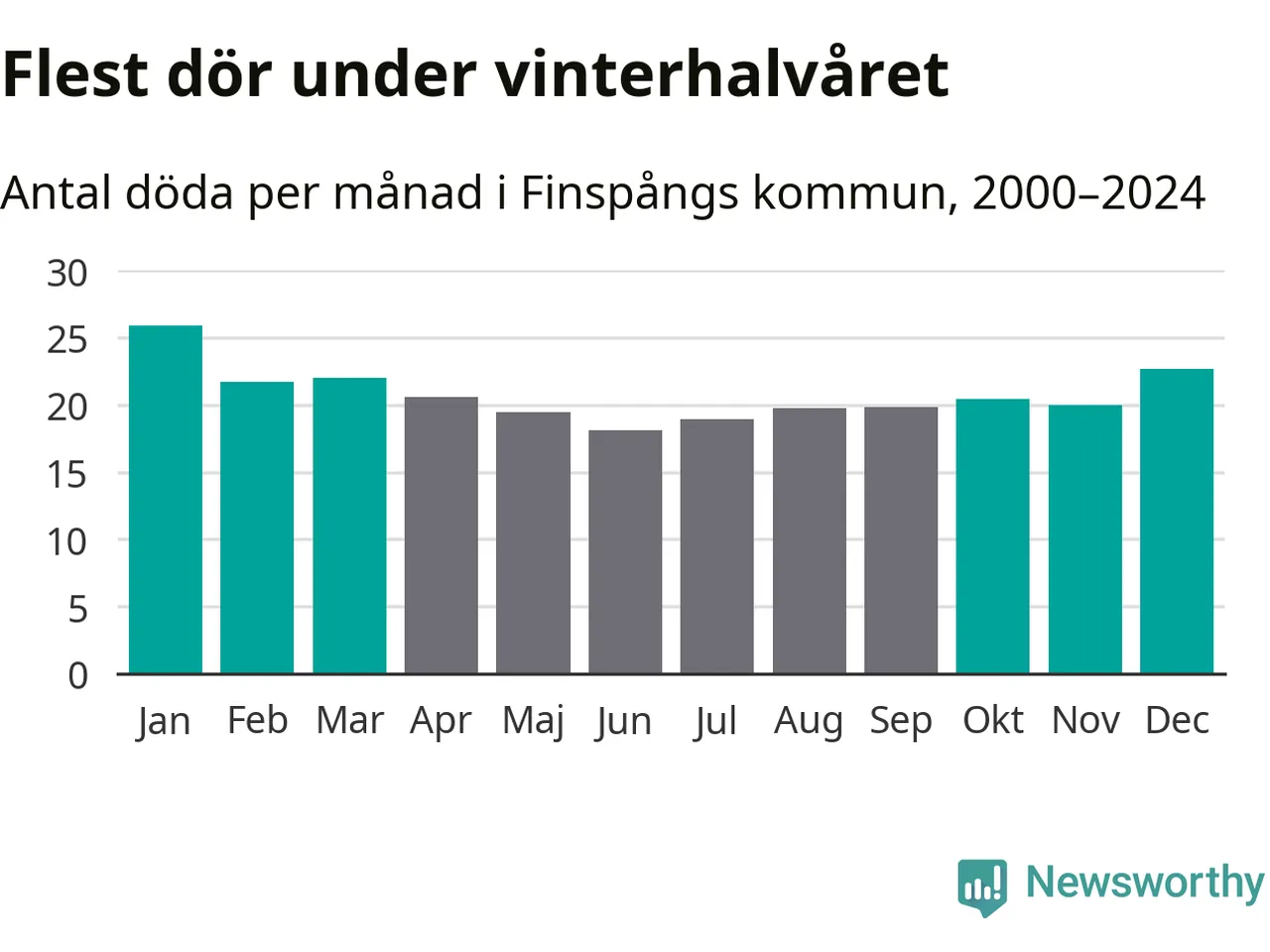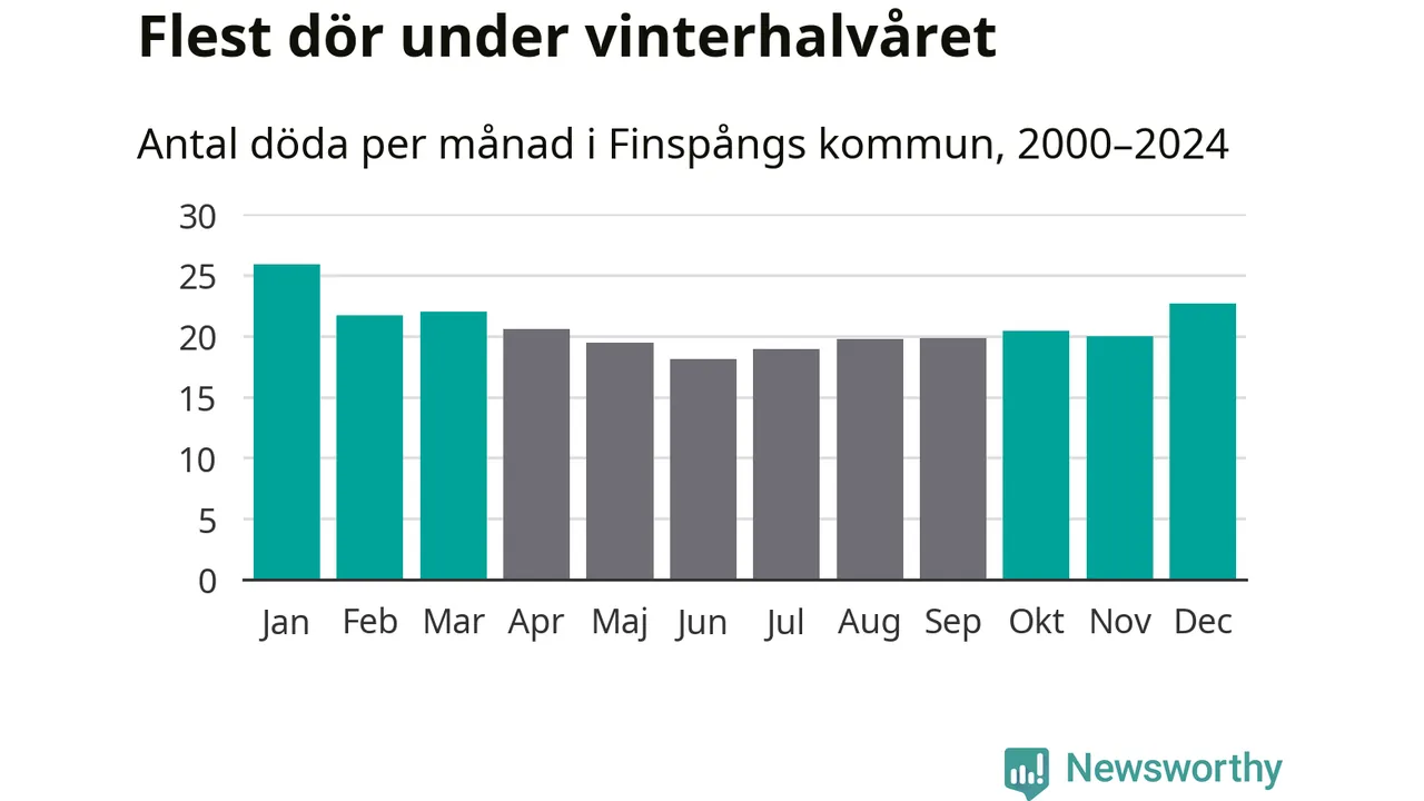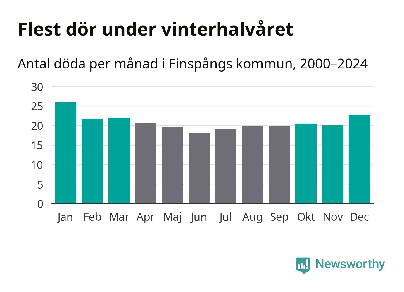 Så är det även i Finspång. Under de senaste 25 åren har 3 282 personer dött i kommunen under vinterhalvåret, jämfört med 2 883 personer under sommarhalvåret – alltså 14 procent fler.