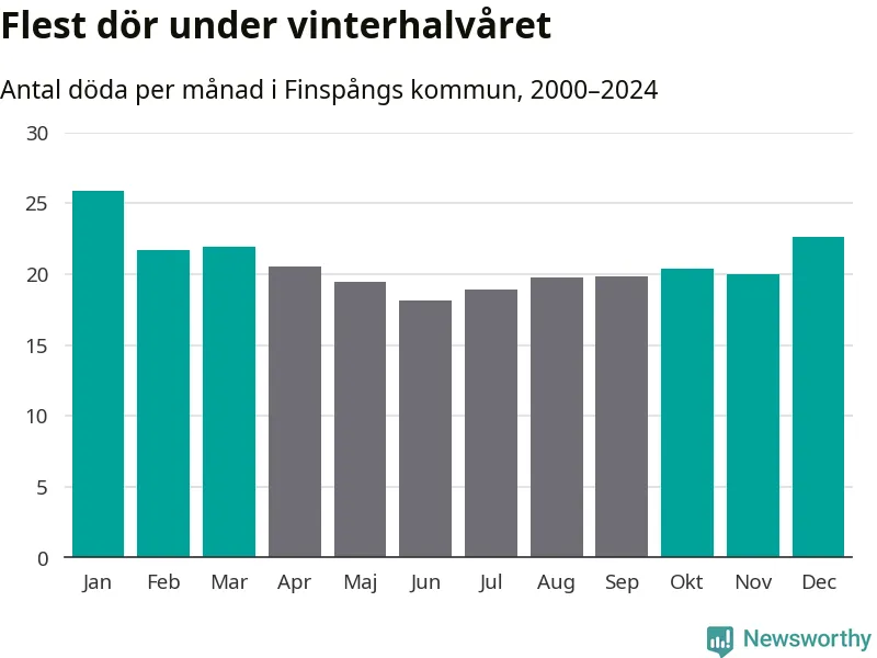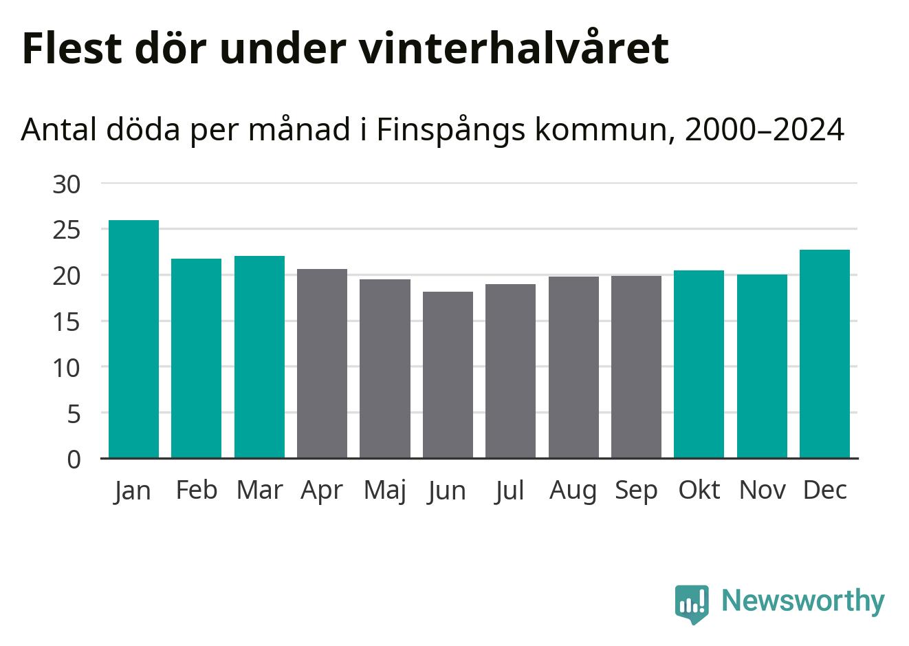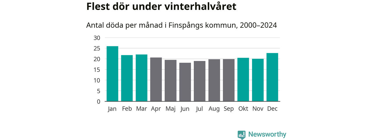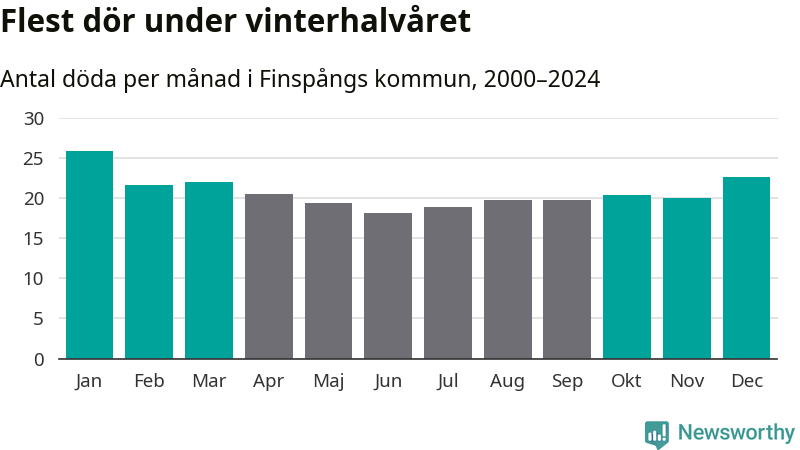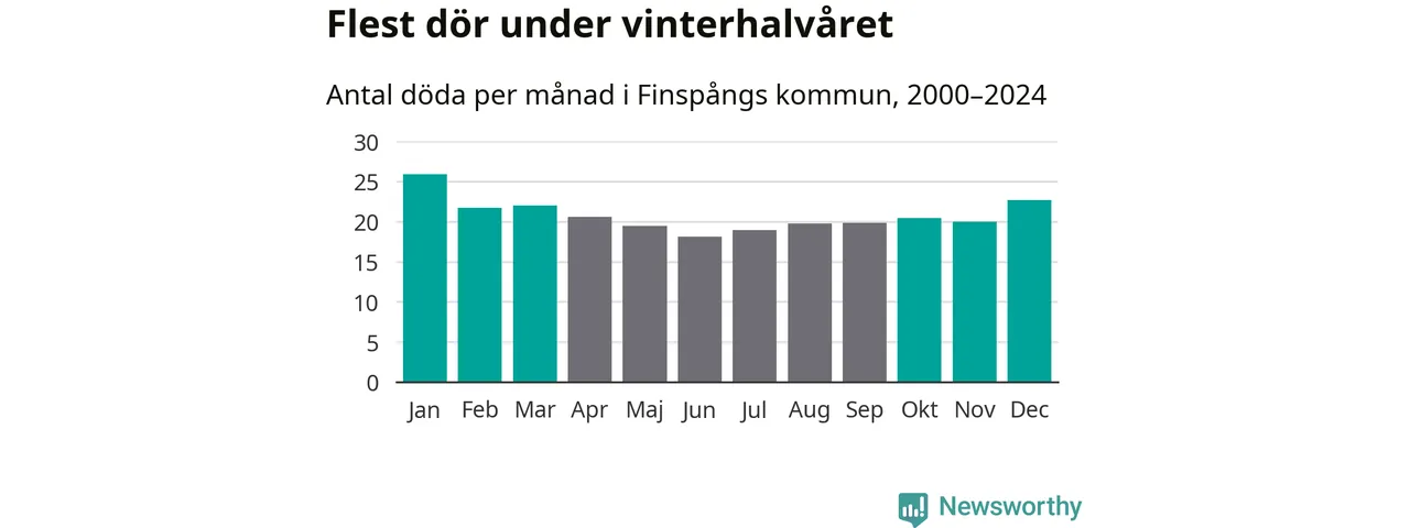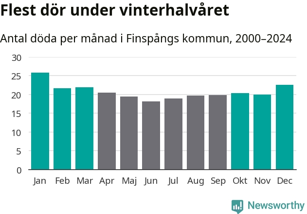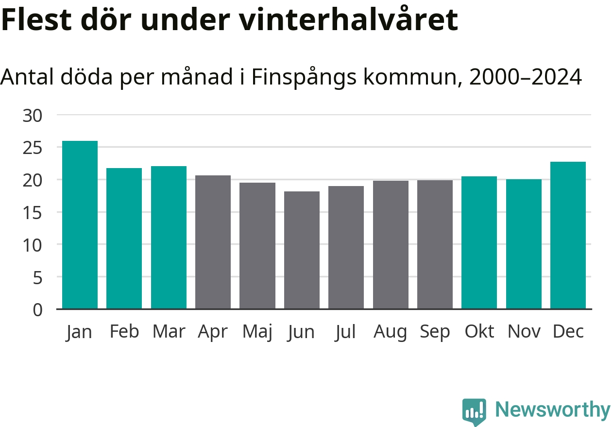 Så är det även i Finspång. Under de senaste 25 åren har 3 282 personer dött i kommunen under vinterhalvåret, jämfört med 2 883 personer under sommarhalvåret – alltså 14 procent fler.