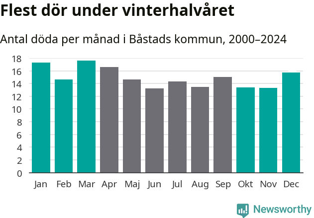 I landet som helhet är det veckorna kring årsskiftet som är de allra dödligaste. I Båstad har flest istället dött vecka 3. Sammanlagt under de senaste 25 åren handlar det om 112 personer, vilket är 32 procent fler än snittet för resten av året.