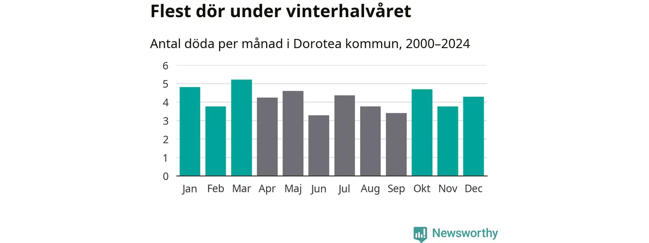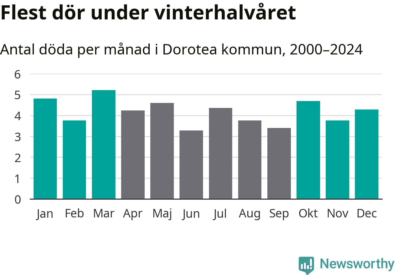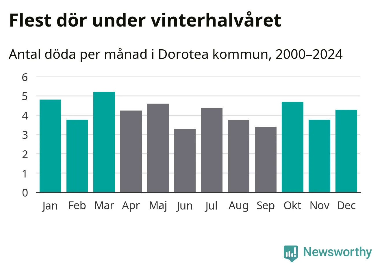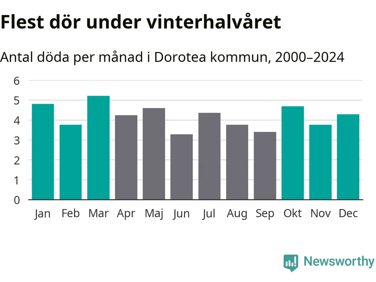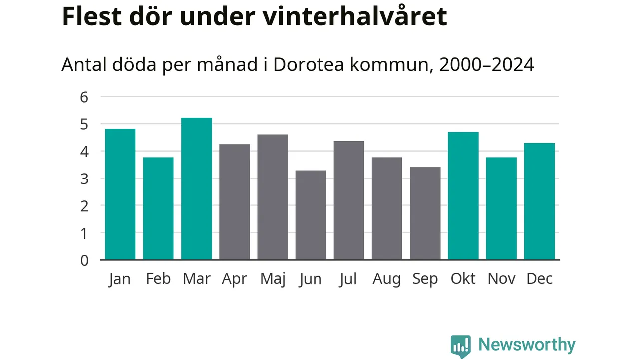 Så är det även i Dorotea. Under de senaste 25 åren har 649 personer dött i kommunen under vinterhalvåret, jämfört med 594 personer under sommarhalvåret – alltså nio procent fler.