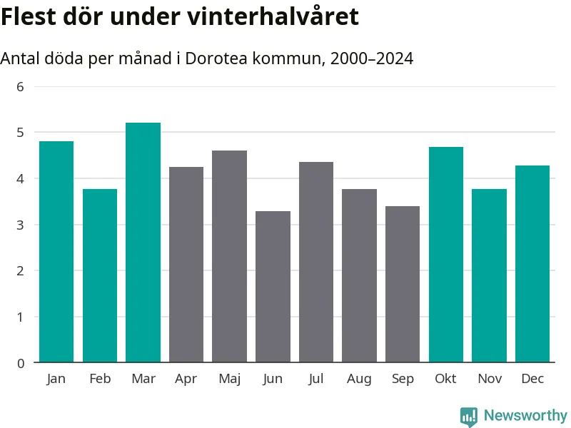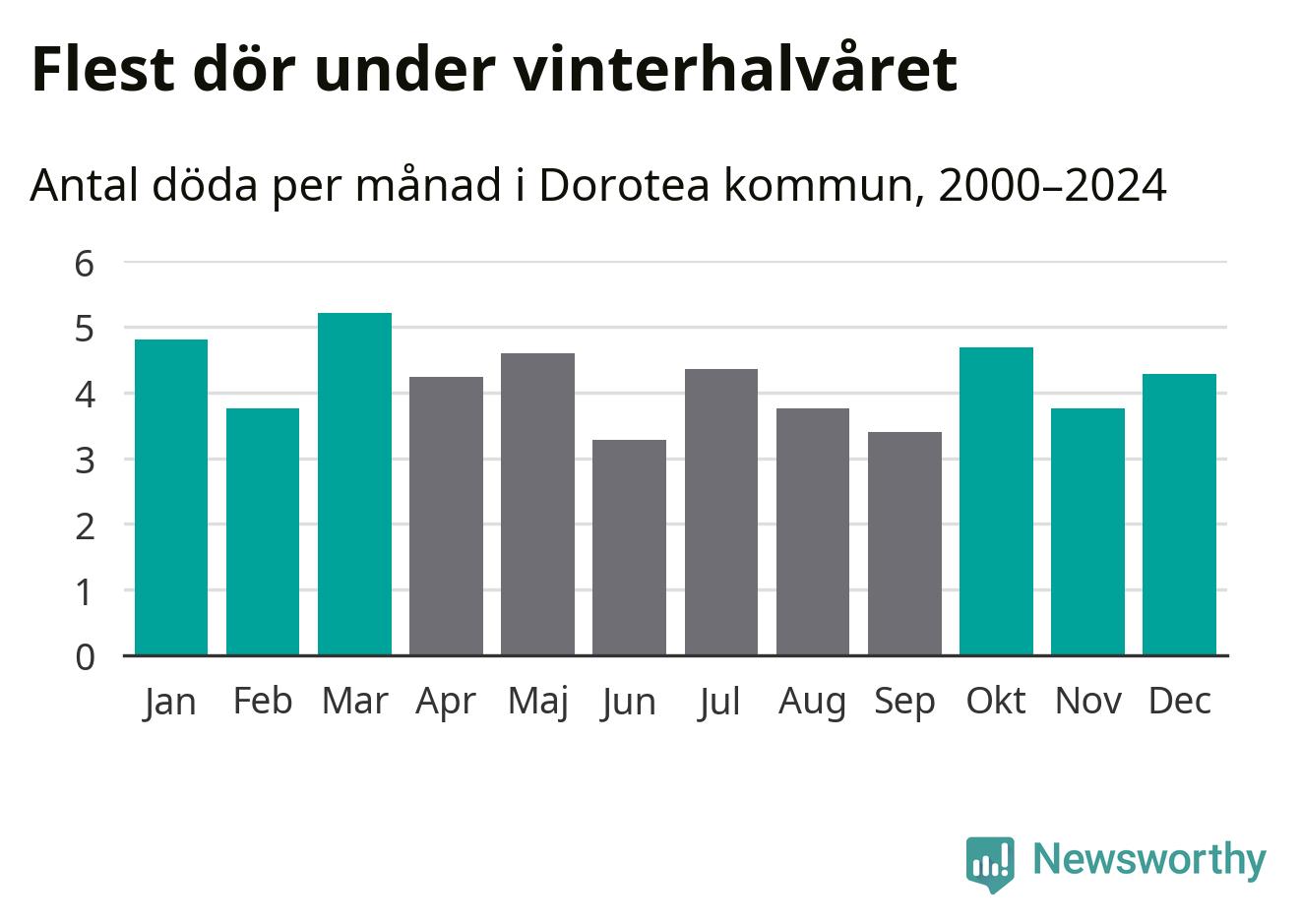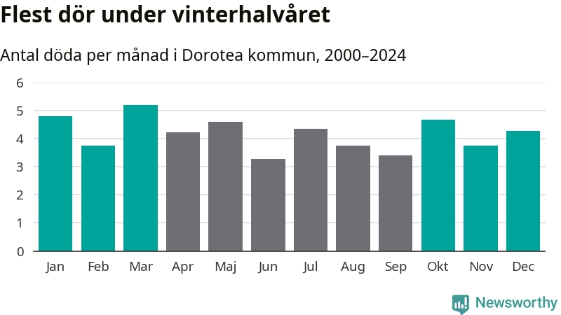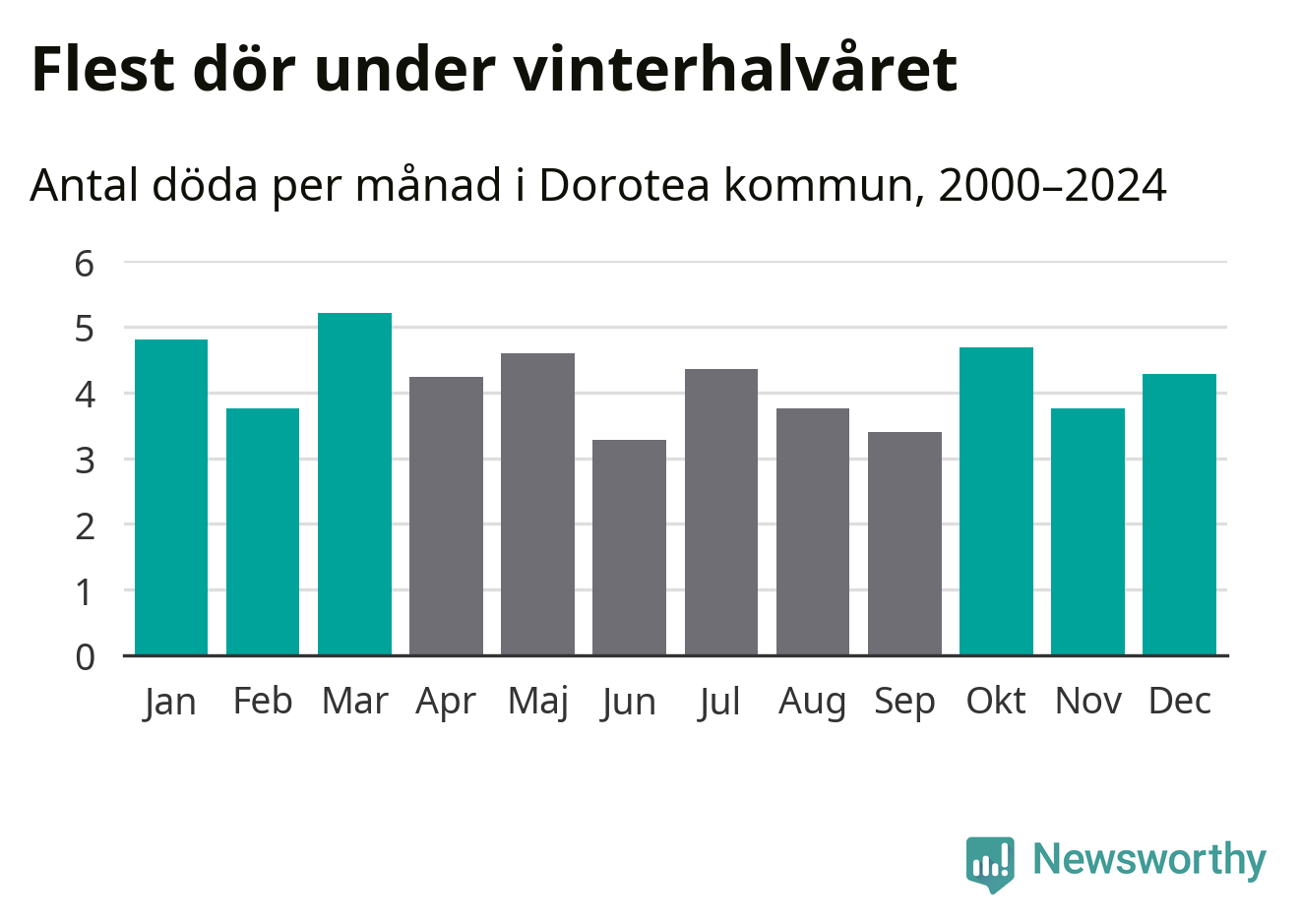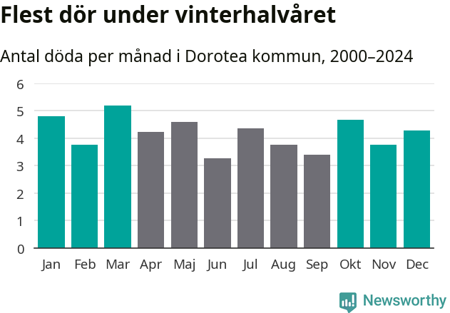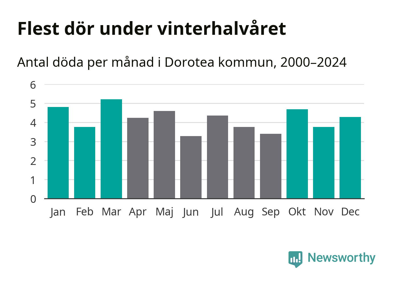 Så är det även i Dorotea. Under de senaste 25 åren har 649 personer dött i kommunen under vinterhalvåret, jämfört med 594 personer under sommarhalvåret – alltså nio procent fler.