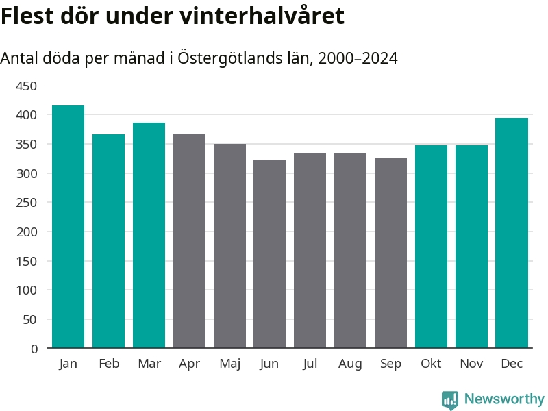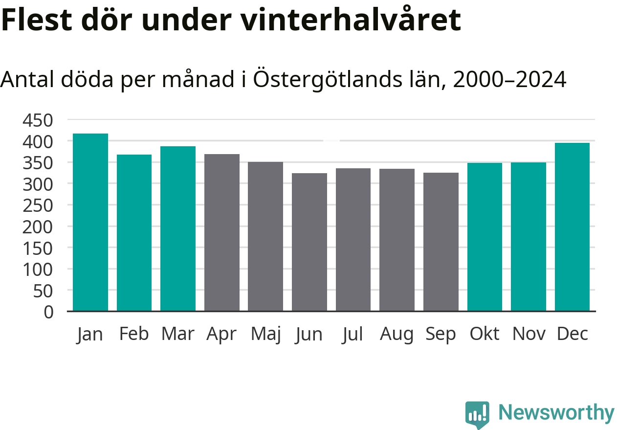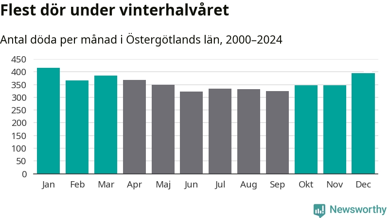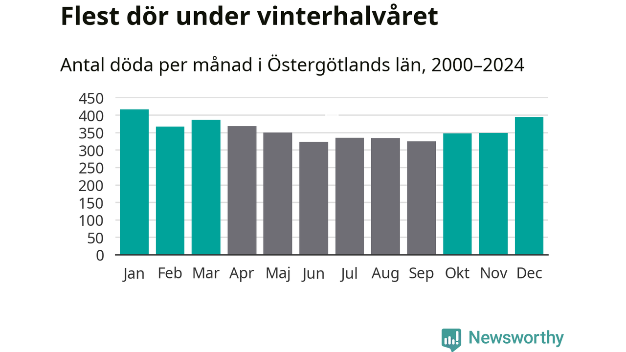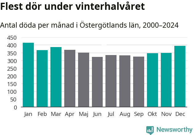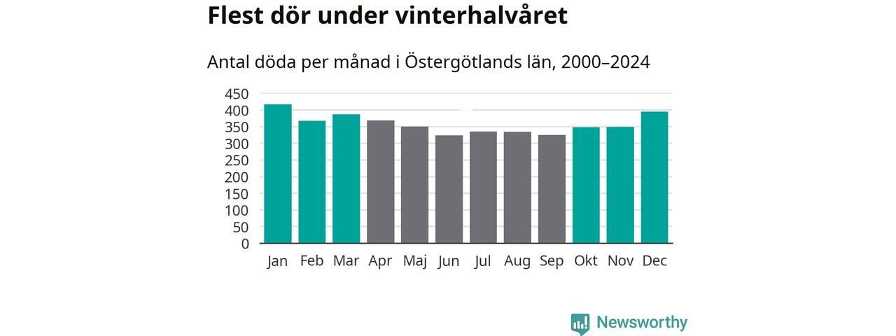 Så är det även i Östergötland. Under de senaste 25 åren har 56 131 personer dött i länet under vinterhalvåret, jämfört med 49 594 personer under sommarhalvåret – alltså 13 procent fler.