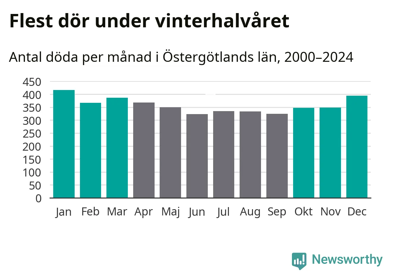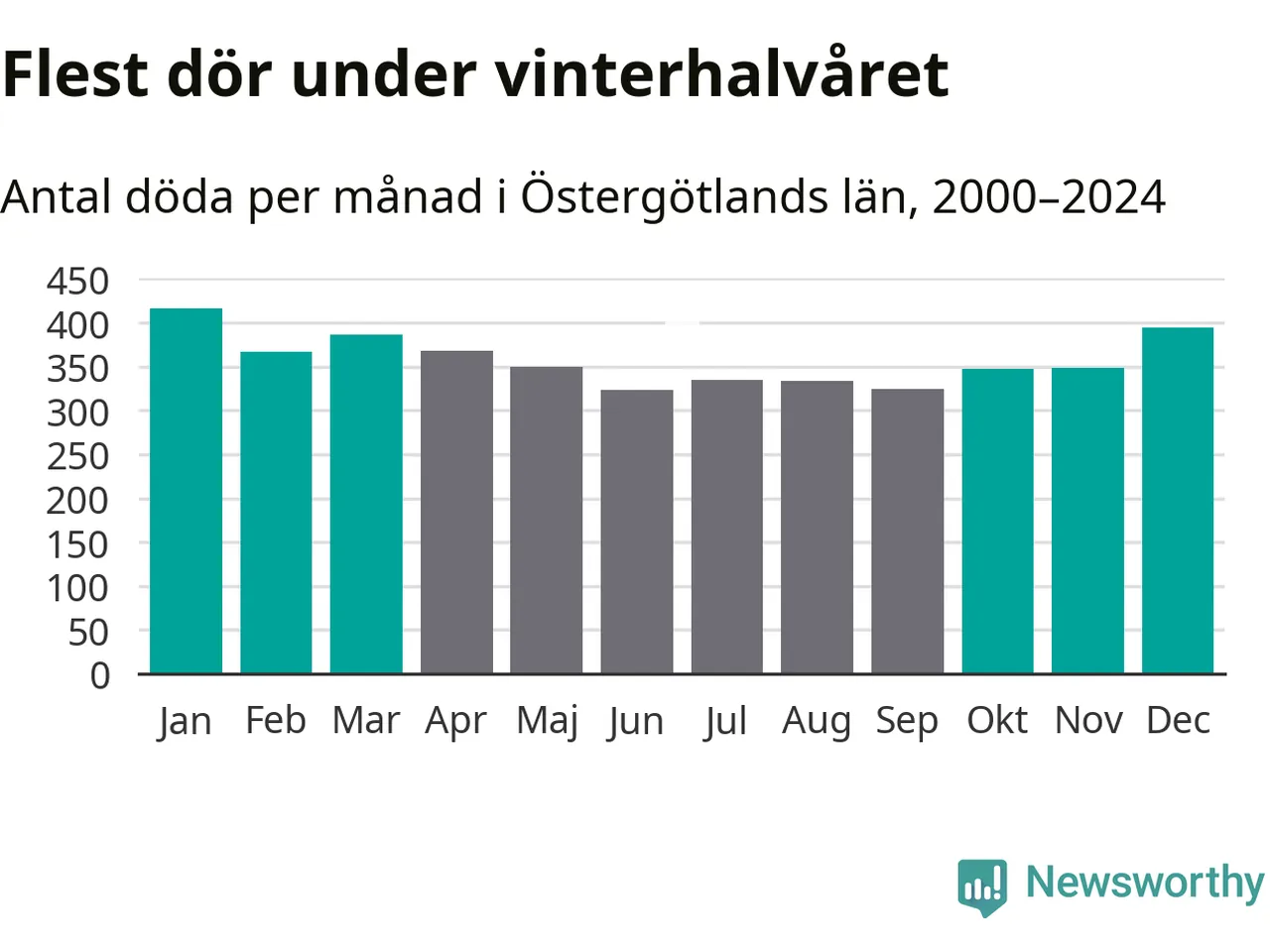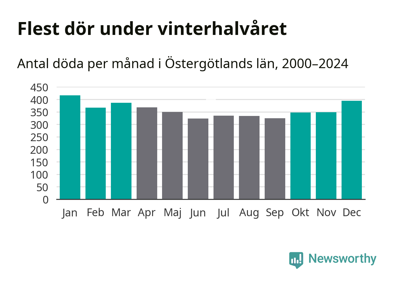 Så är det även i Östergötland. Under de senaste 25 åren har 56 131 personer dött i länet under vinterhalvåret, jämfört med 49 594 personer under sommarhalvåret – alltså 13 procent fler.