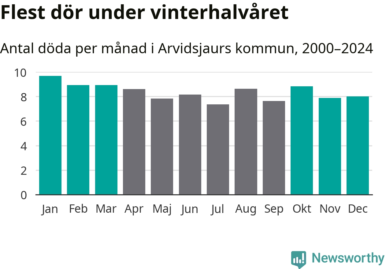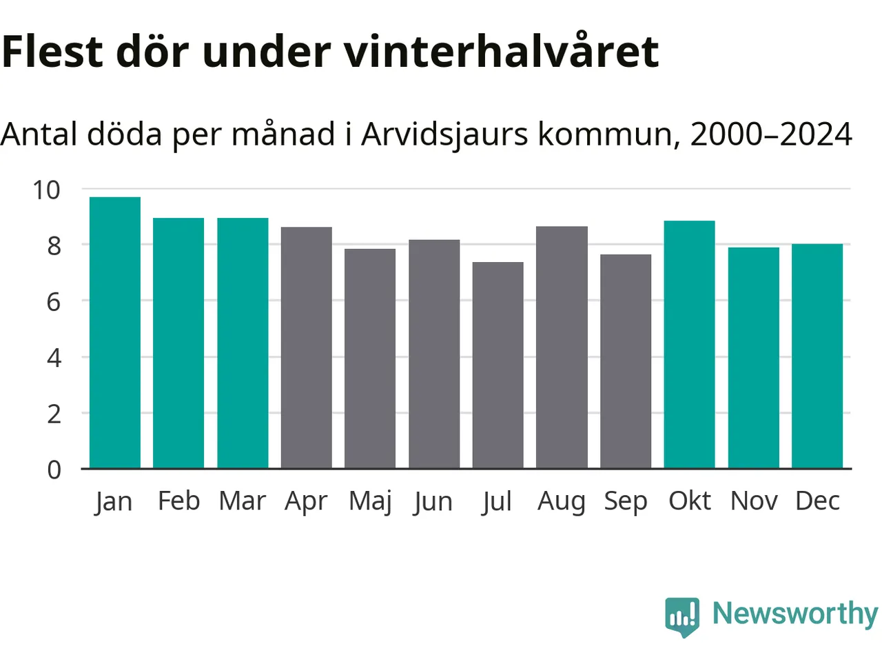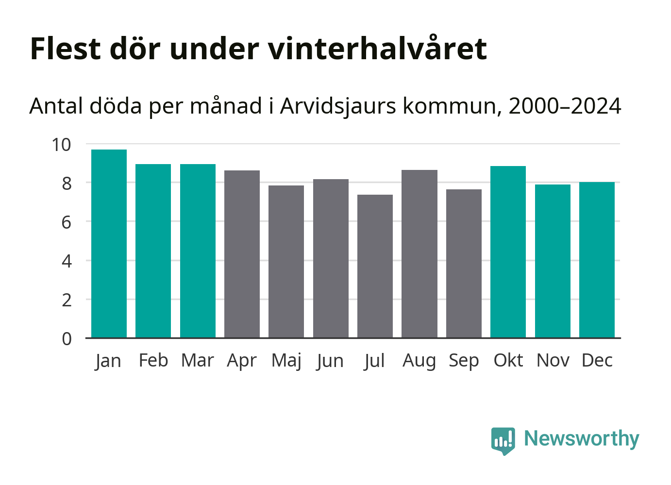 Så är det även i Arvidsjaur. Under de senaste 25 åren har 1 277 personer dött i kommunen under vinterhalvåret, jämfört med 1 203 personer under sommarhalvåret – alltså sex procent fler.