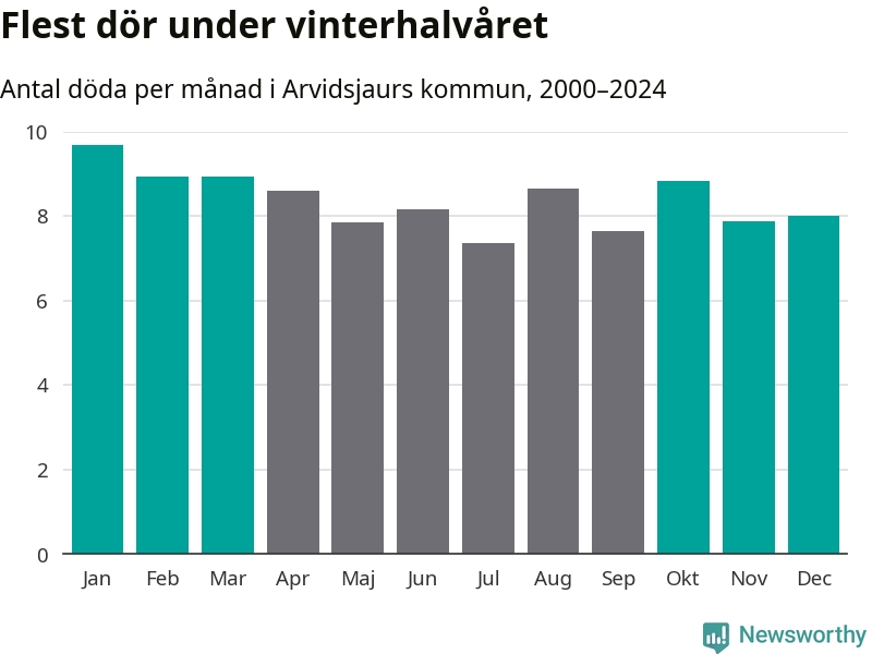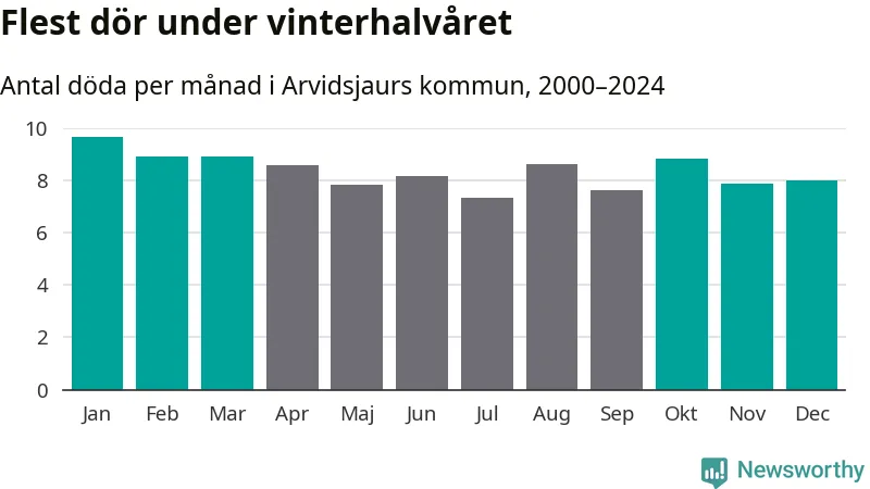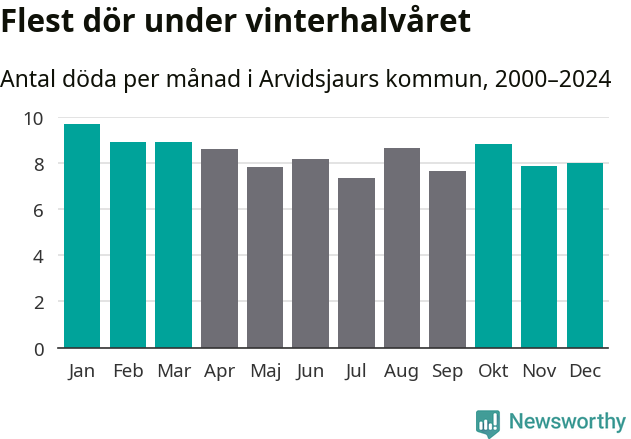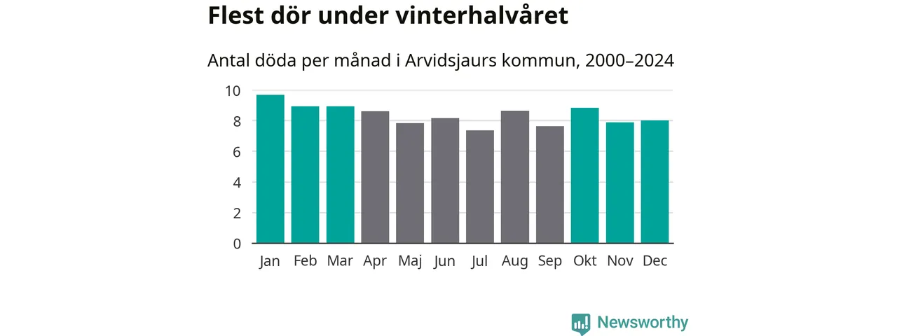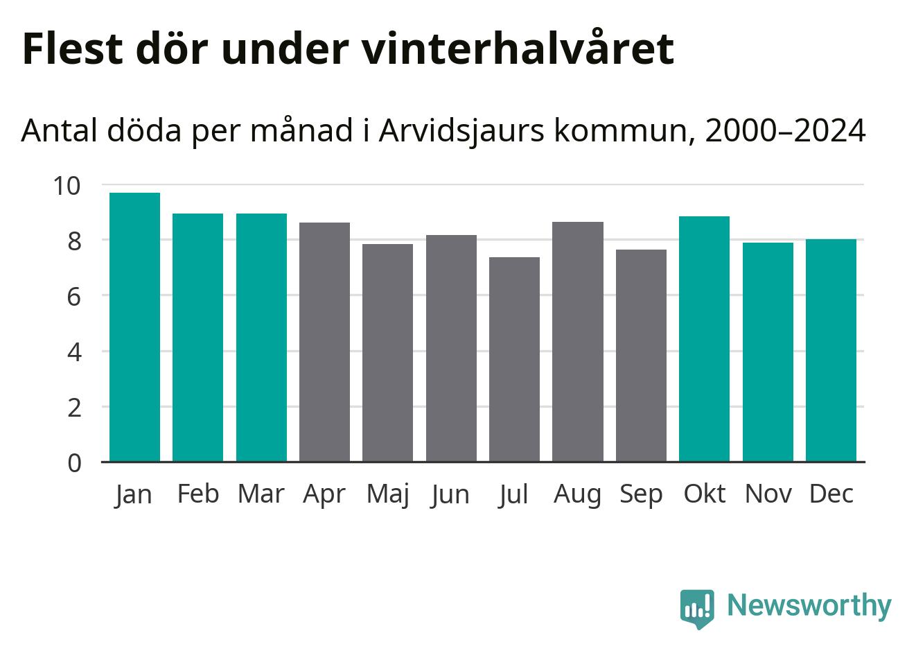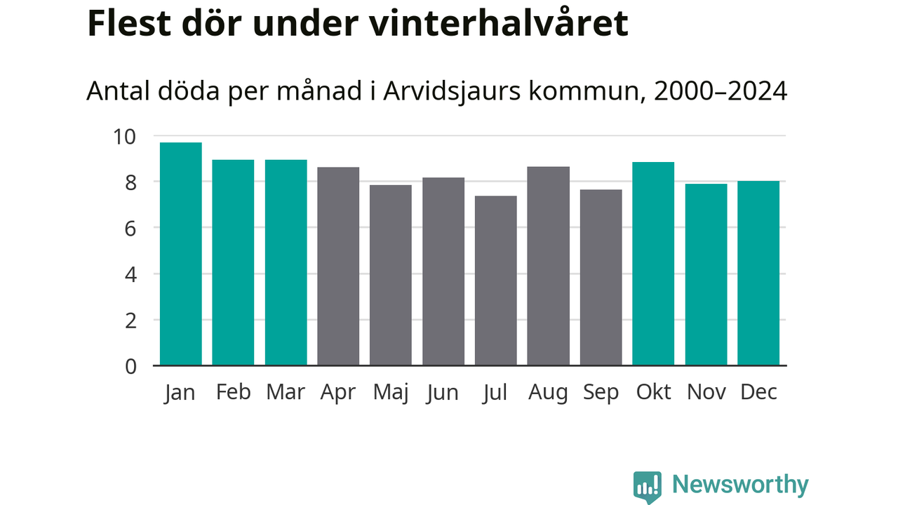 Så är det även i Arvidsjaur. Under de senaste 25 åren har 1 277 personer dött i kommunen under vinterhalvåret, jämfört med 1 203 personer under sommarhalvåret – alltså sex procent fler.
