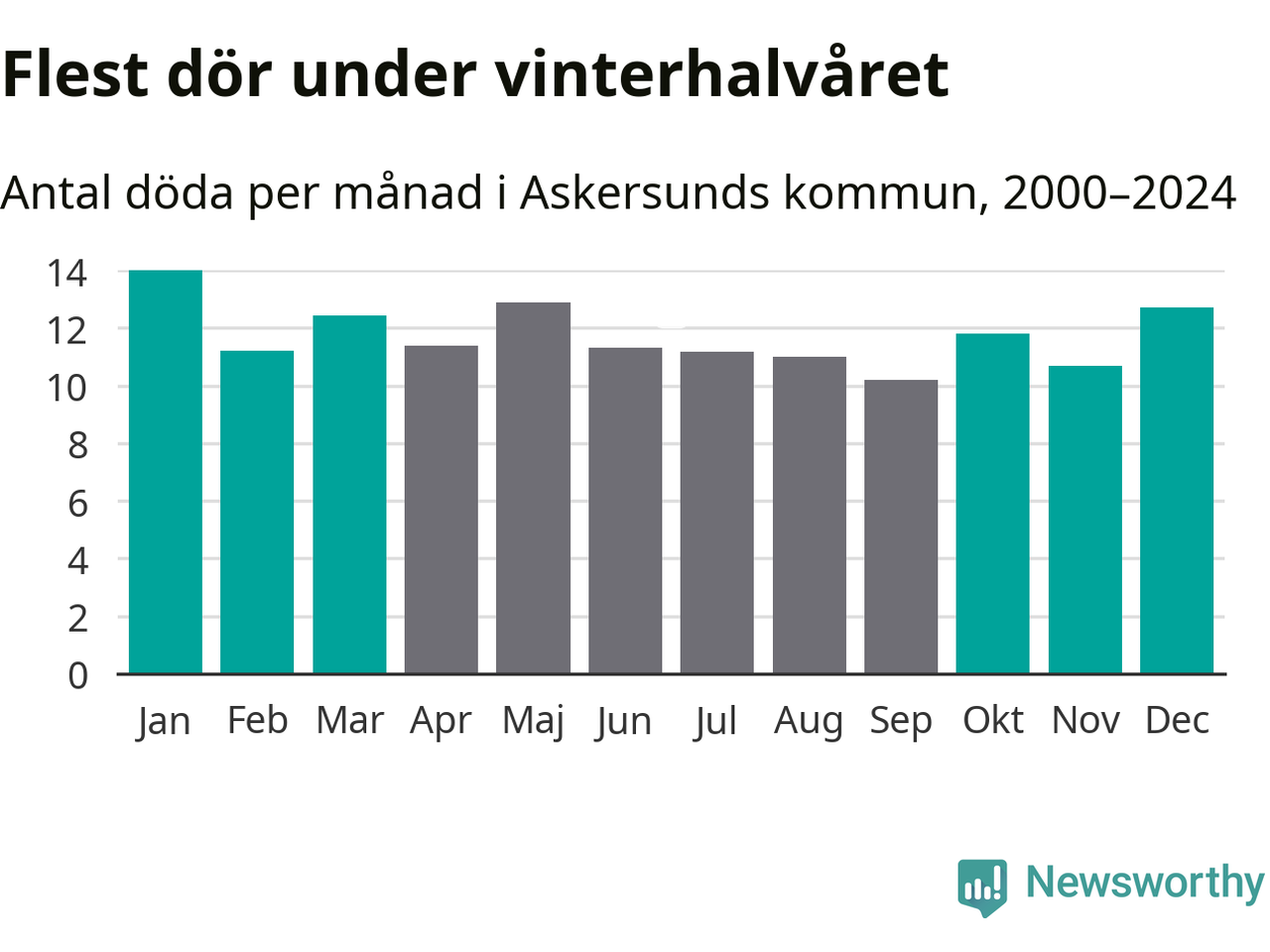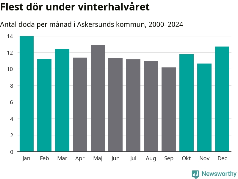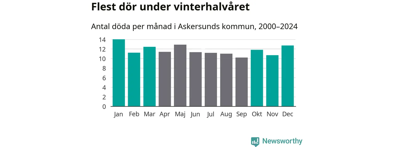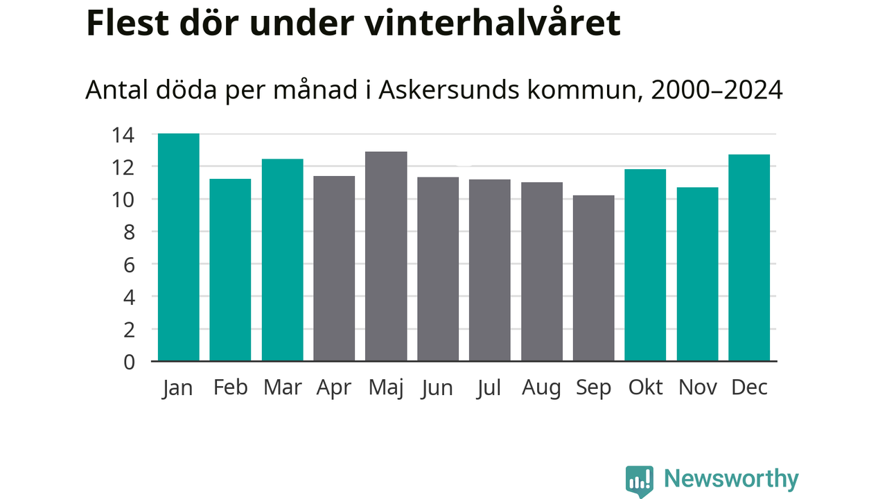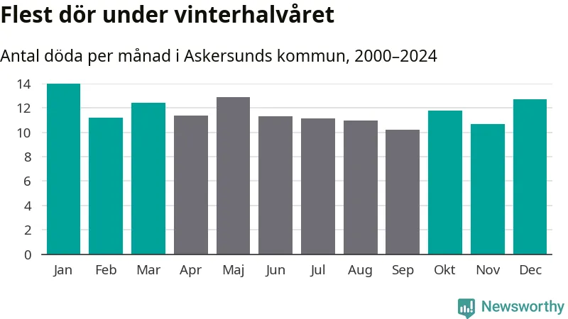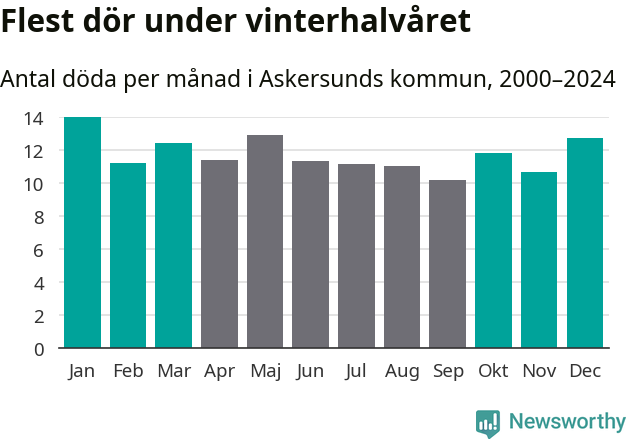 Så är det även i Askersund. Under de senaste 25 åren har 1 792 personer dött i kommunen under vinterhalvåret, jämfört med 1 683 personer under sommarhalvåret – alltså sex procent fler.