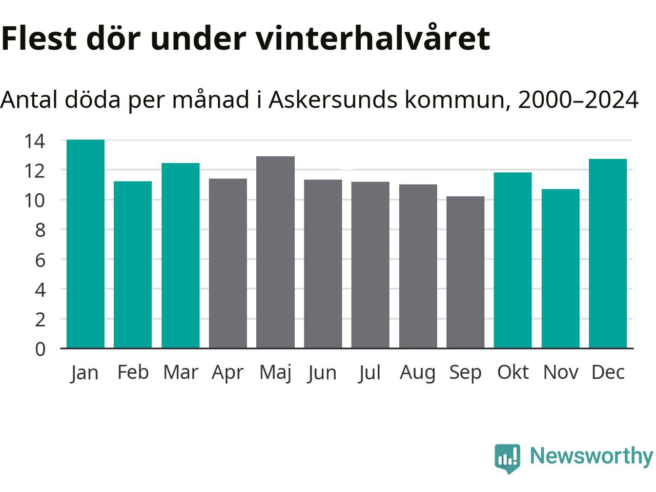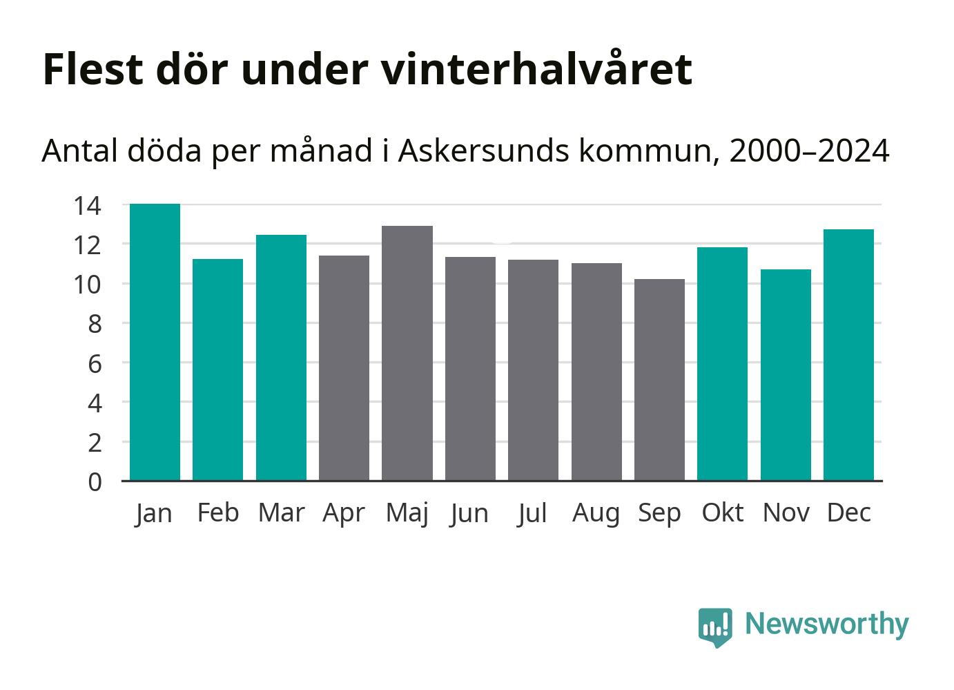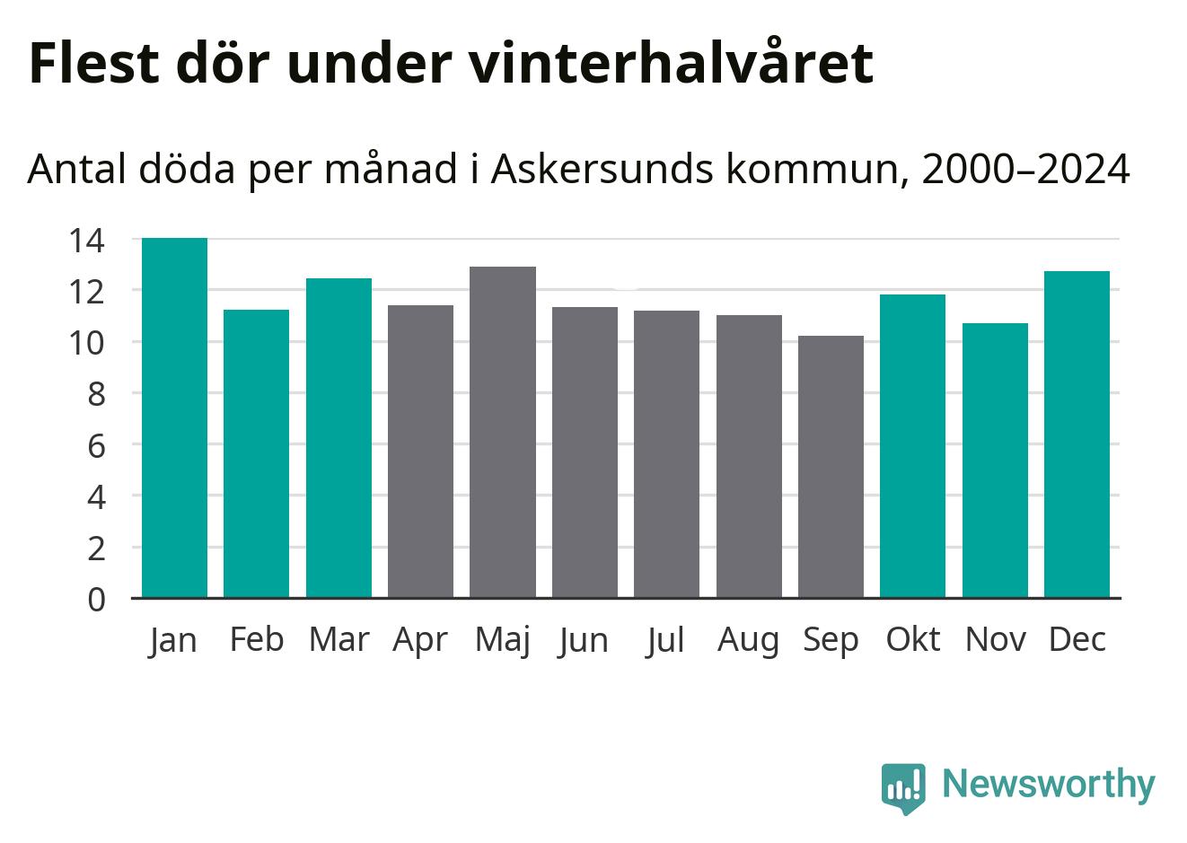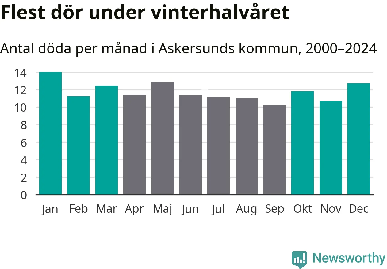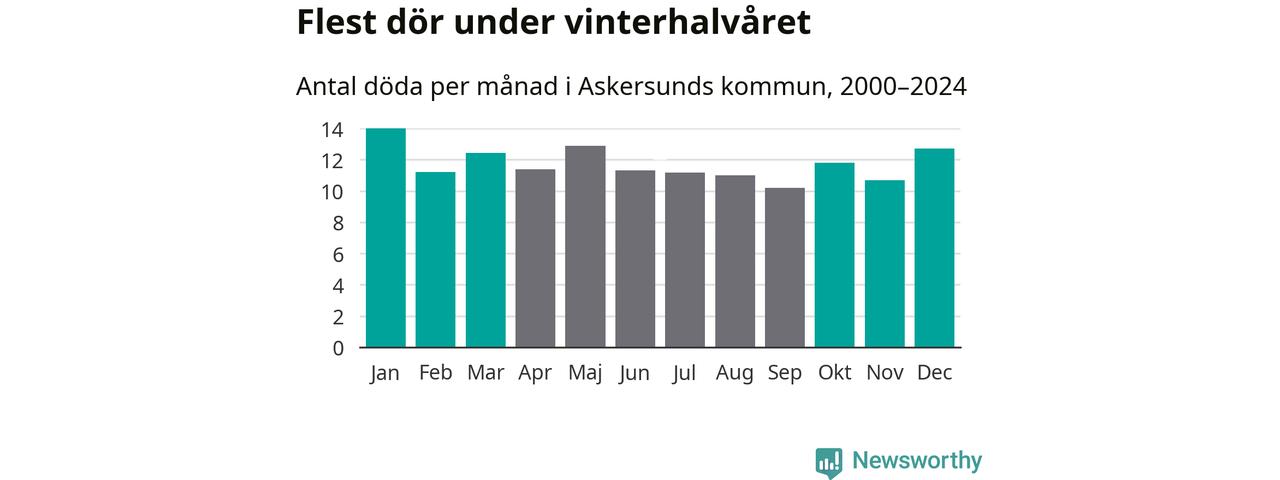 I landet som helhet är det veckorna kring årsskiftet som är de allra dödligaste. Så är det även i Askersund, där den dödligaste perioden infaller under vecka 2, enligt statistik för de senaste 25 åren. Sammanlagt handlar det om 88 personer , vilket är 32 procent fler än snittet för resten av året.