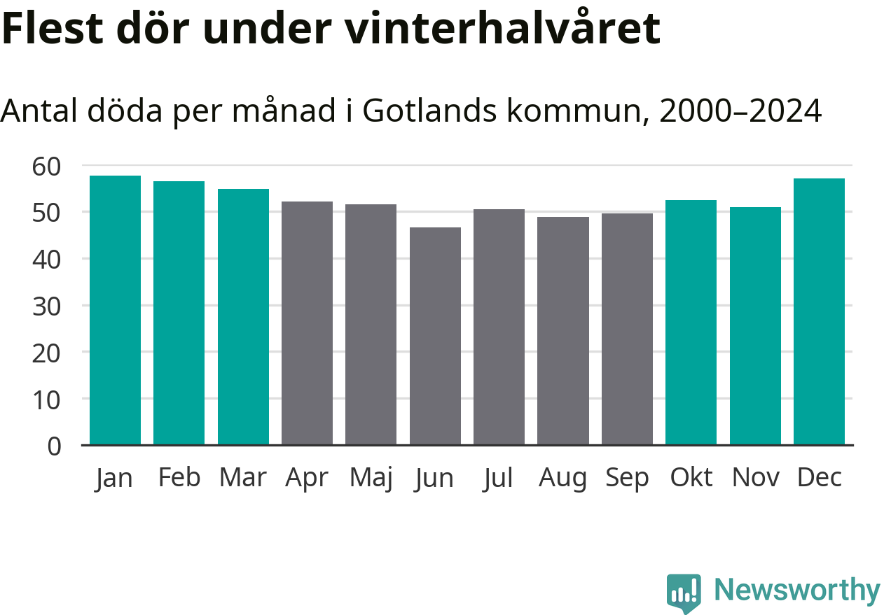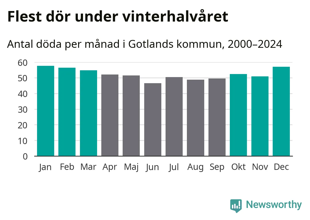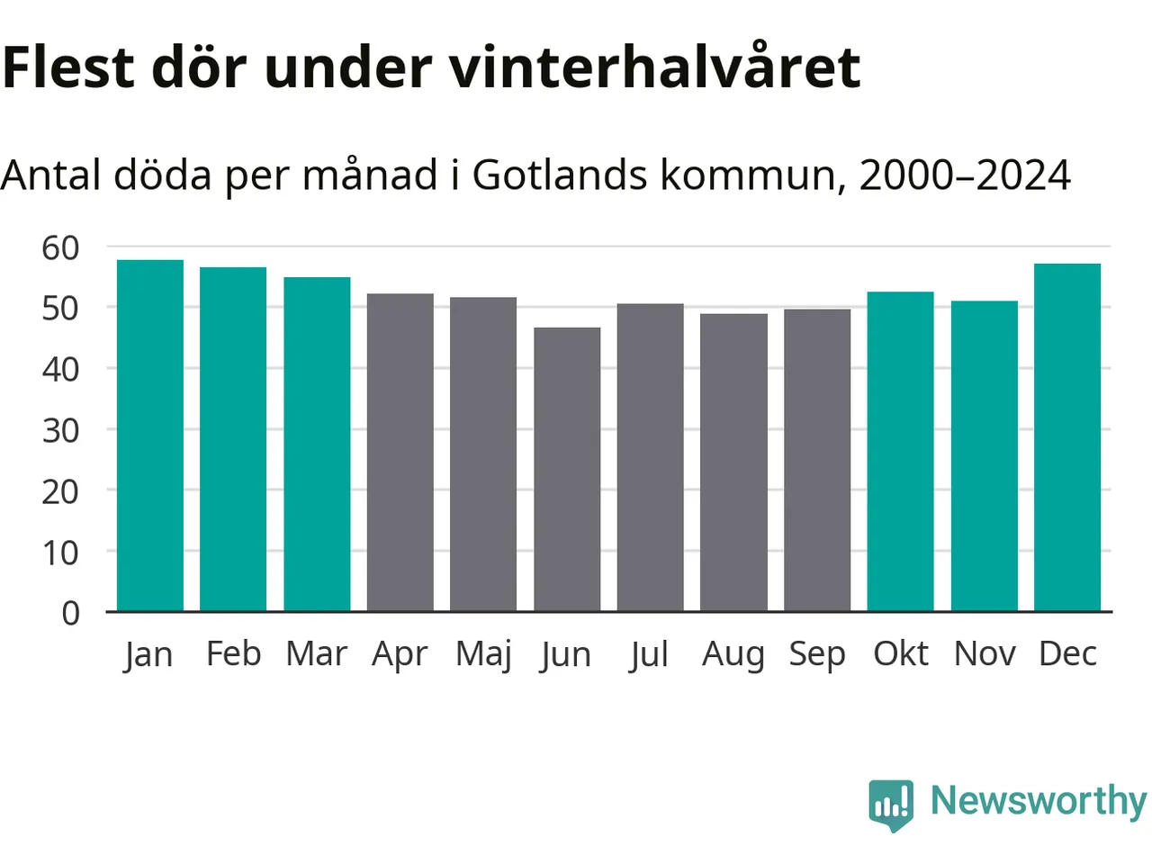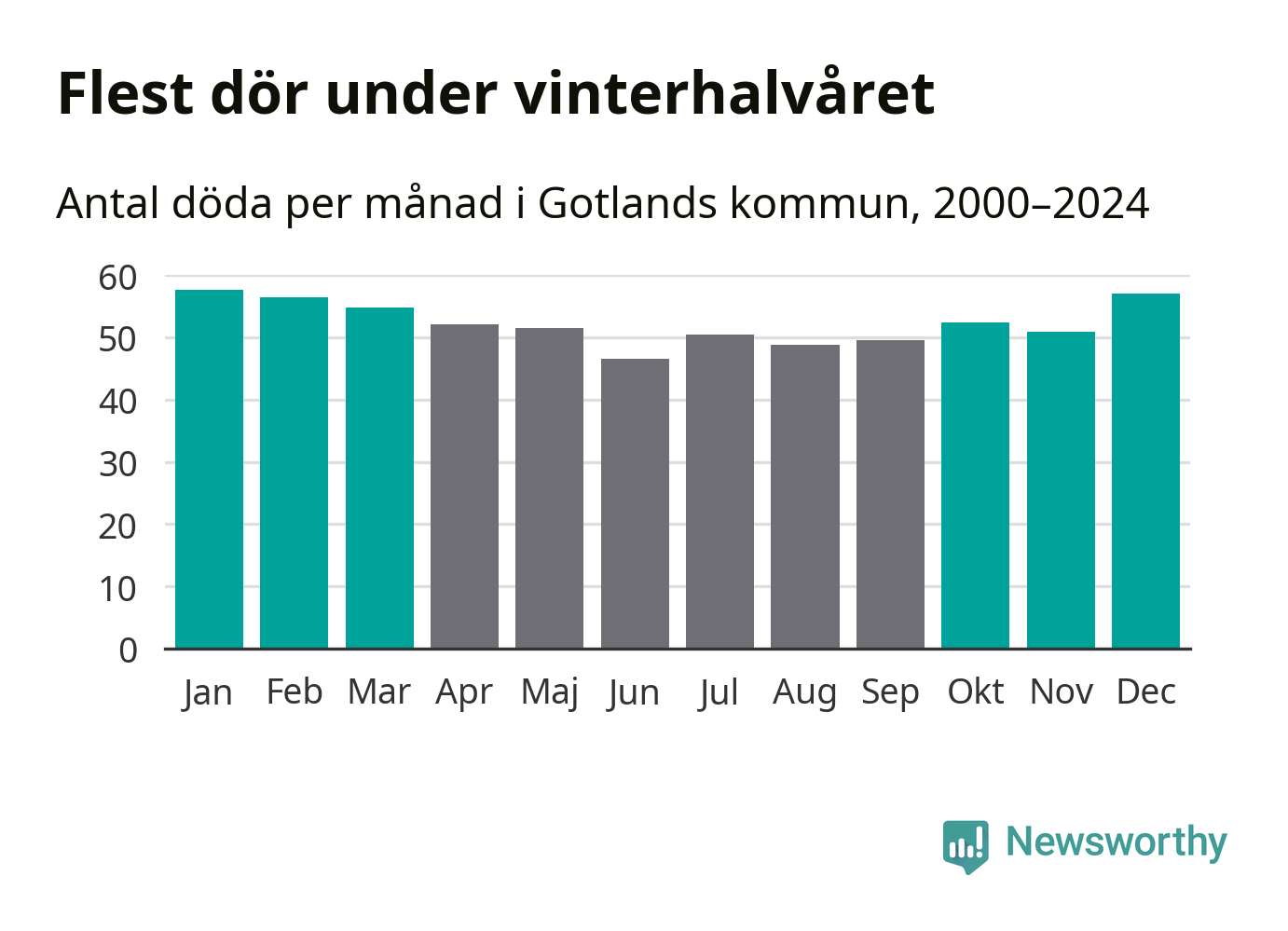 Så är det även på Gotland. Under de senaste 25 åren har 8 116 personer dött i kommunen under vinterhalvåret, jämfört med 7 416 personer under sommarhalvåret – alltså nio procent fler.