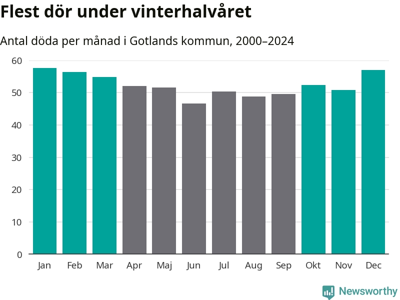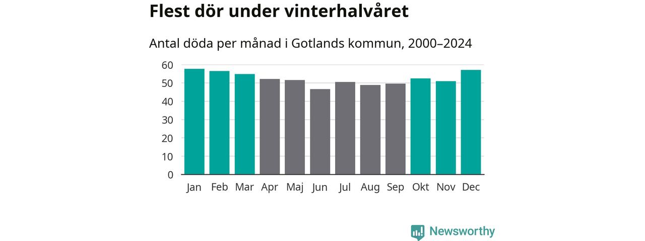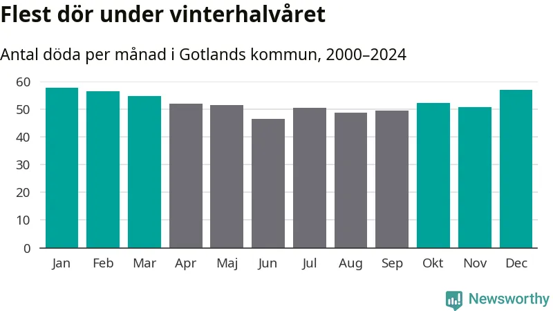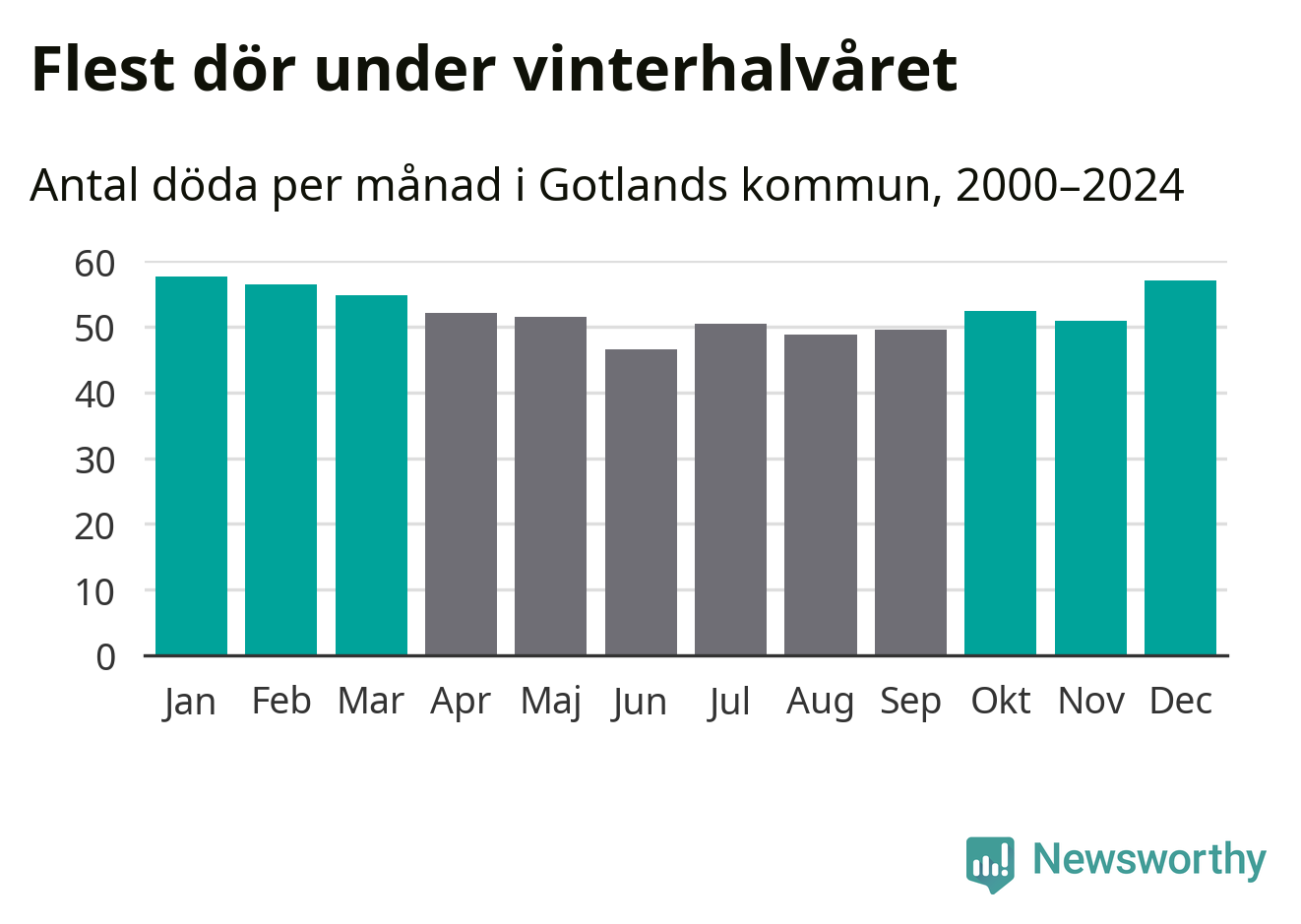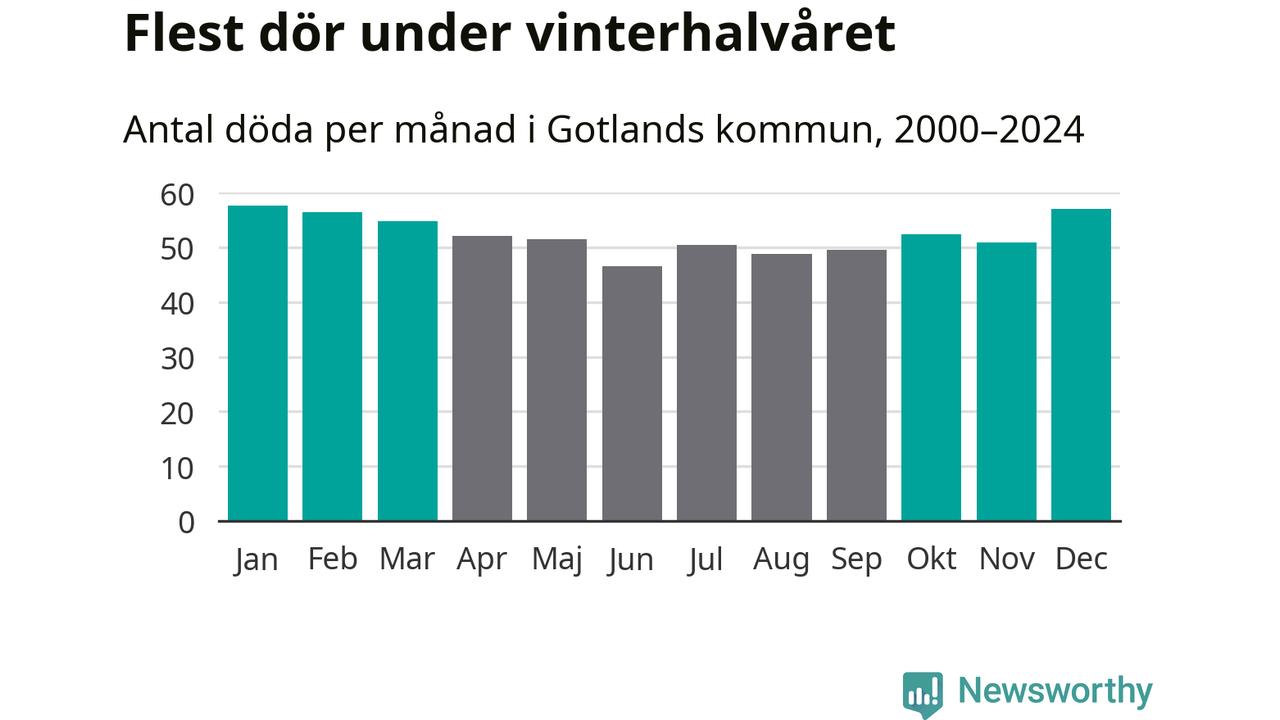 Så är det även på Gotland. Under de senaste 25 åren har 8 116 personer dött i kommunen under vinterhalvåret, jämfört med 7 416 personer under sommarhalvåret – alltså nio procent fler.