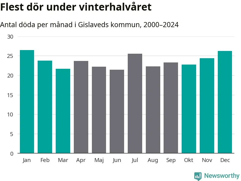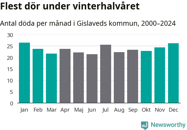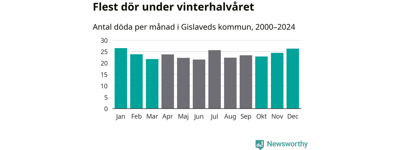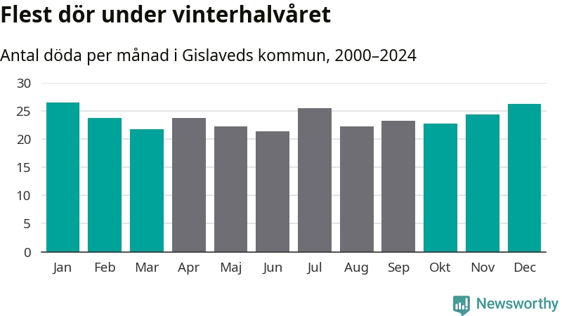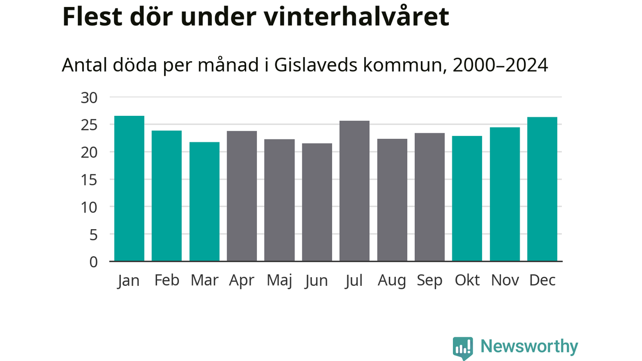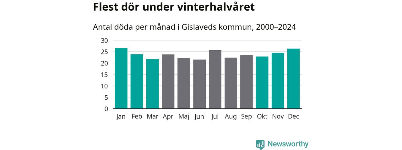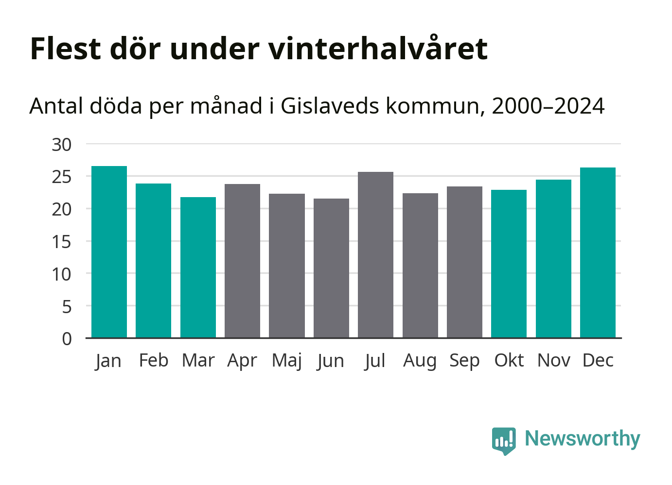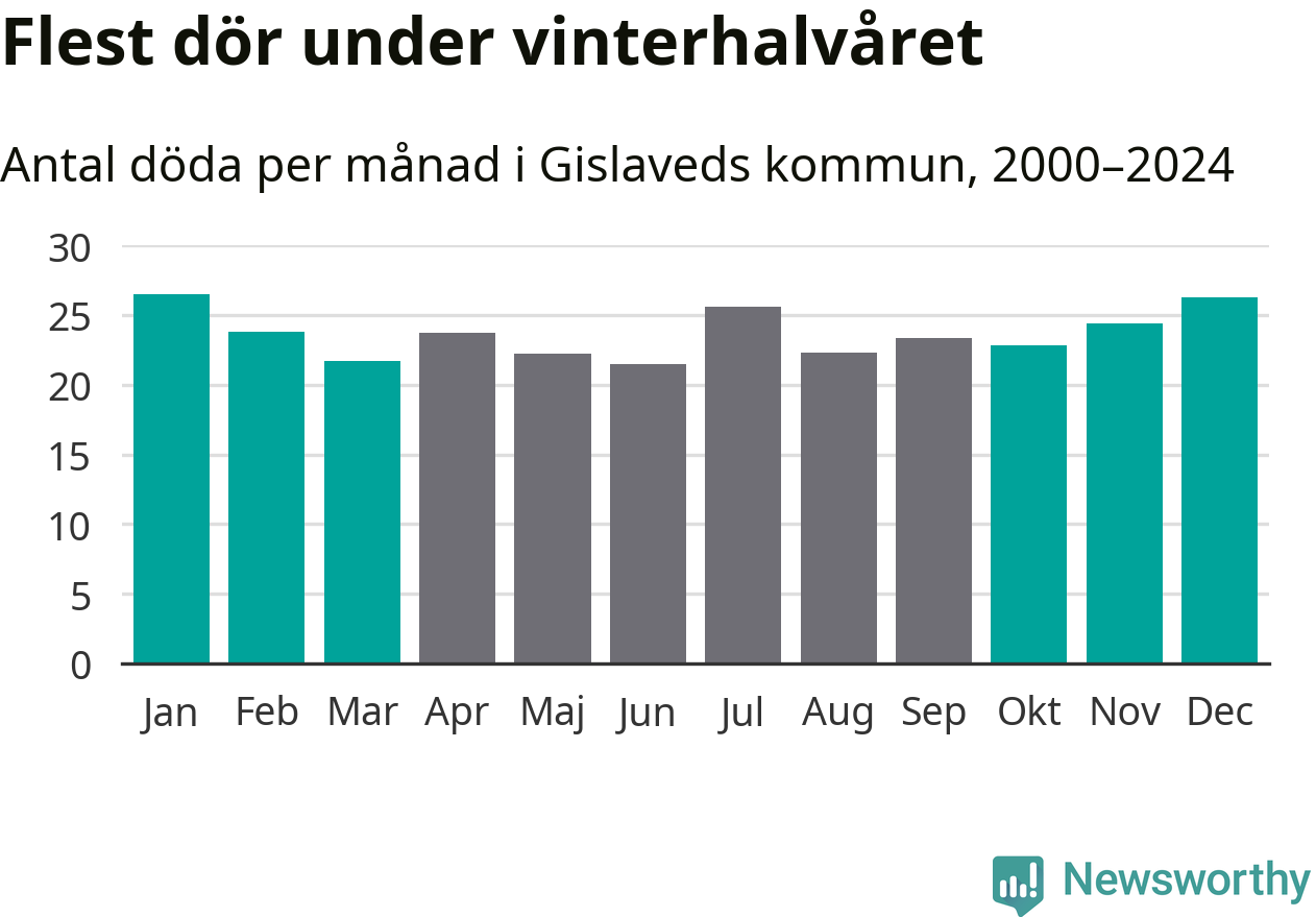 Så är det även i Gislaved. Under de senaste 25 åren har 3 629 personer dött i kommunen under vinterhalvåret, jämfört med 3 391 personer under sommarhalvåret – alltså sju procent fler.