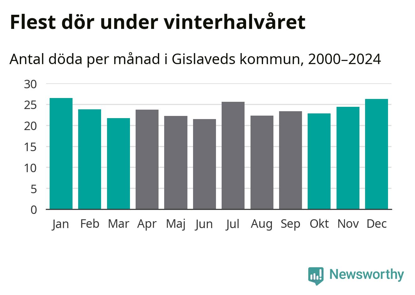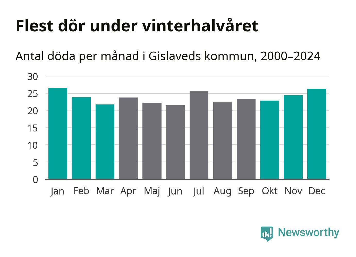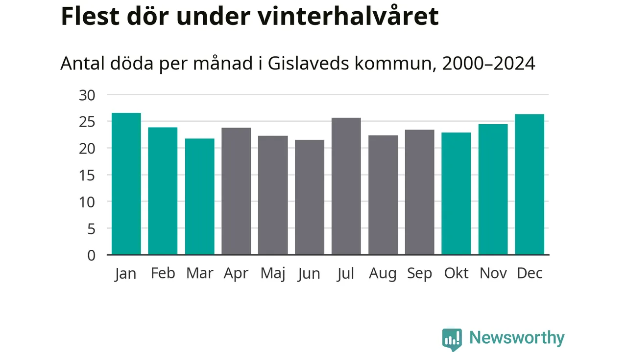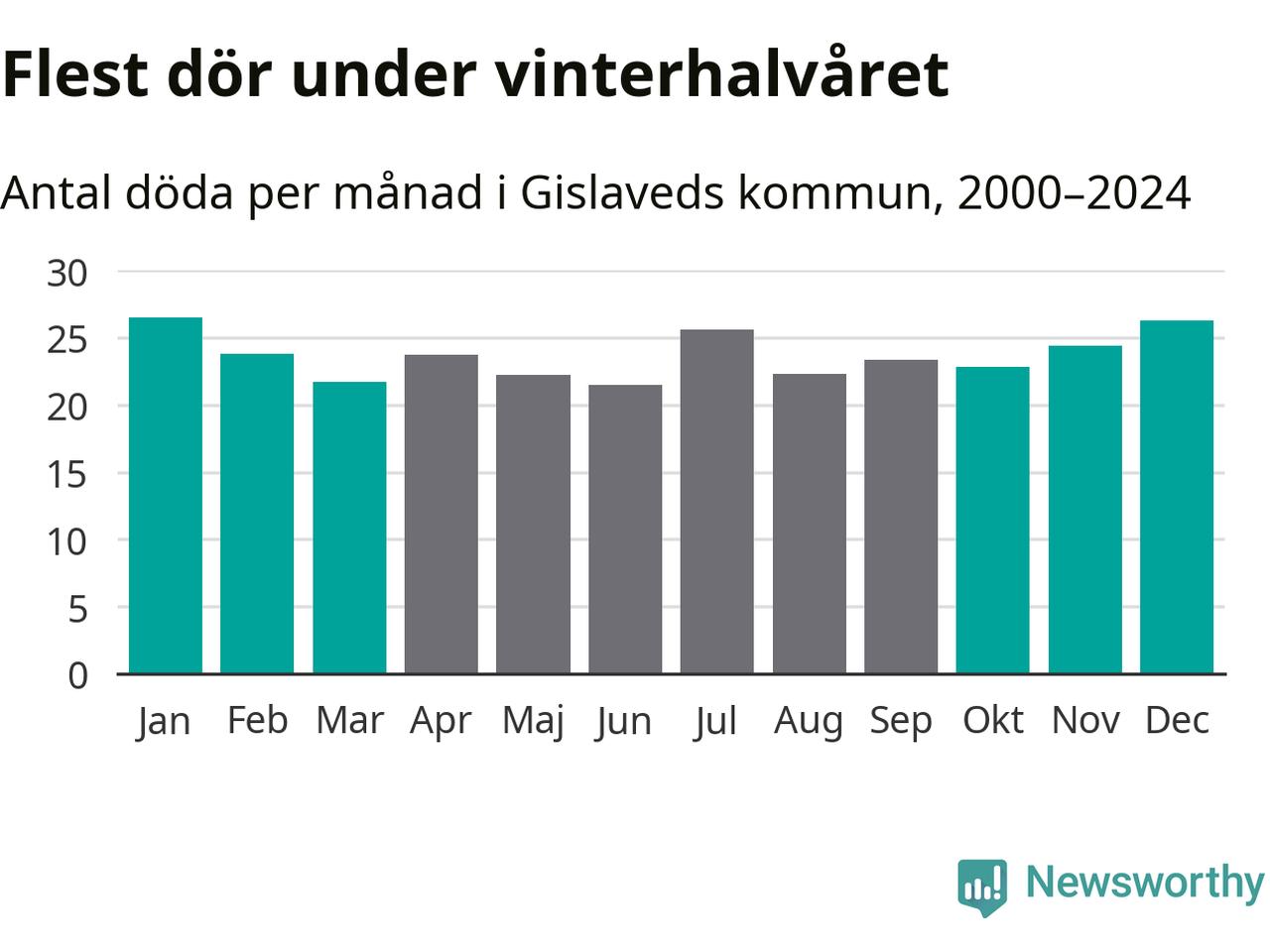 I landet som helhet är det veckorna kring årsskiftet som är de allra dödligaste. I Gislaved har flest istället dött vecka 51. Sammanlagt under de senaste 25 åren handlar det om 160 personer, vilket är 19 procent fler än snittet för resten av året.
