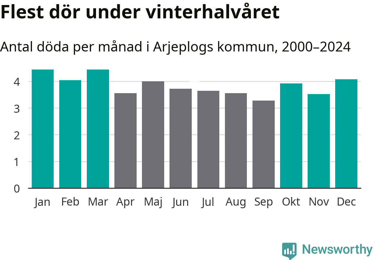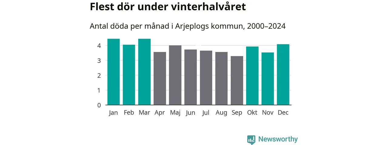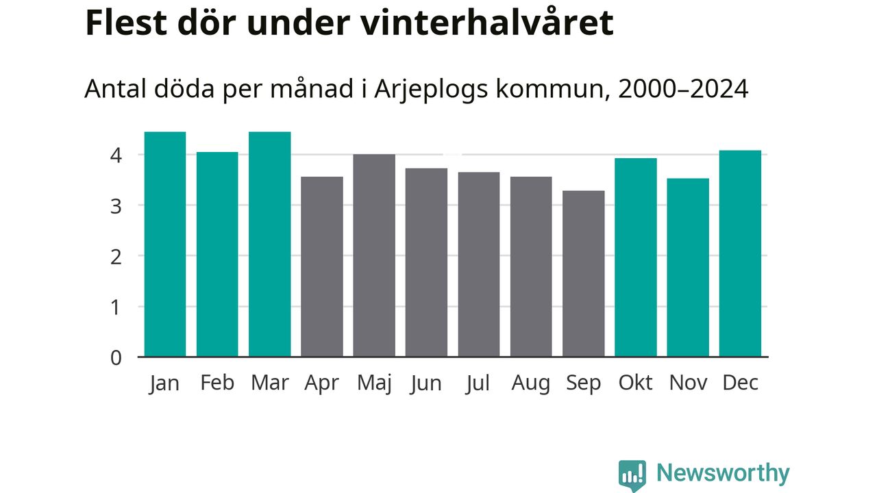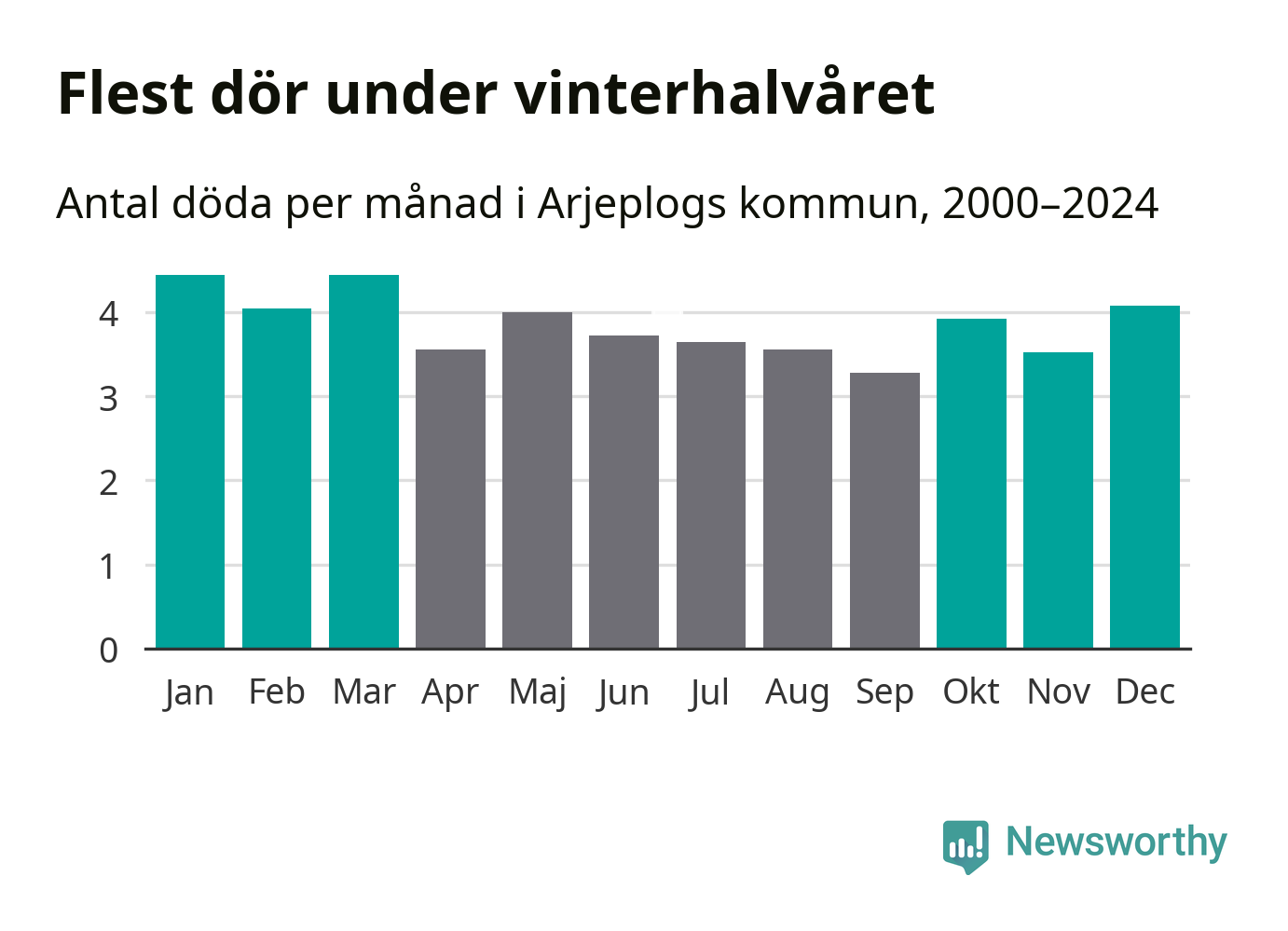 Så är det även i Arjeplog. Under de senaste 25 åren har 596 personer dött i kommunen under vinterhalvåret, jämfört med 548 personer under sommarhalvåret – alltså nio procent fler.
