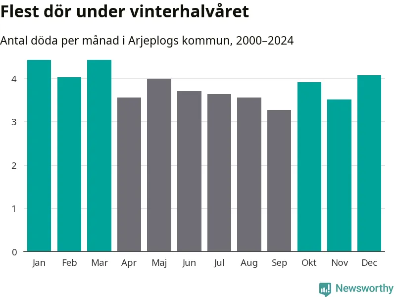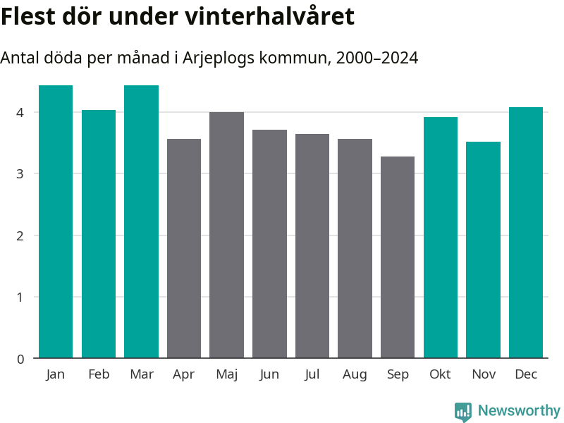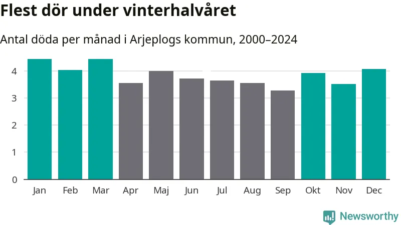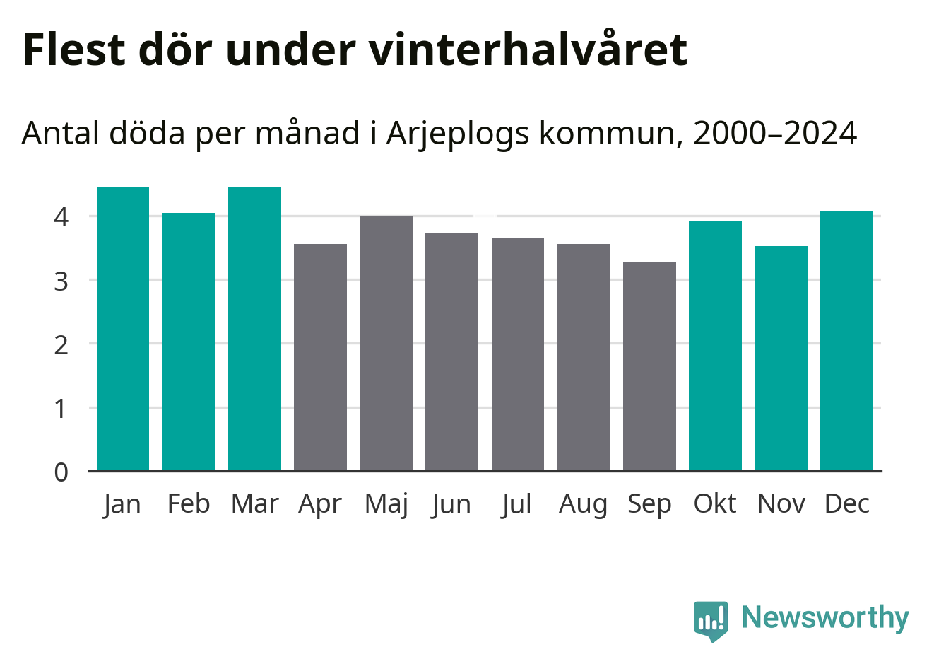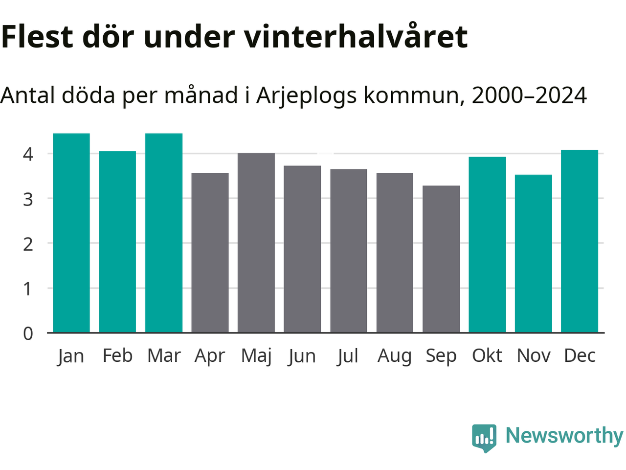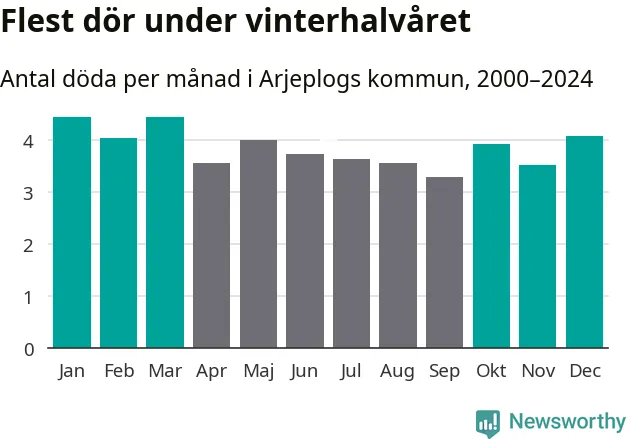 Så är det även i Arjeplog. Under de senaste 25 åren har 596 personer dött i kommunen under vinterhalvåret, jämfört med 548 personer under sommarhalvåret – alltså nio procent fler.