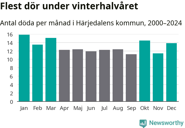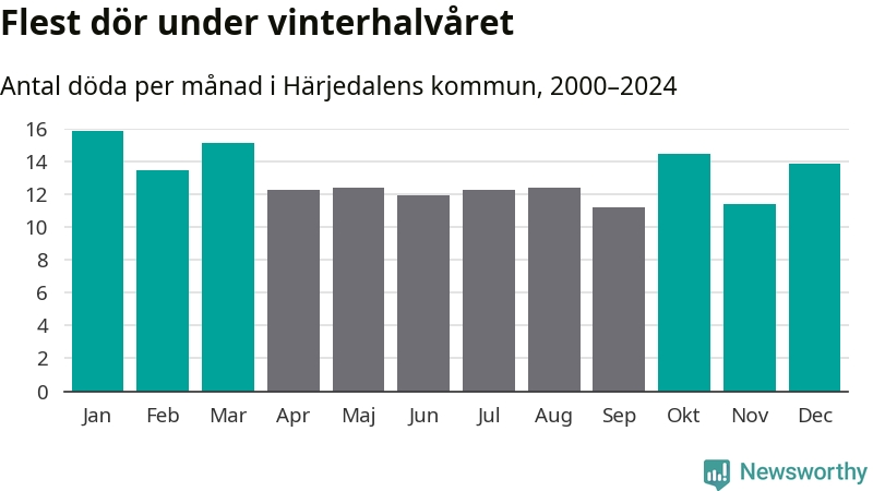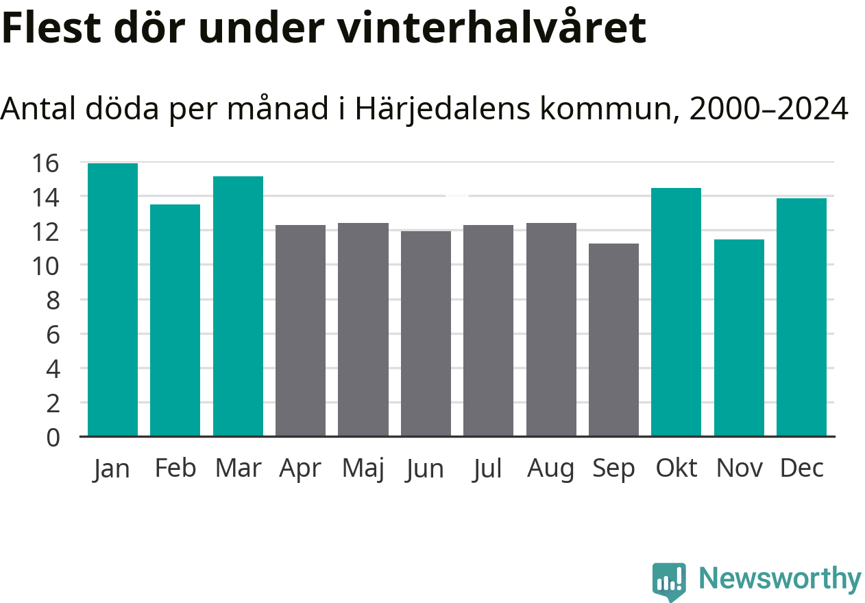 Så är det även i Härjedalen. Under de senaste 25 åren har 2 036 personer dött i kommunen under vinterhalvåret, jämfört med 1 854 personer under sommarhalvåret – alltså tio procent fler.