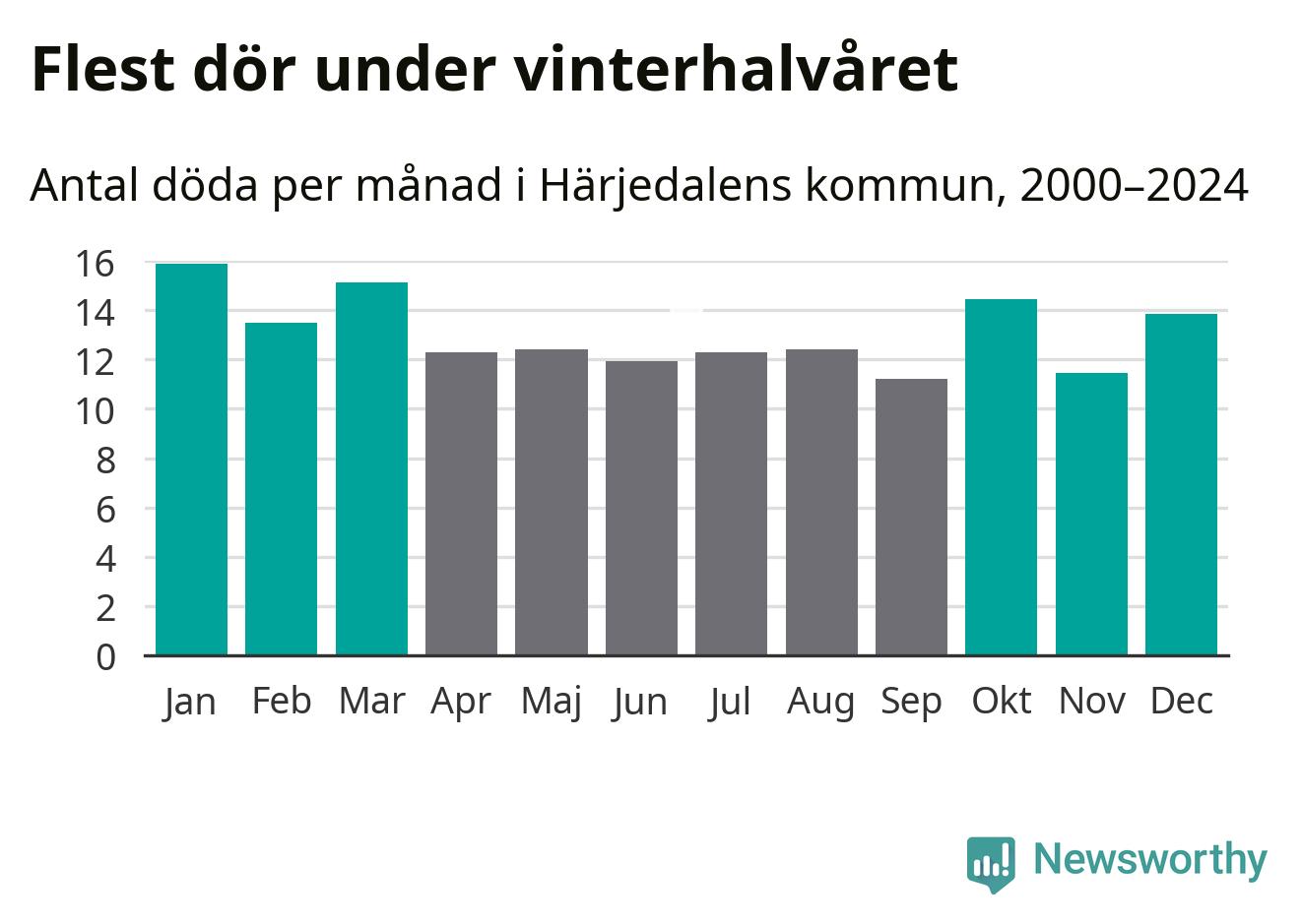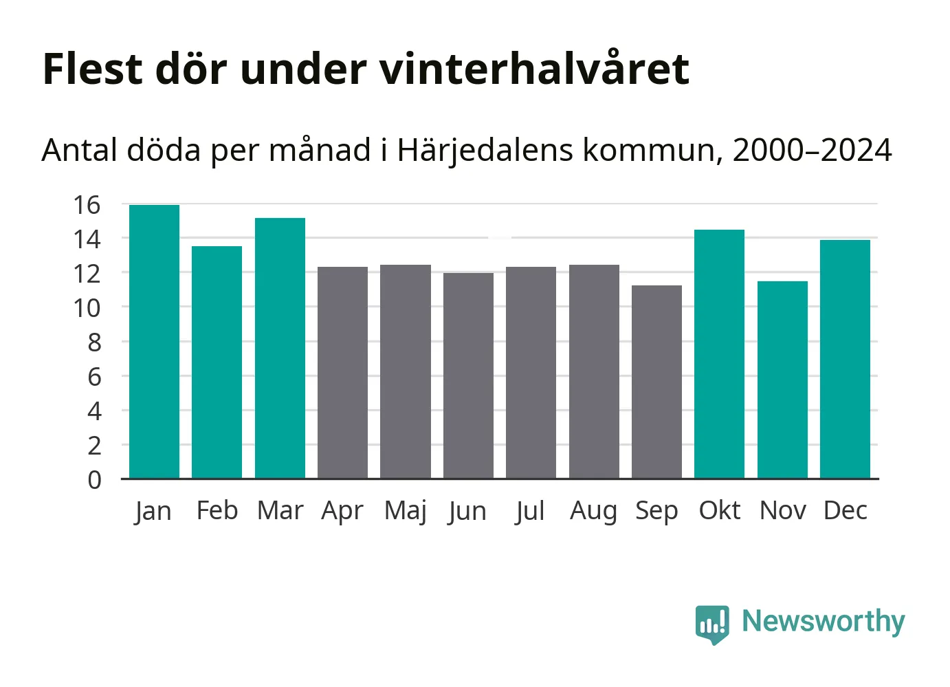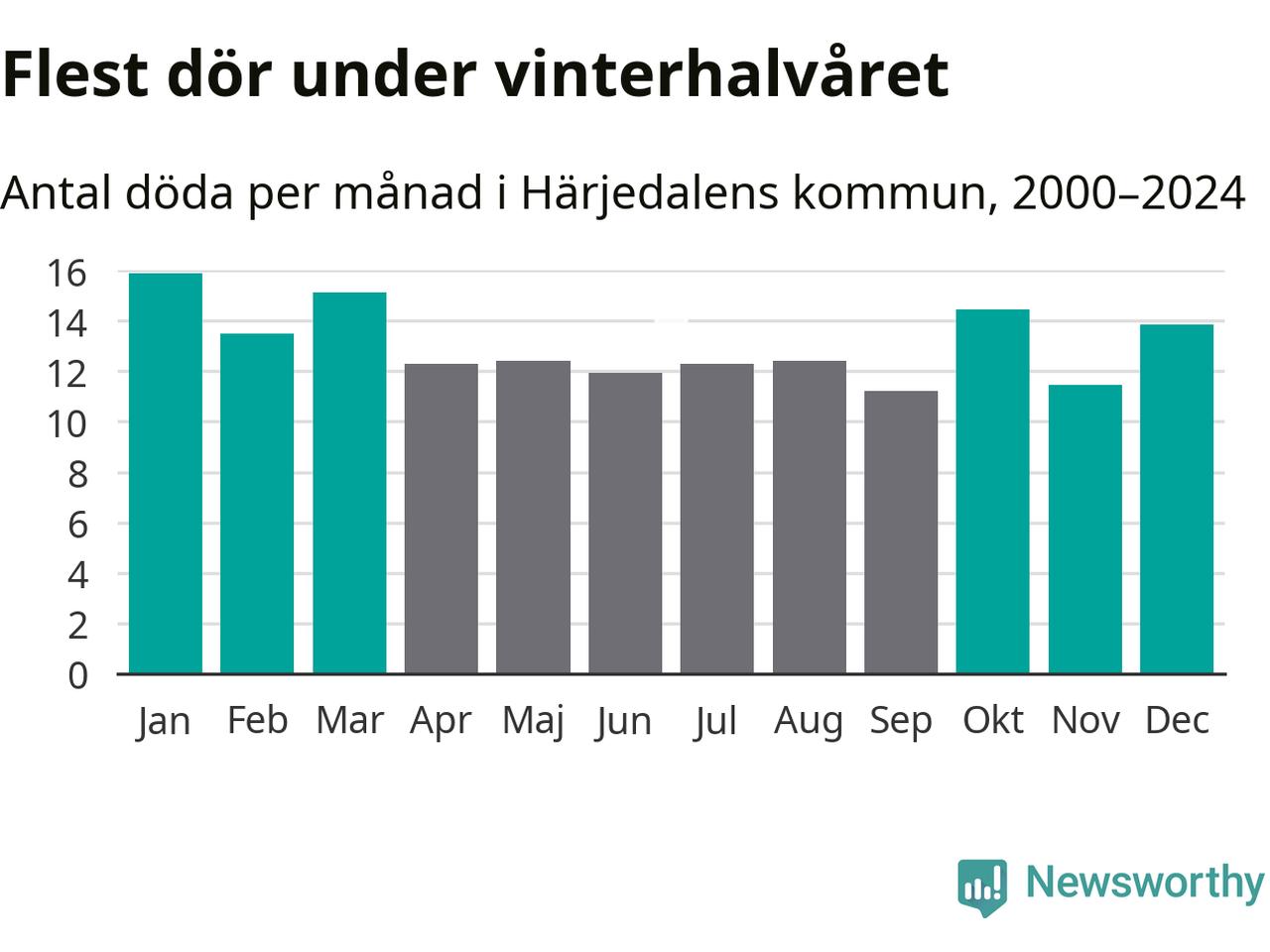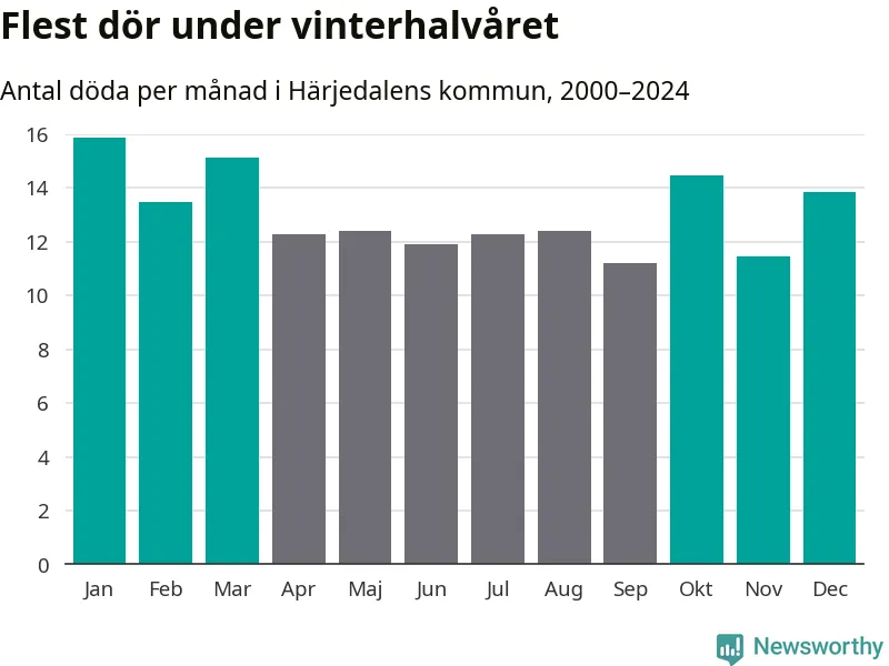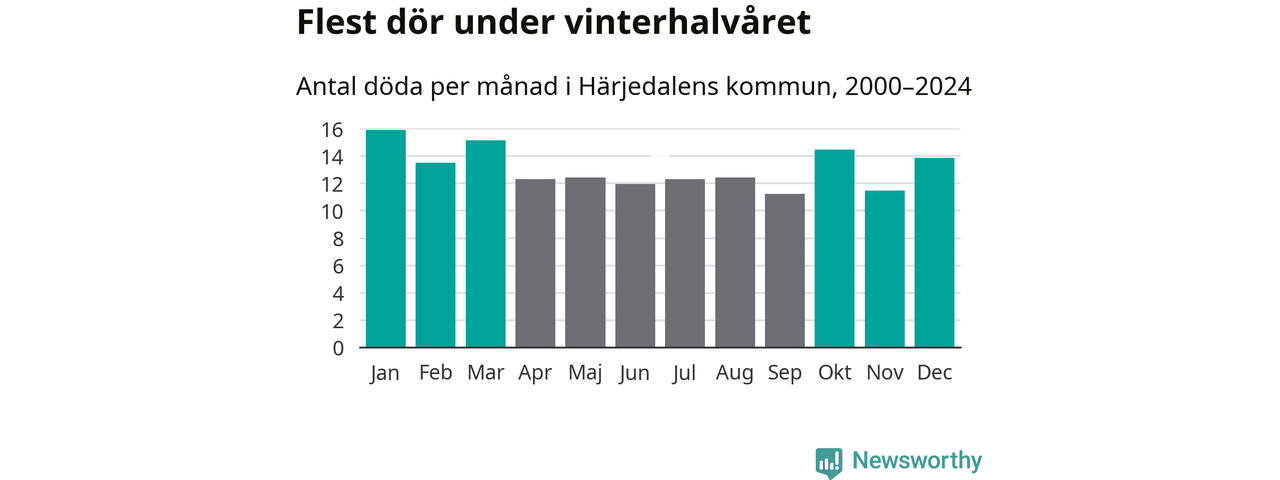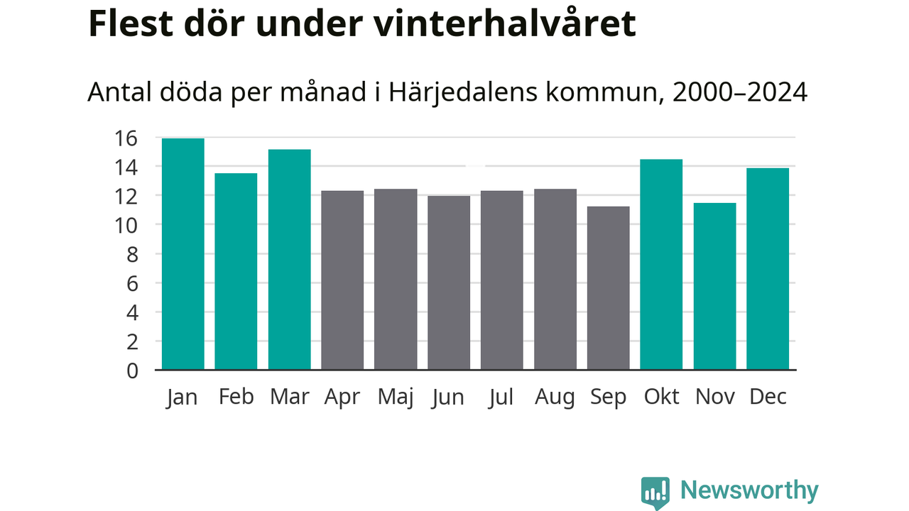 I landet som helhet är det veckorna kring årsskiftet som är de allra dödligaste. I Härjedalen har flest istället dött vecka 43. Sammanlagt under de senaste 25 åren handlar det om 100 personer, vilket är 34 procent fler än snittet för resten av året.