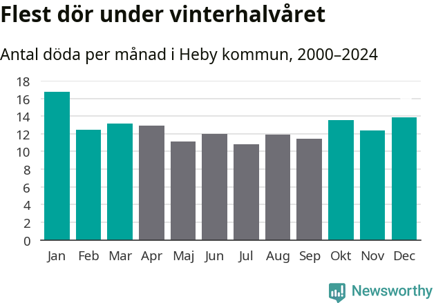 Så är det även i Heby. Under de senaste 25 åren har 2 005 personer dött i kommunen under vinterhalvåret, jämfört med 1 728 personer under sommarhalvåret – alltså 16 procent fler.