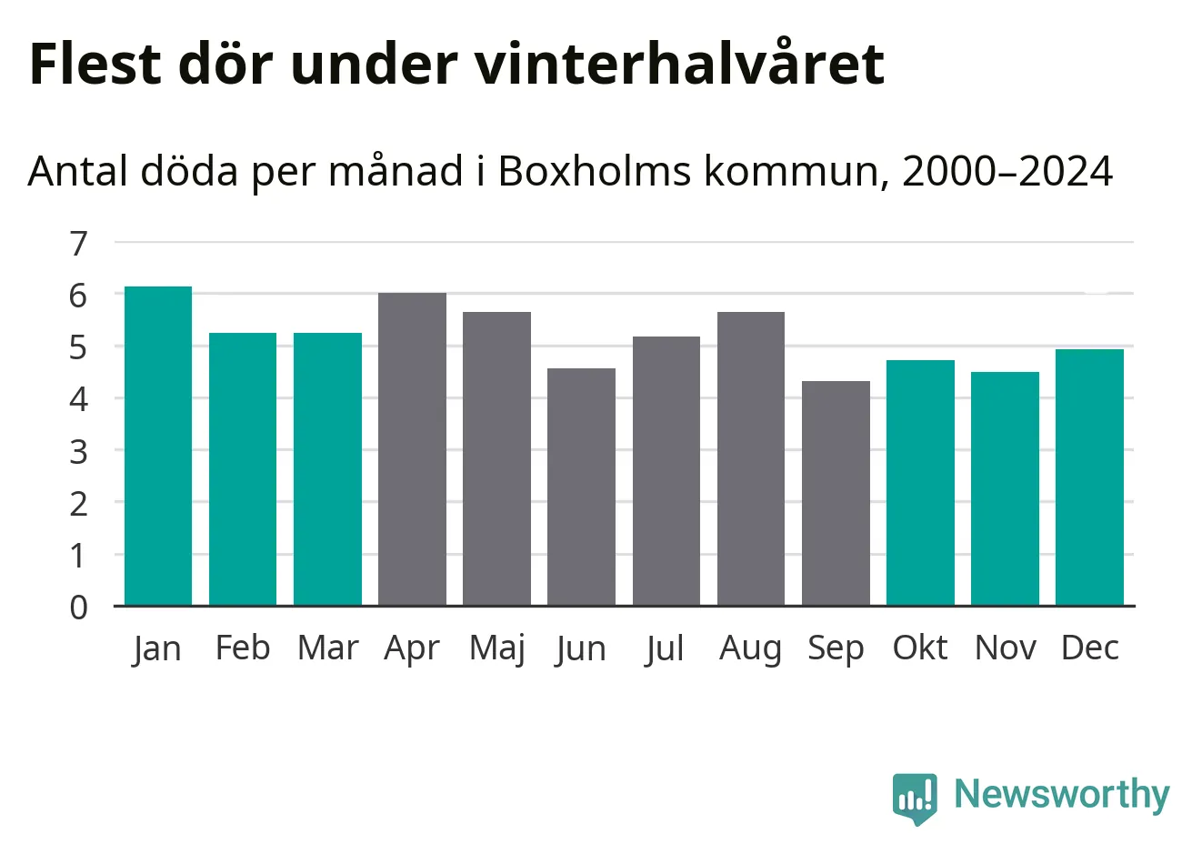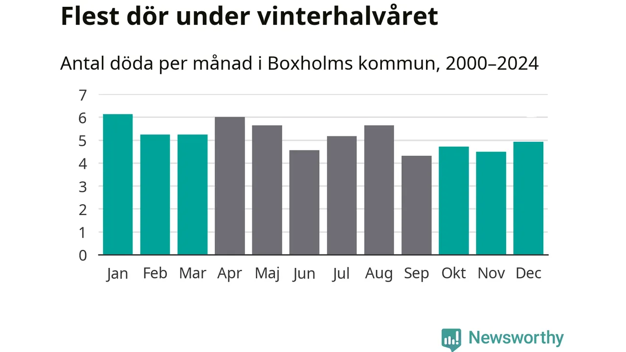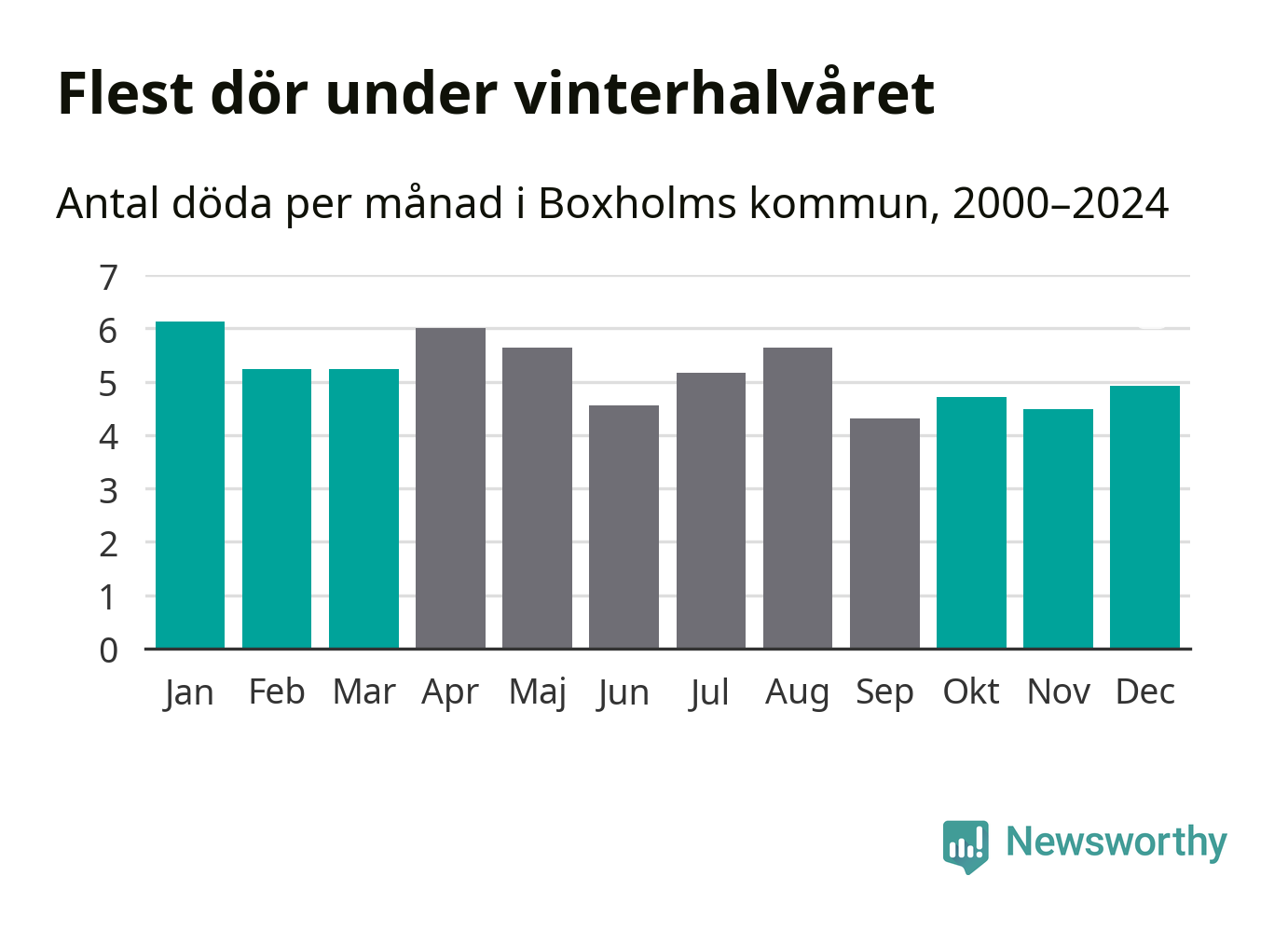 Så är det även i Boxholm. Under de senaste 25 åren har 793 personer dött i kommunen under vinterhalvåret, jämfört med 735 personer under sommarhalvåret – alltså åtta procent fler.
