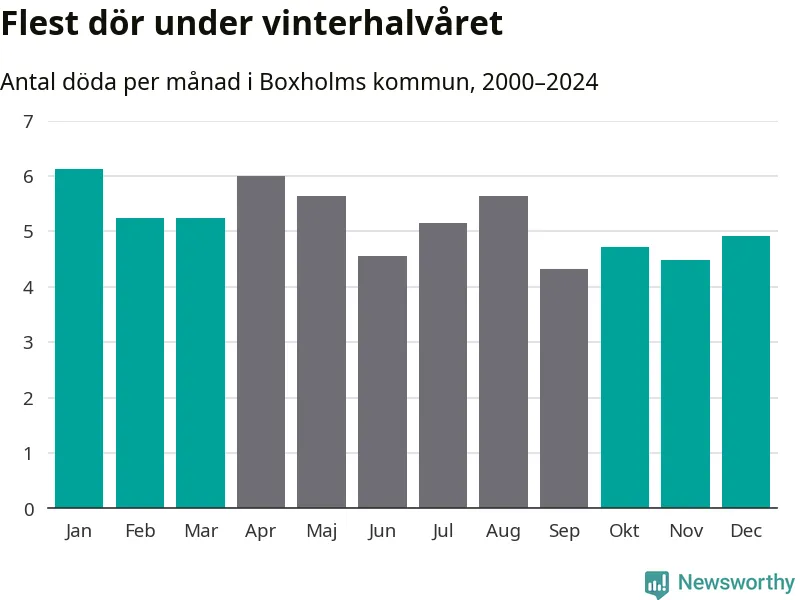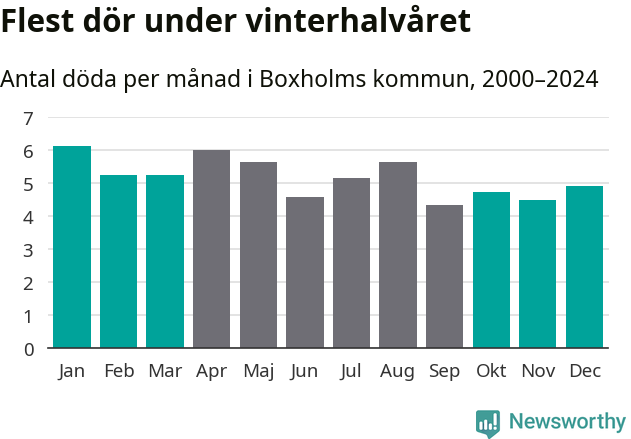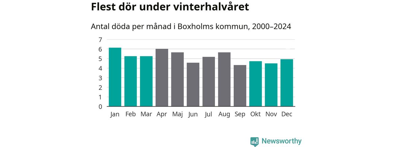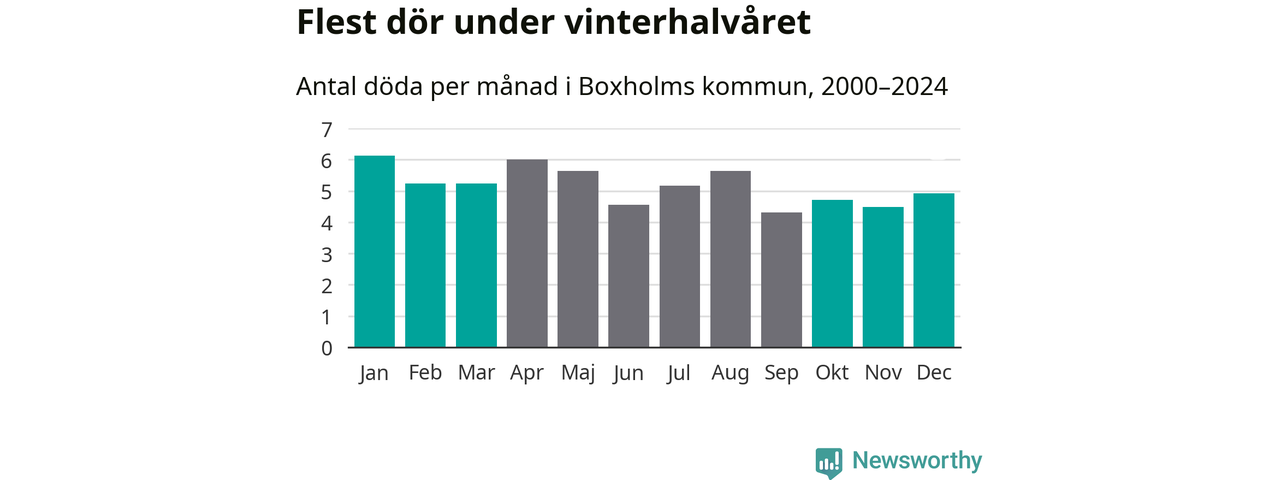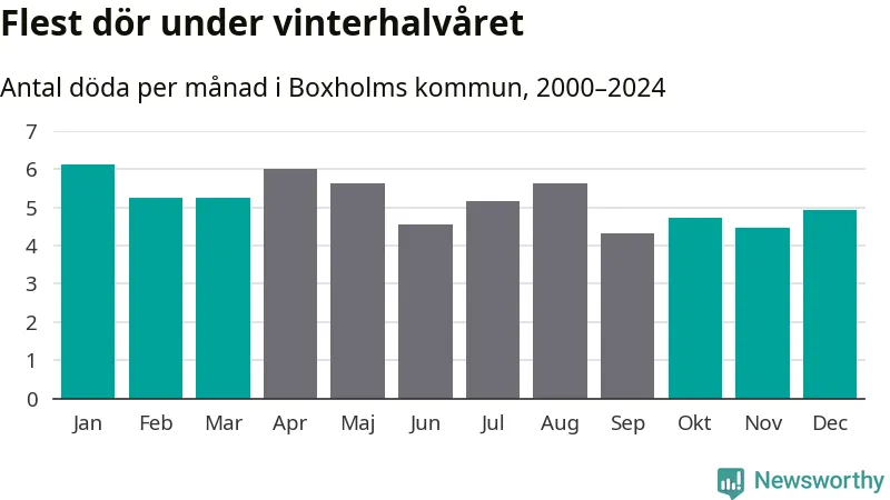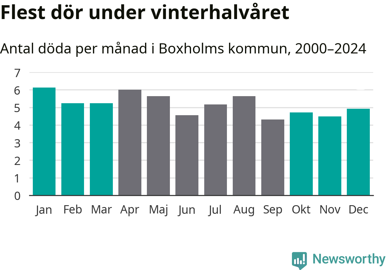 Så är det även i Boxholm. Under de senaste 25 åren har 793 personer dött i kommunen under vinterhalvåret, jämfört med 735 personer under sommarhalvåret – alltså åtta procent fler.