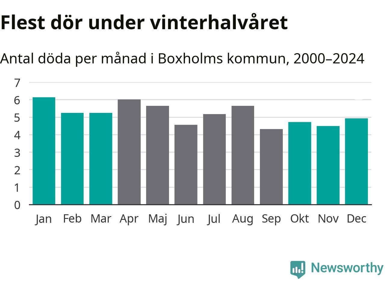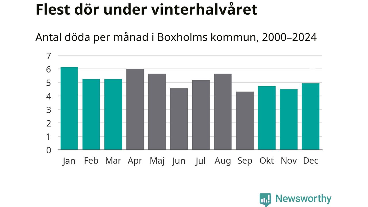 I landet som helhet är det veckorna kring årsskiftet som är de allra dödligaste. I Boxholm har flest istället dött vecka 15. Sammanlagt under de senaste 25 åren handlar det om 45 personer, vilket är 53 procent fler än snittet för resten av året.